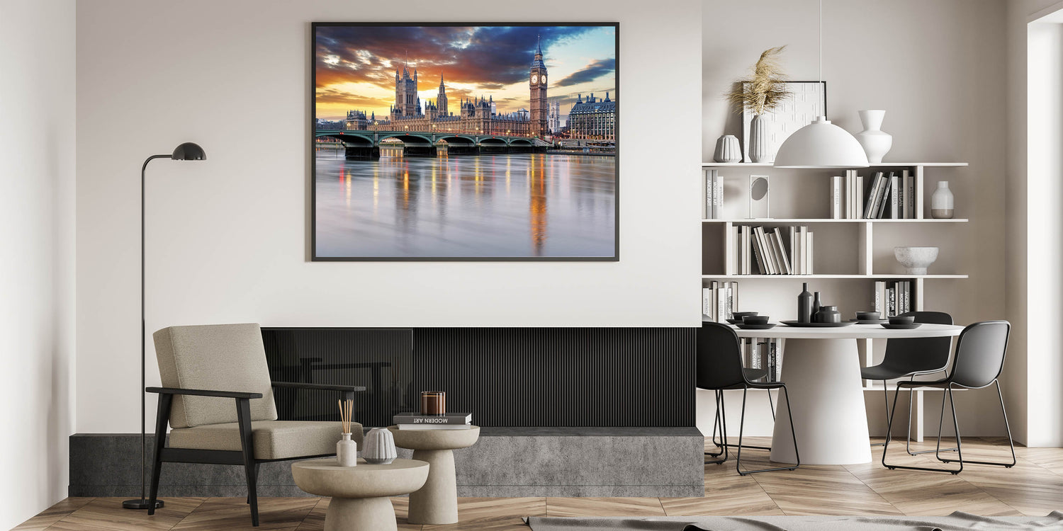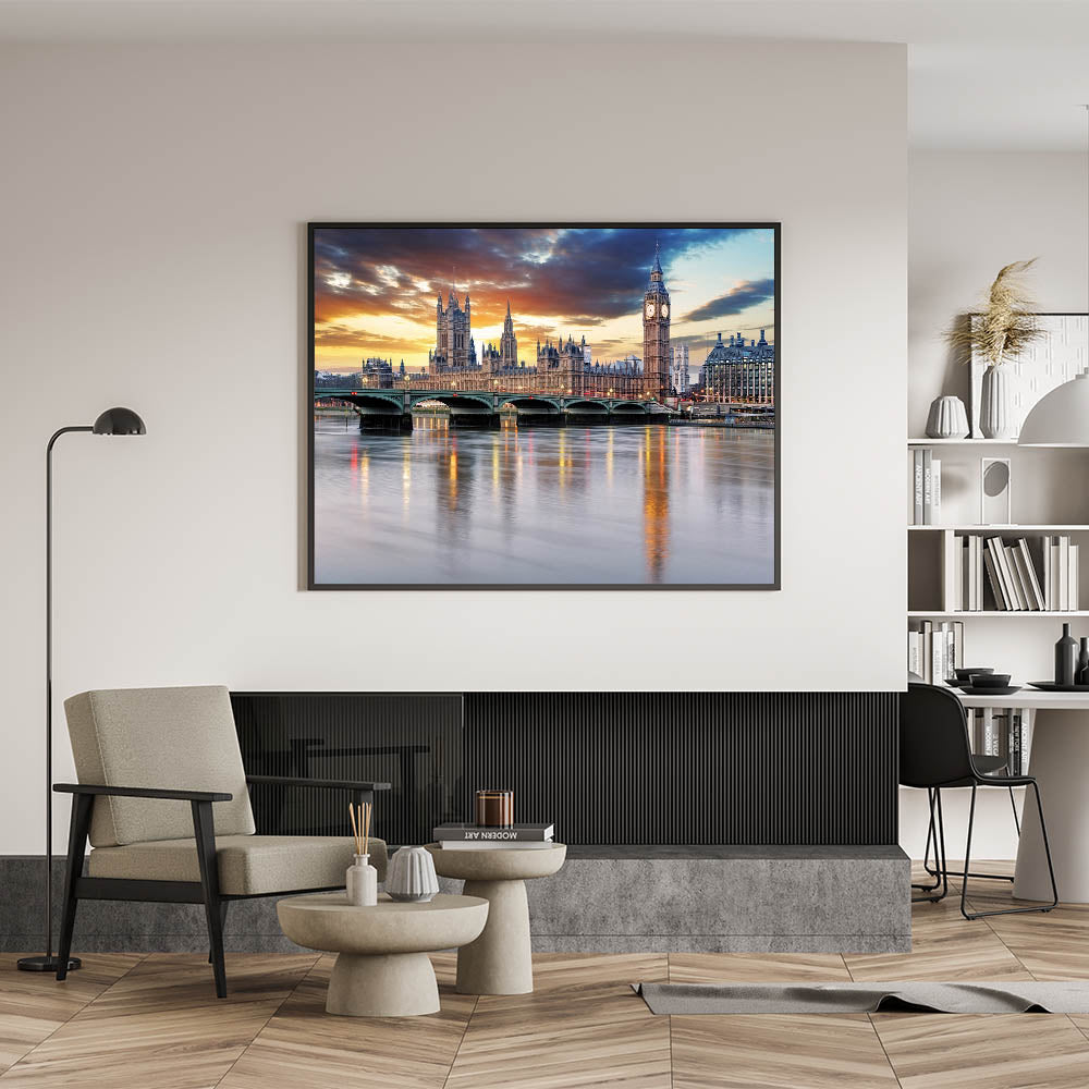 Whether you’re looking for contemporary London art or decorative London posters, this artwork will elevate your decor with its stunning reflection and captivating sunset colors. It’s a versatile piece that works beautifully in living rooms, bedrooms, or offices, making it an excellent choice for any London-themed wall decor.