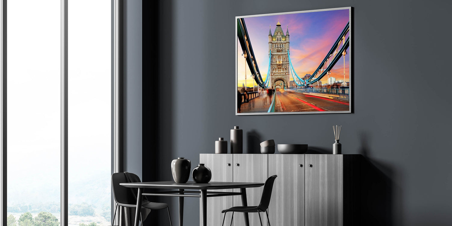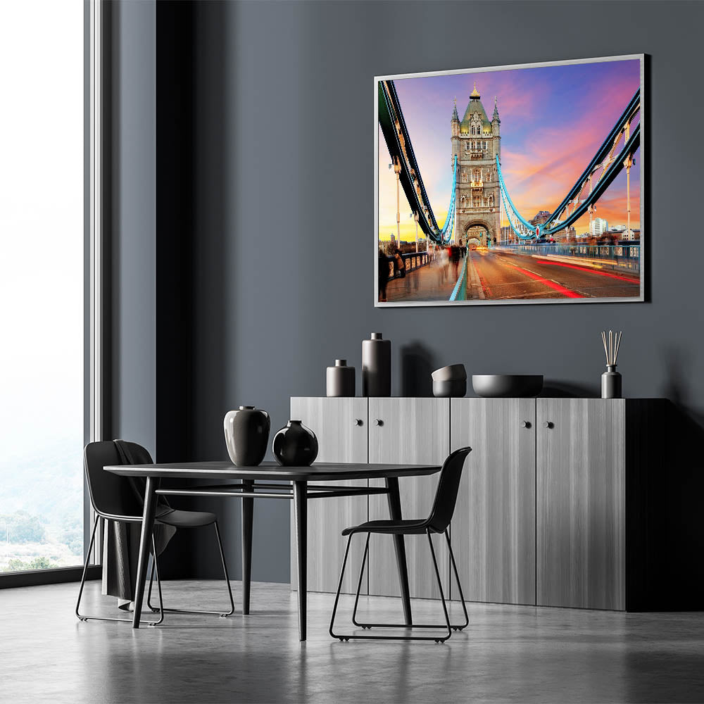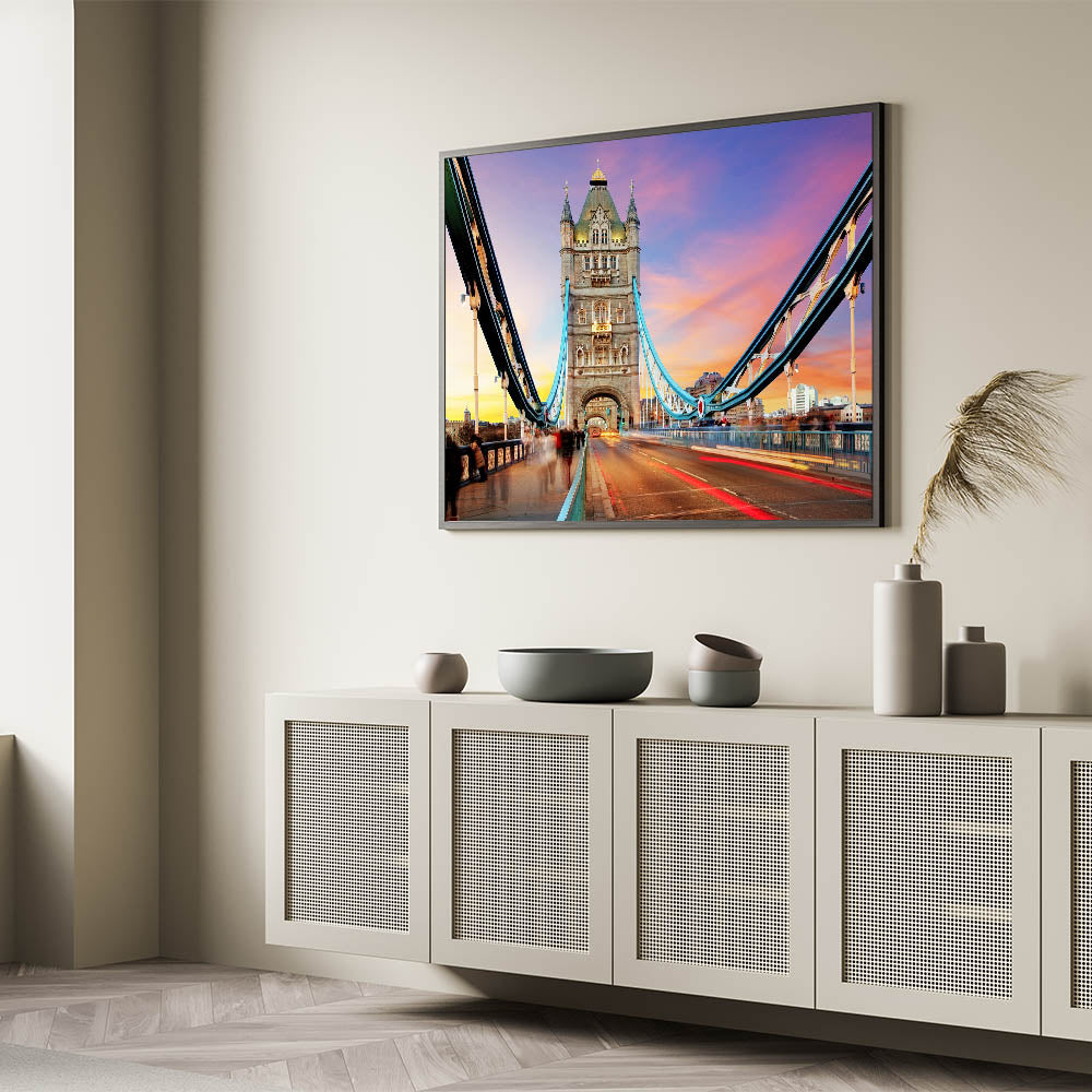 Experience the magic of London’s iconic Tower Bridge at sunset with this breathtaking artwork. The warm hues of the setting sun create a stunning contrast against the cool tones of the bridge, while the dynamic movement of the people and vehicles brings the scene to life. This piece of London photography art captures the essence of the city, blending historic beauty with modern vibrancy.
