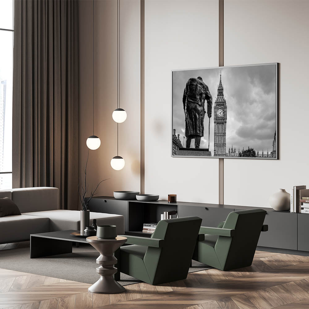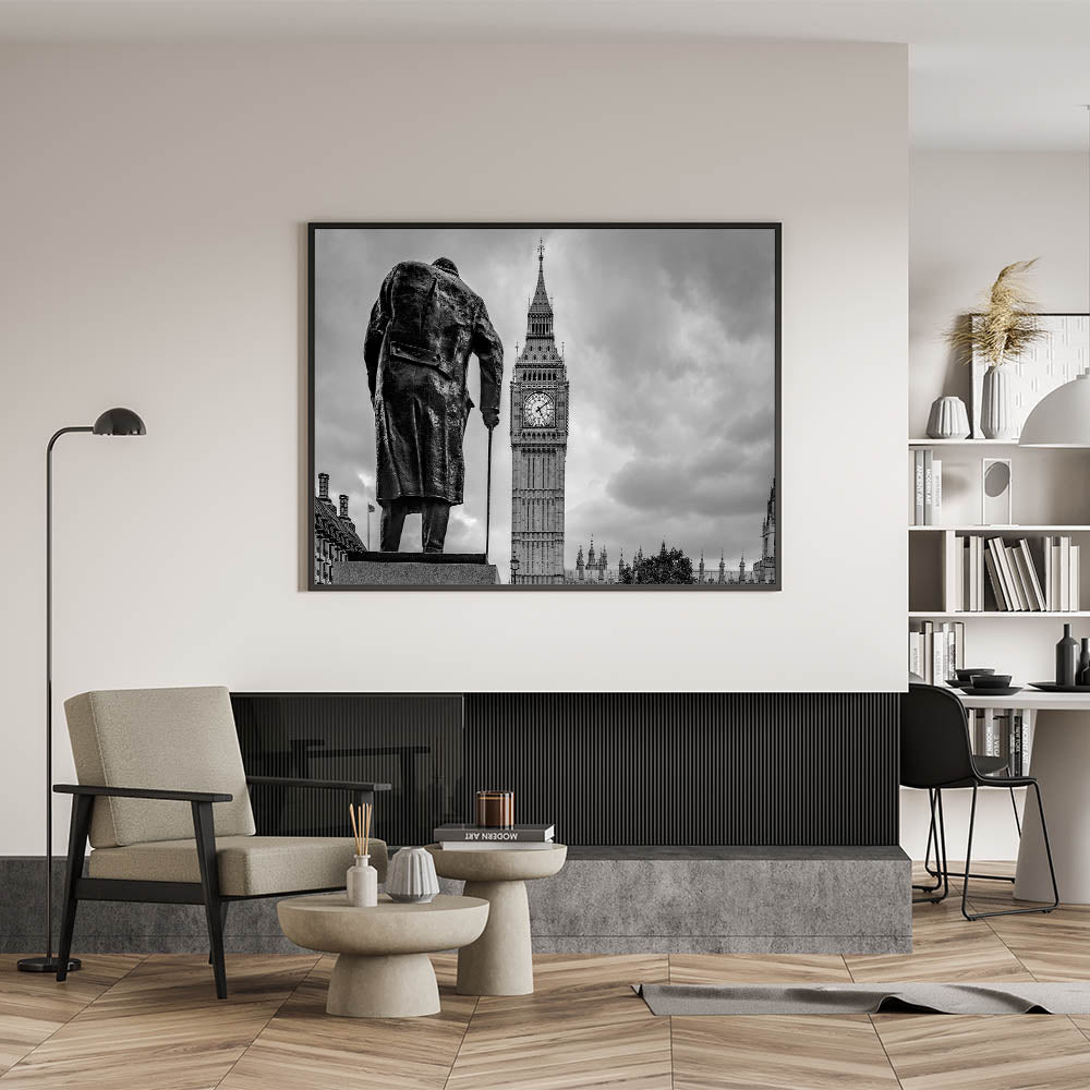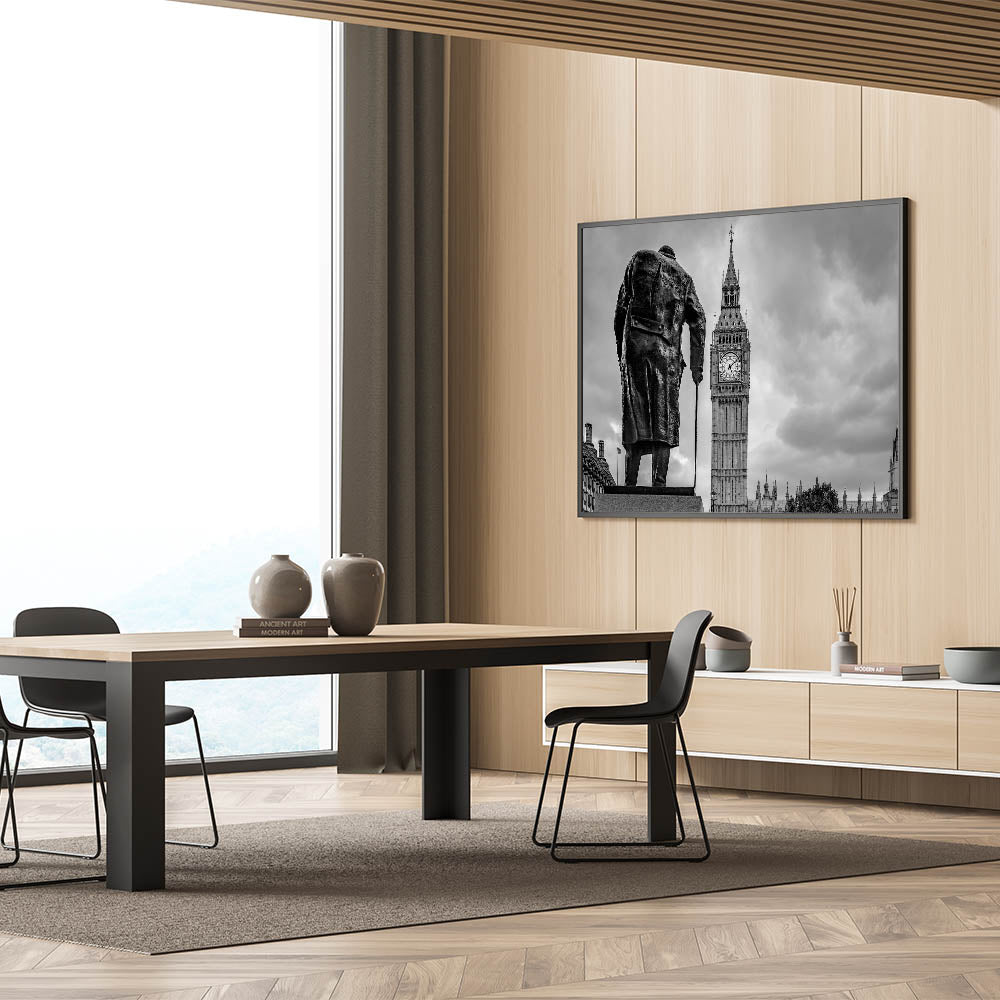 This captivating London photography art features a striking black and white image of Winston Churchill’s statue standing resolutely in front of the iconic Big Ben. The artwork beautifully captures the essence of London's rich history and its prominent landmarks, blending heritage and architectural grandeur in one frame. The contrast between the dark silhouette of Churchill and the towering clock tower creates a dramatic visual effect, making this piece a perfect addition to any home or office.