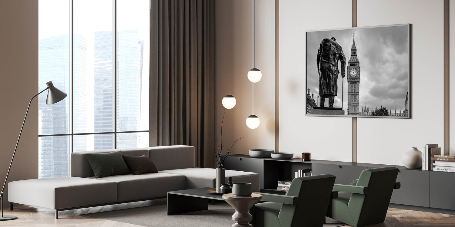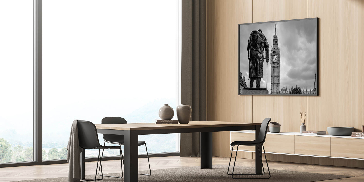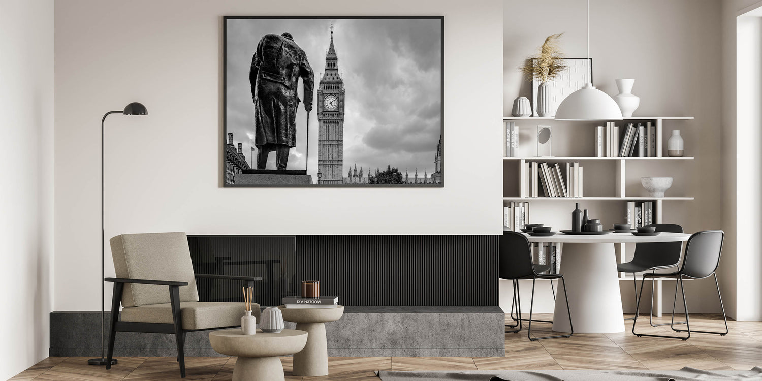 This captivating London photography art features a striking black and white image of Winston Churchill’s statue standing resolutely in front of the iconic Big Ben. The artwork beautifully captures the essence of London's rich history and its prominent landmarks, blending heritage and architectural grandeur in one frame. The contrast between the dark silhouette of Churchill and the towering clock tower creates a dramatic visual effect, making this piece a perfect addition to any home or office.