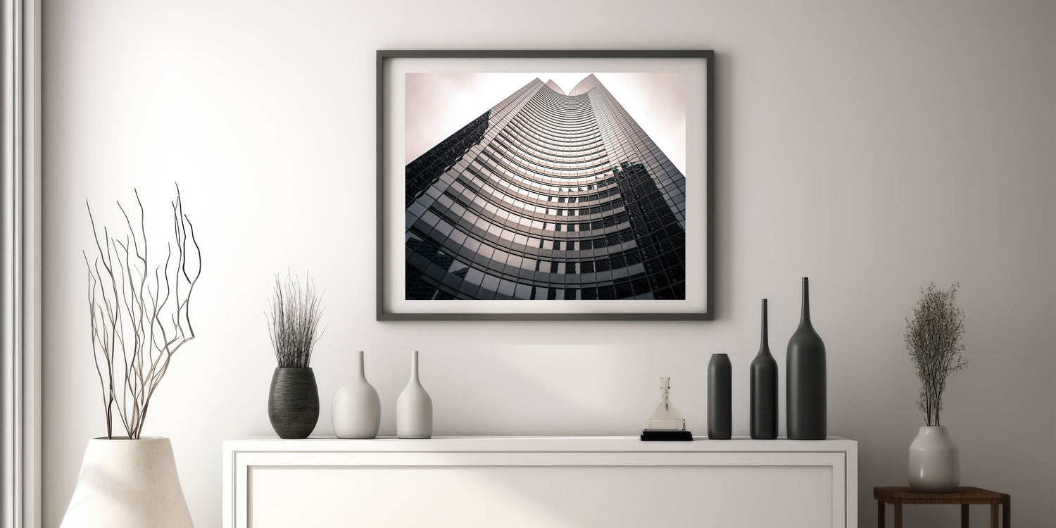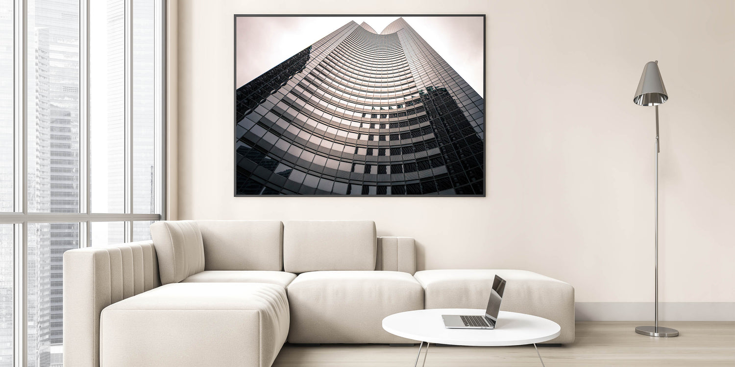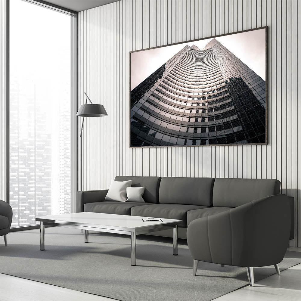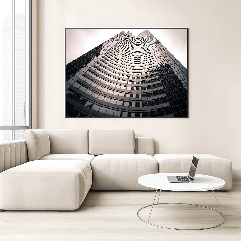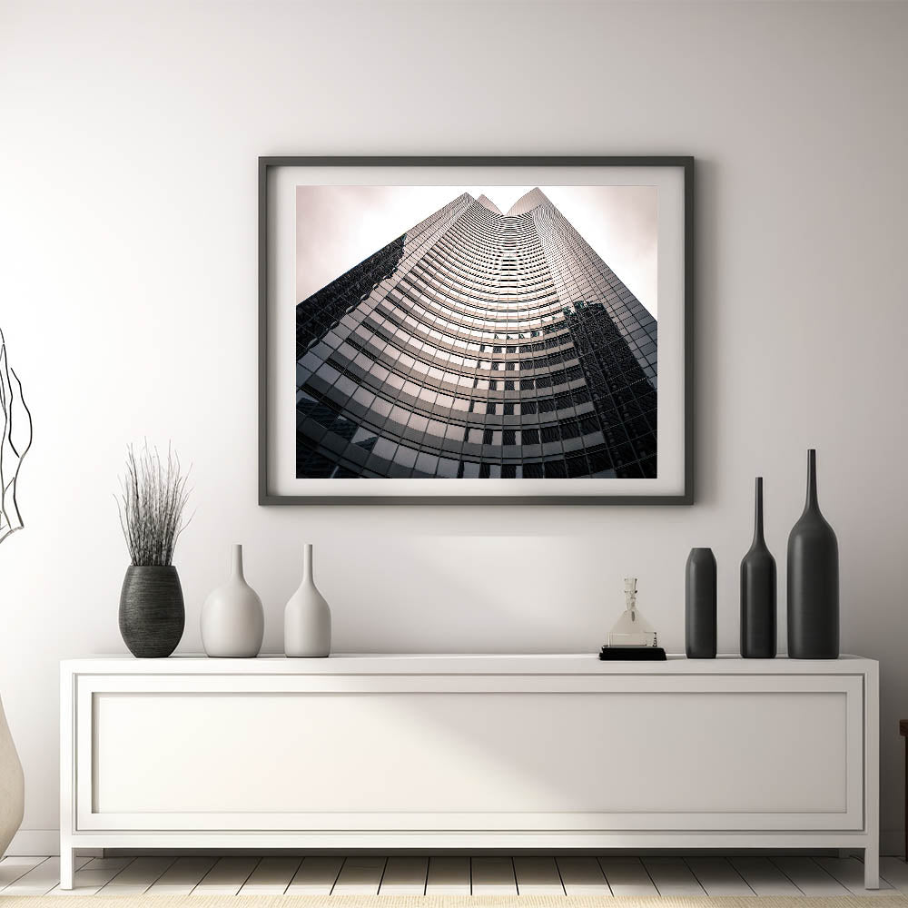 This captivating London skyline art features a stunning upward view of a modern skyscraper, its glass facade reflecting the sleek architectural lines of the surrounding cityscape. The unique angle and reflective surfaces create a sense of grandeur and modern elegance, making this artwork an ideal choice for fans of contemporary London decor and urban photography. The clean lines and abstract patterns bring a minimalist and sophisticated touch to any space.