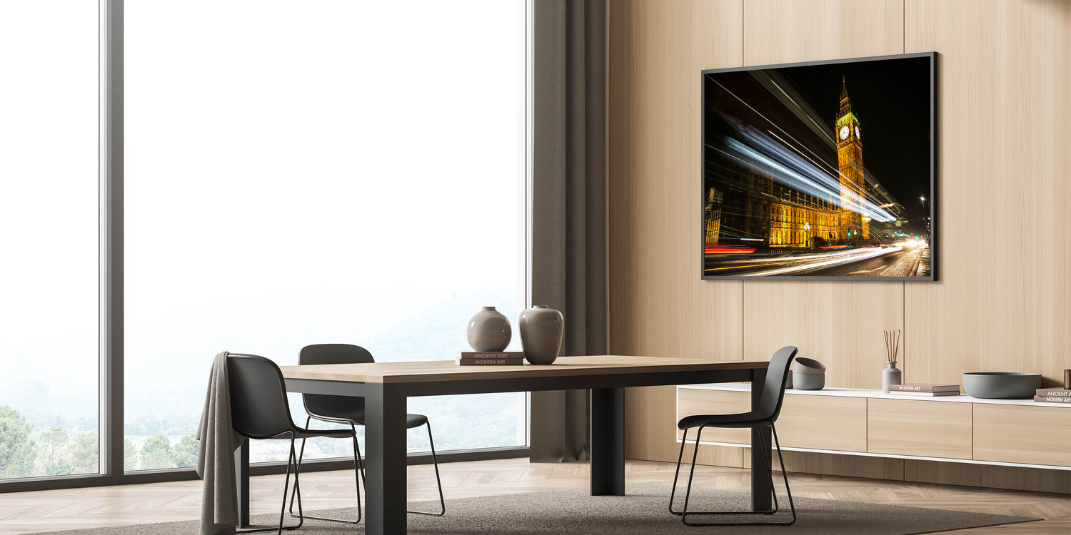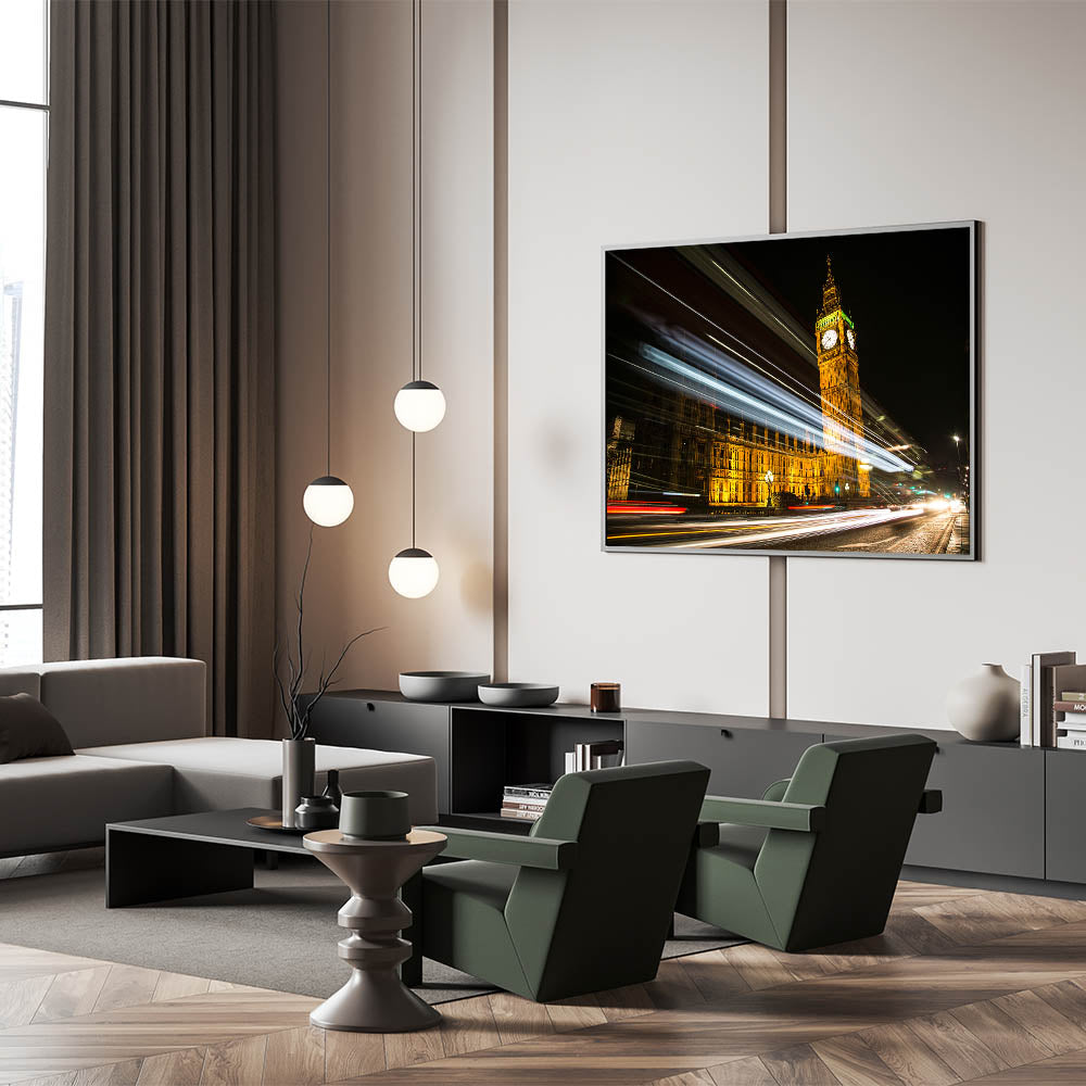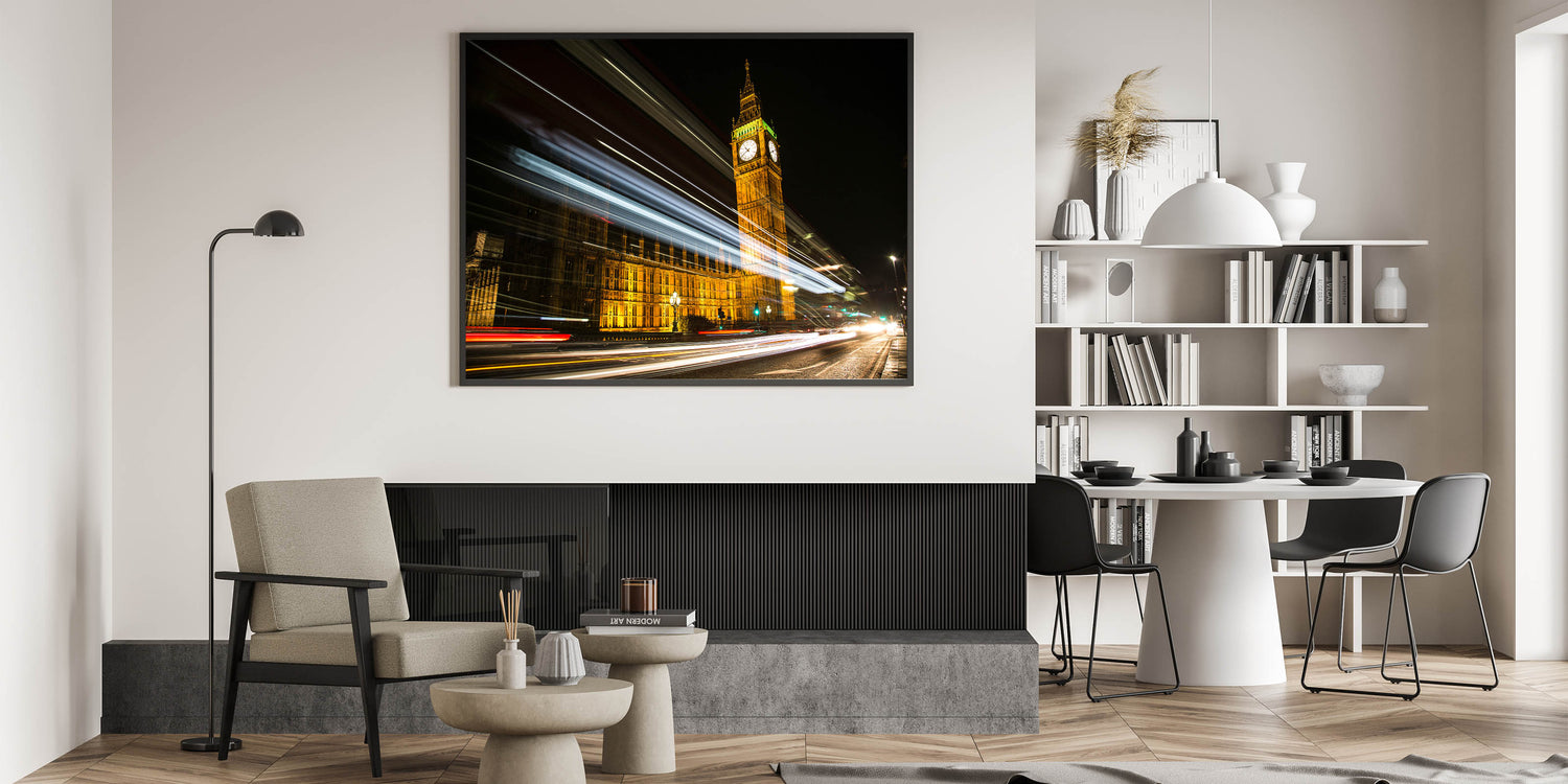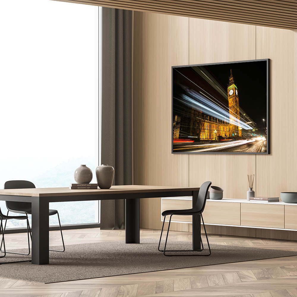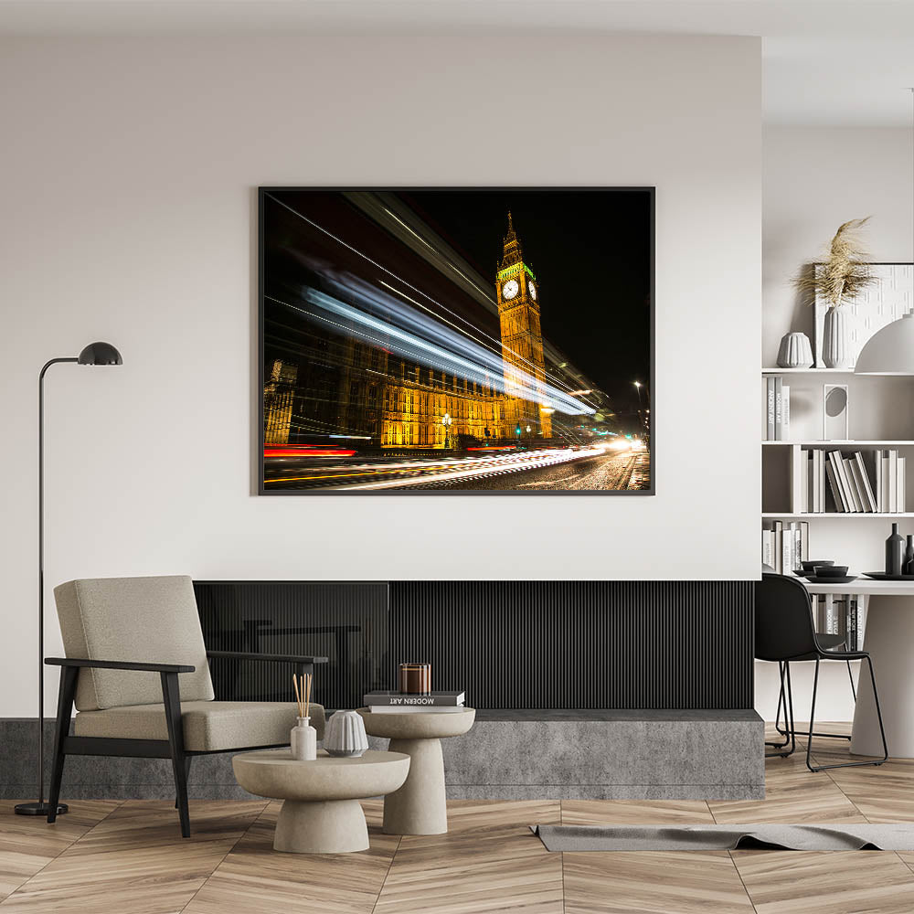 Immerse yourself in the bustling night energy of London with this captivating street art canvas featuring Big Ben and the Houses of Parliament illuminated against the dark sky. The light trails from passing vehicles create a stunning motion effect, capturing the pulse of the city in a single frame. This dynamic piece of urban London photography art is perfect for anyone who loves the contrast between classic landmarks and modern city life.
