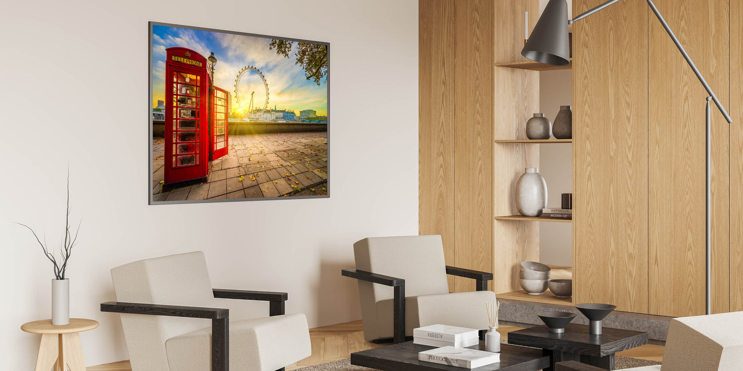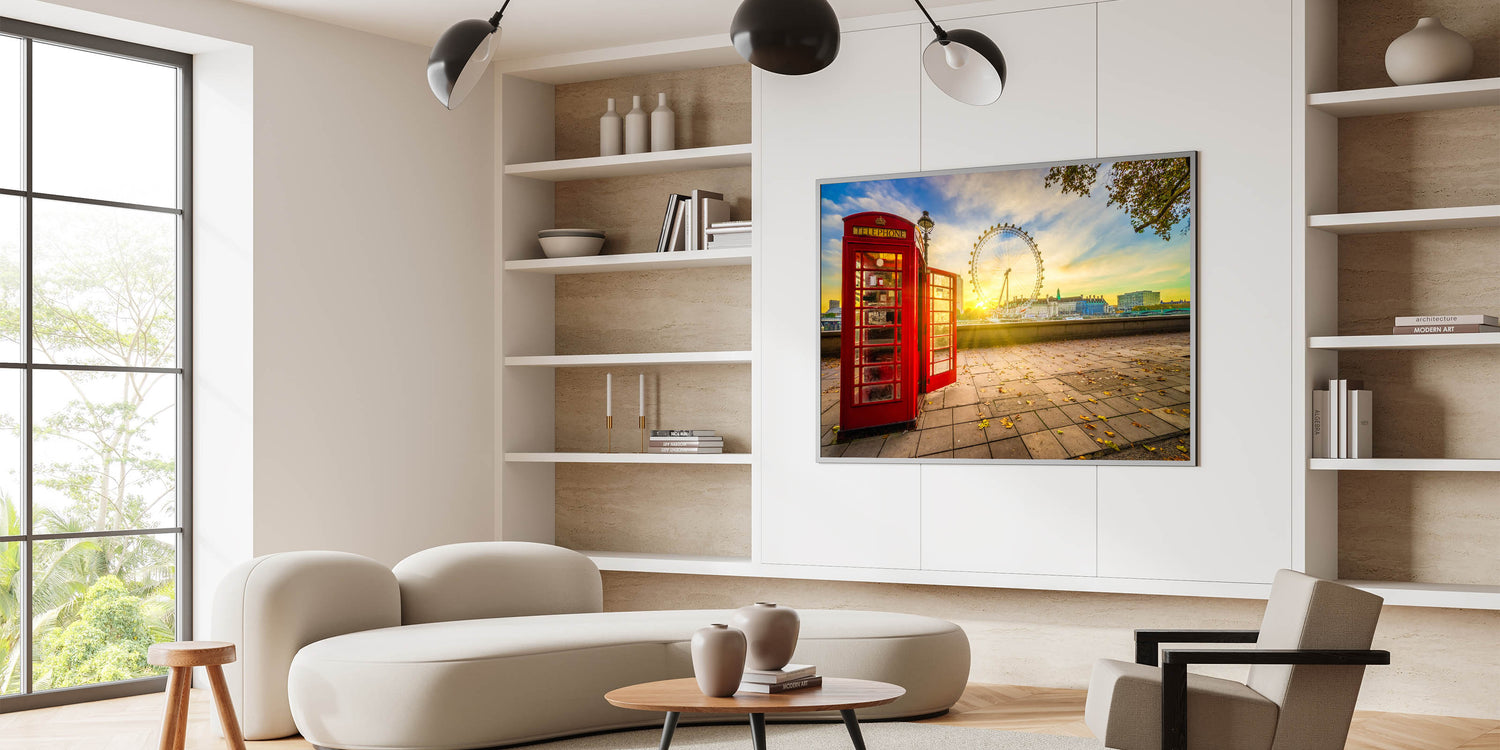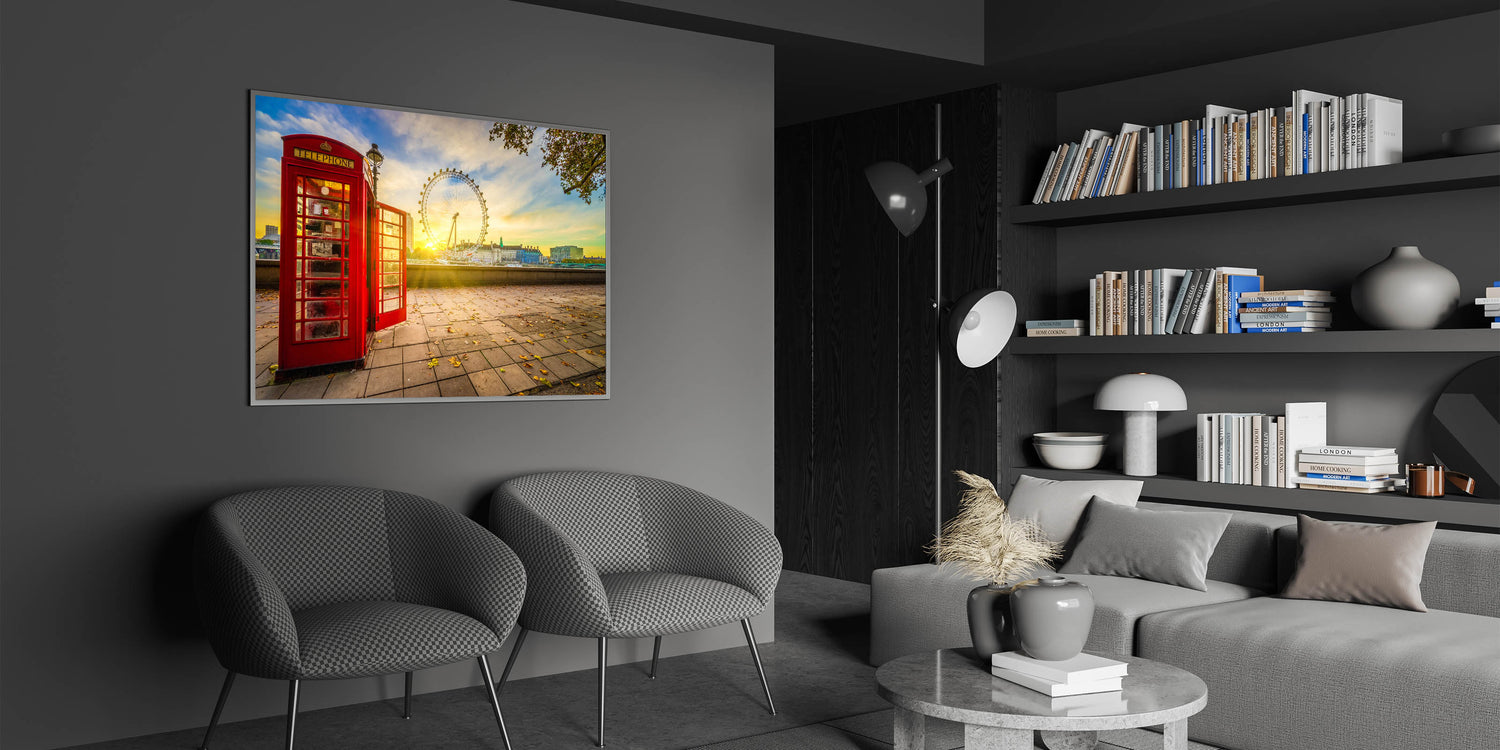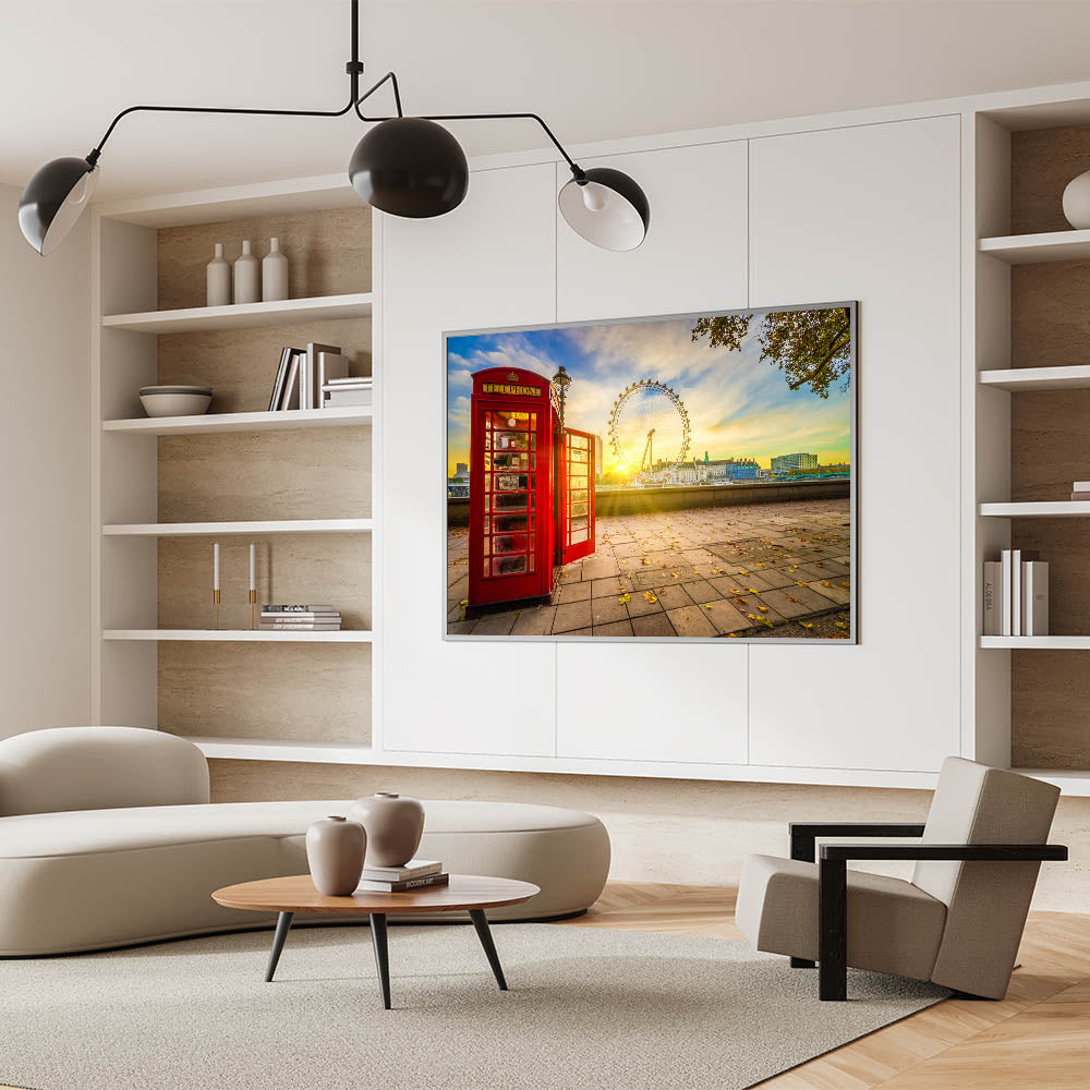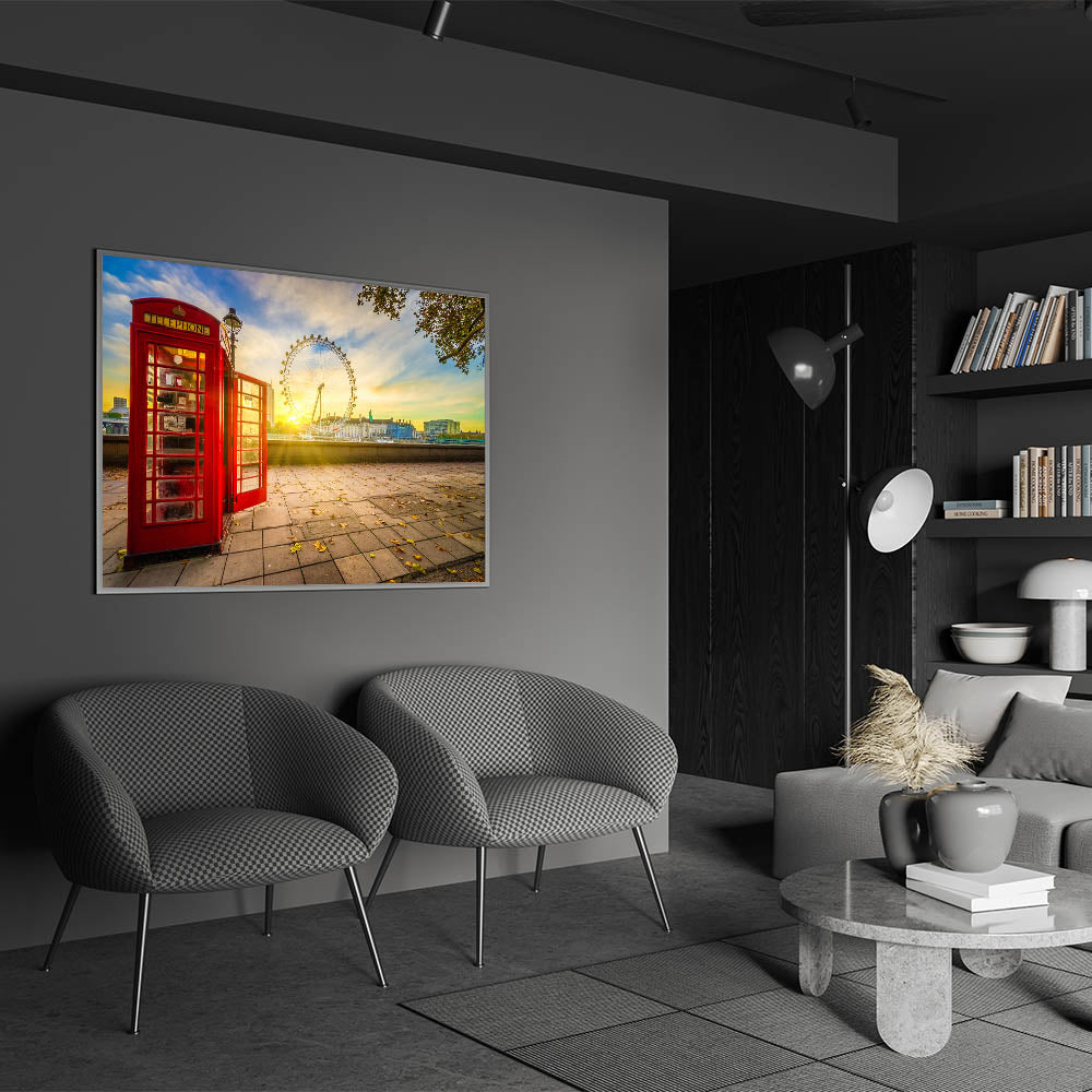 - High-quality London-themed wall decor available in multiple formats: Stretched Canvas, Framed Canvas, Acrylic Glass, Framed Acrylic Glass, Framed Print, Rolled Canvas, and Rolled Print.
