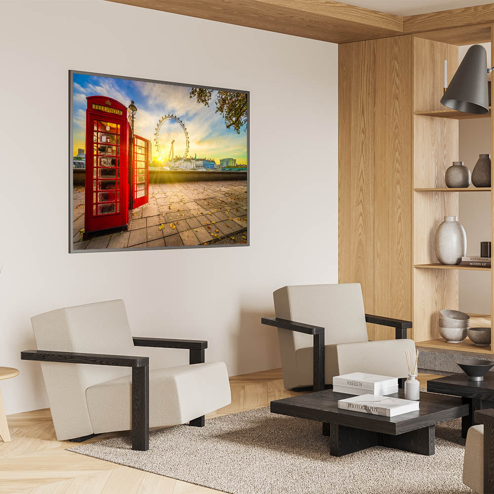 Add a touch of classic London charm to your decor with this vibrant artwork featuring the iconic red phone booth and the London Eye. The morning sun rises behind the London Eye, casting a golden glow over the scene and highlighting the bright red of the phone booth, making this artwork a perfect blend of vintage and modern London. Ideal for lovers of classic London imagery, this print captures the timeless beauty of the city with a contemporary flair.