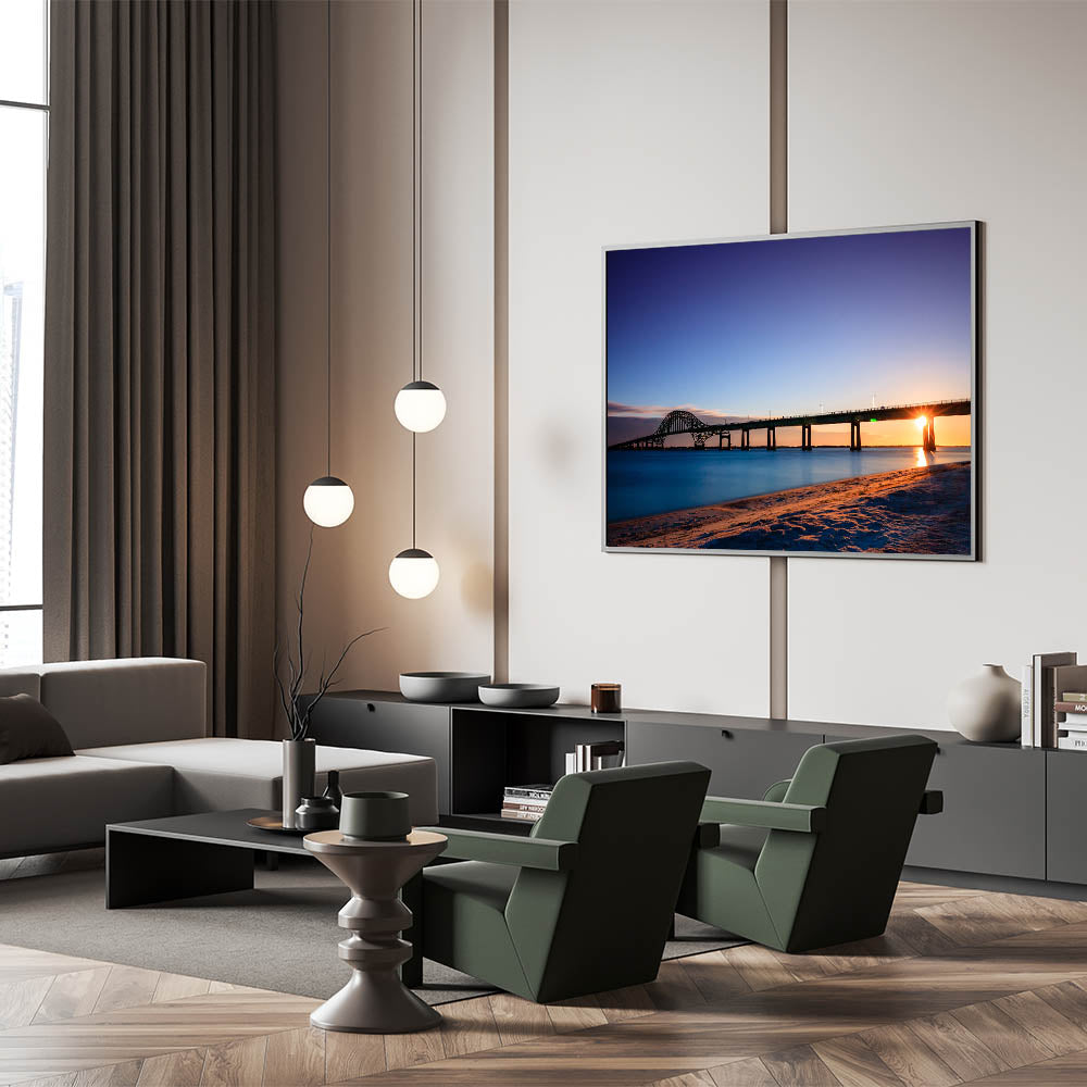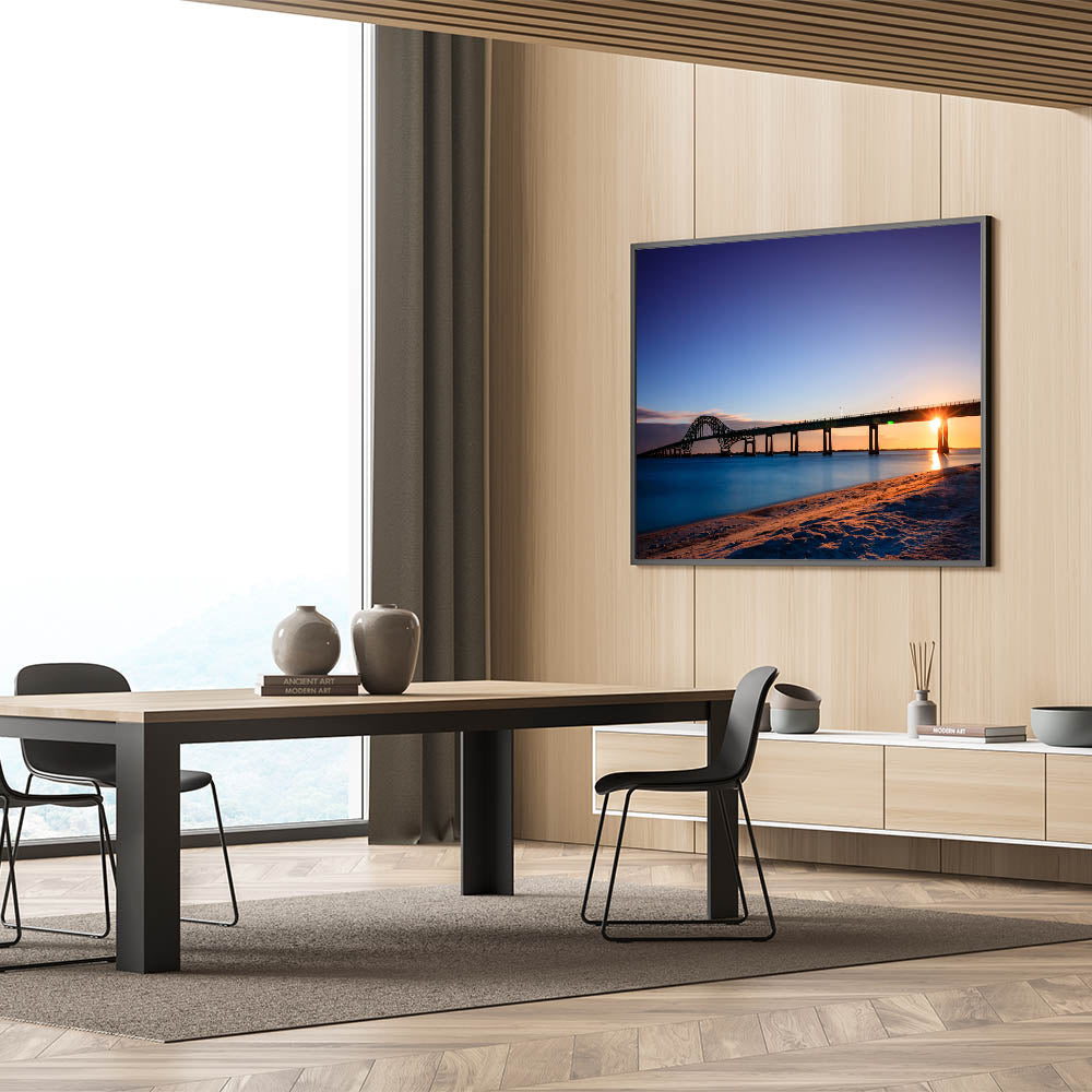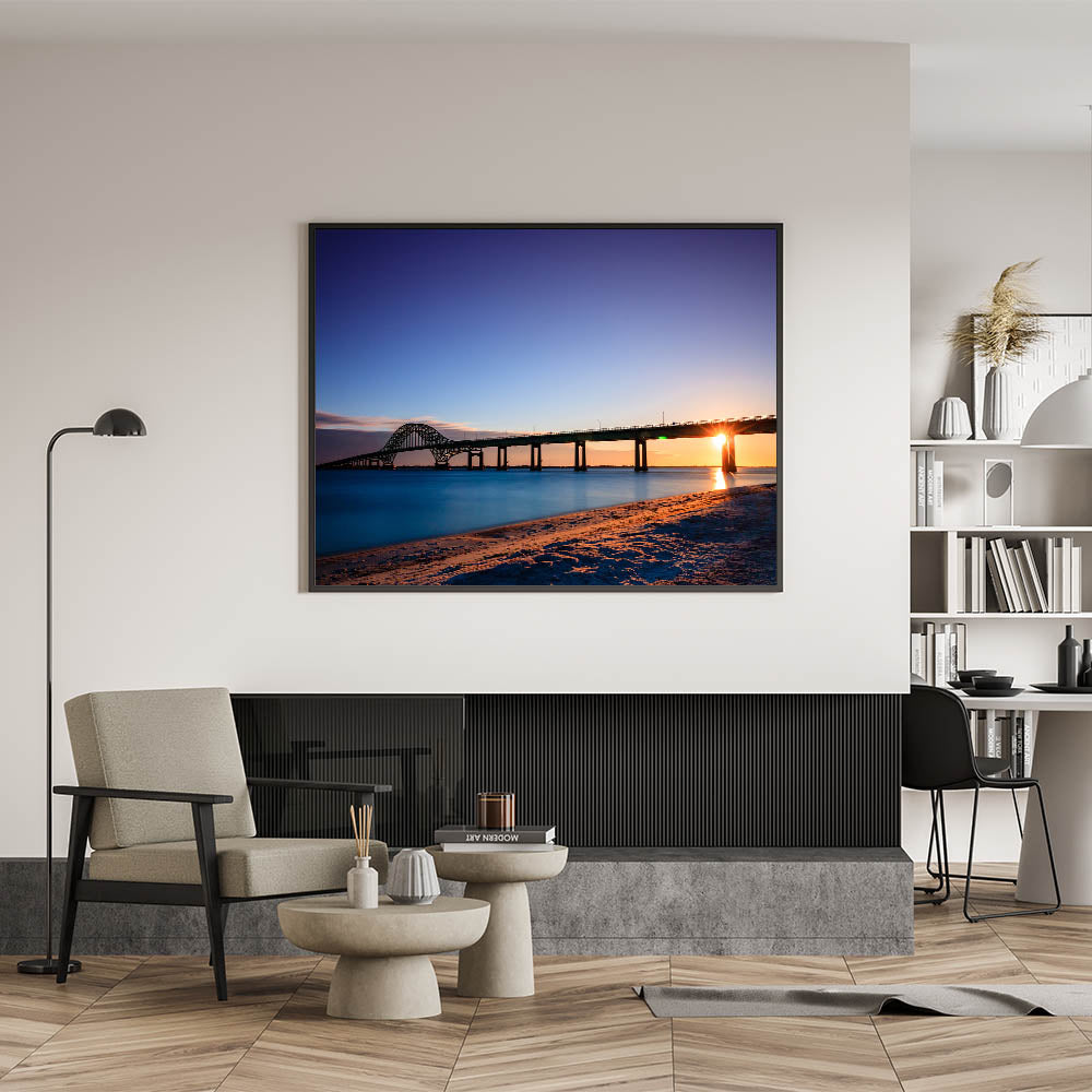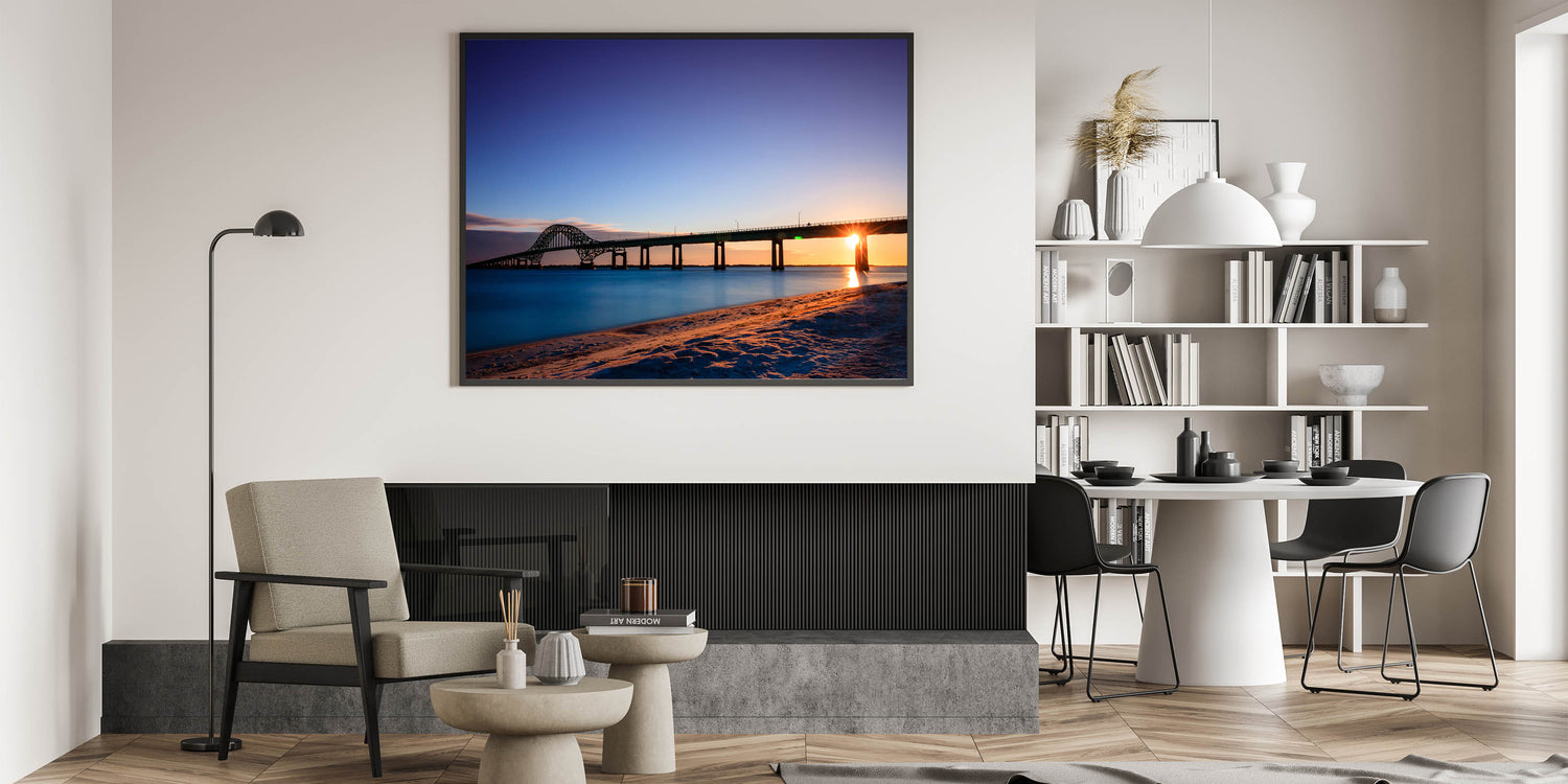 Bring the beauty of Fire Island to your space with this captivating Long Island Wall Art, featuring the iconic Robert Moses Bridge at sunset. This stunning beach scene captures the warmth of the setting sun as it dips below the horizon, creating a perfect blend of sky and water in vivid hues of orange and blue. Ideal for those who appreciate Long Island beach photography, this piece brings a serene, coastal vibe to your home or office. Available in a range of formats such as stretched canvas, framed prints, and acrylic glass, this artwork is perfect for adding New York coastal wall decor to any room.