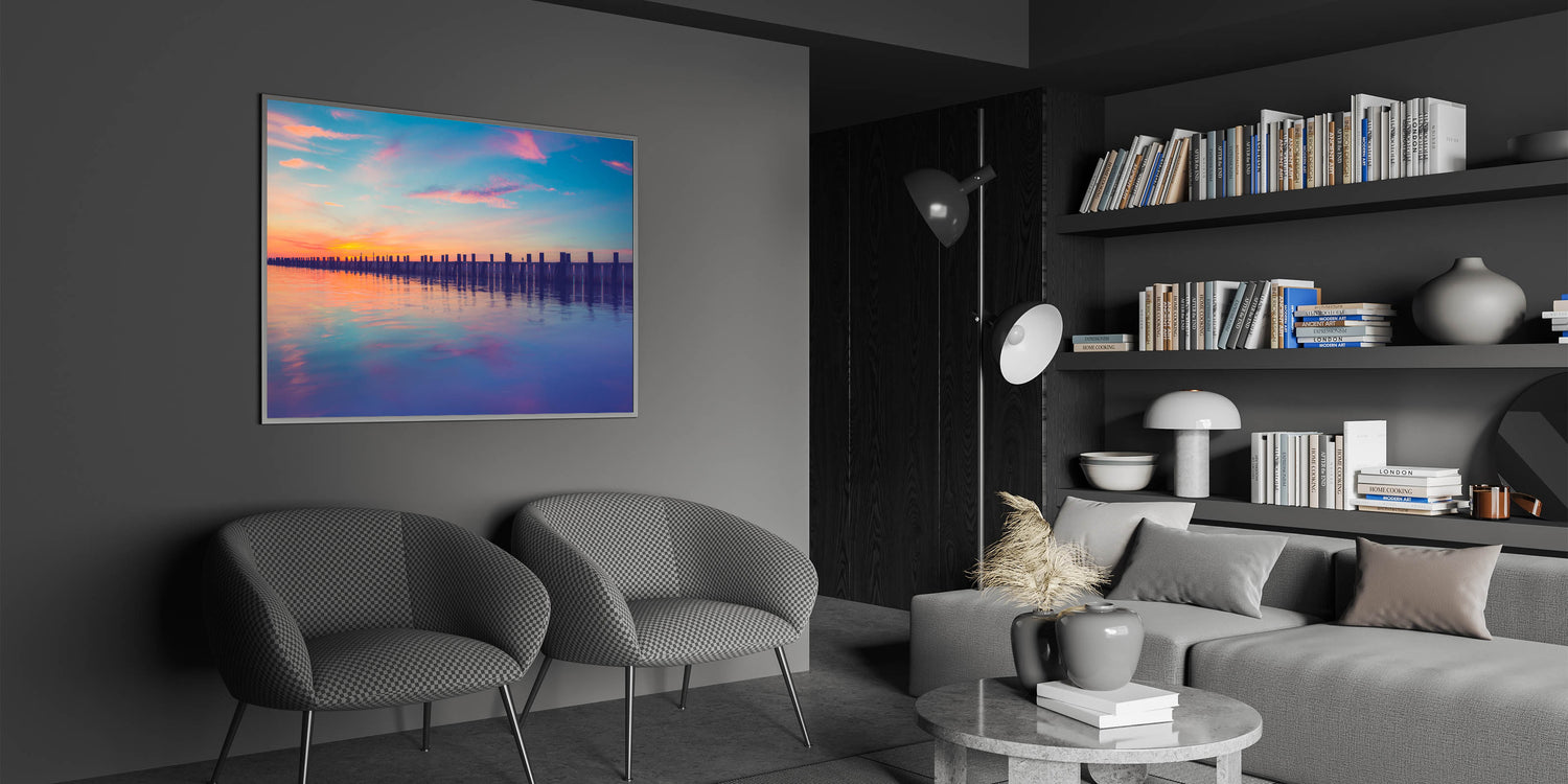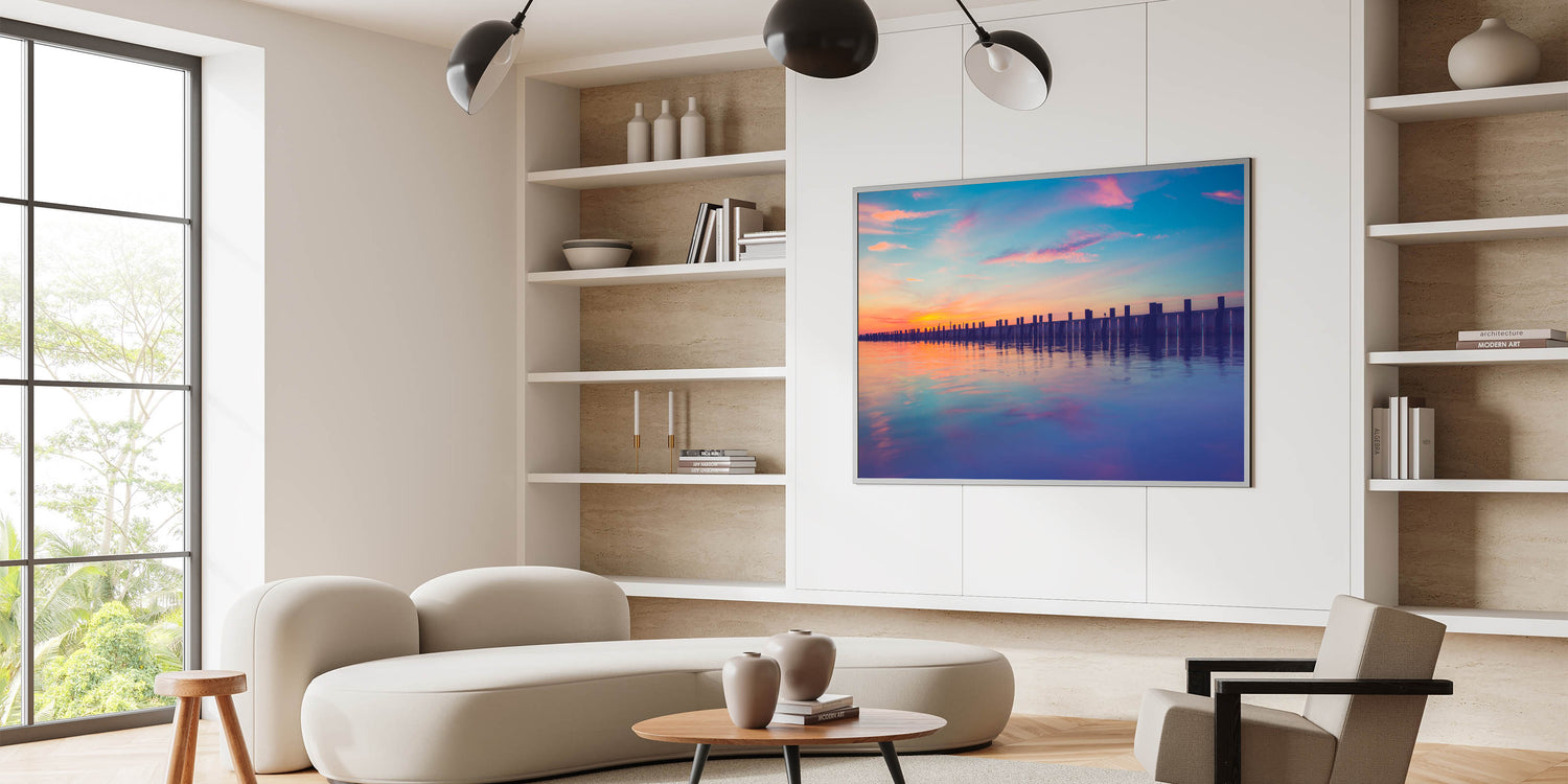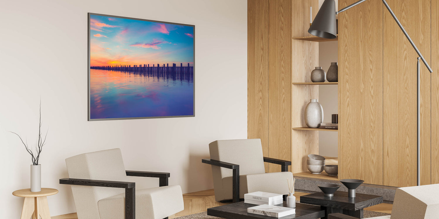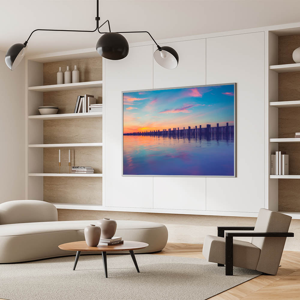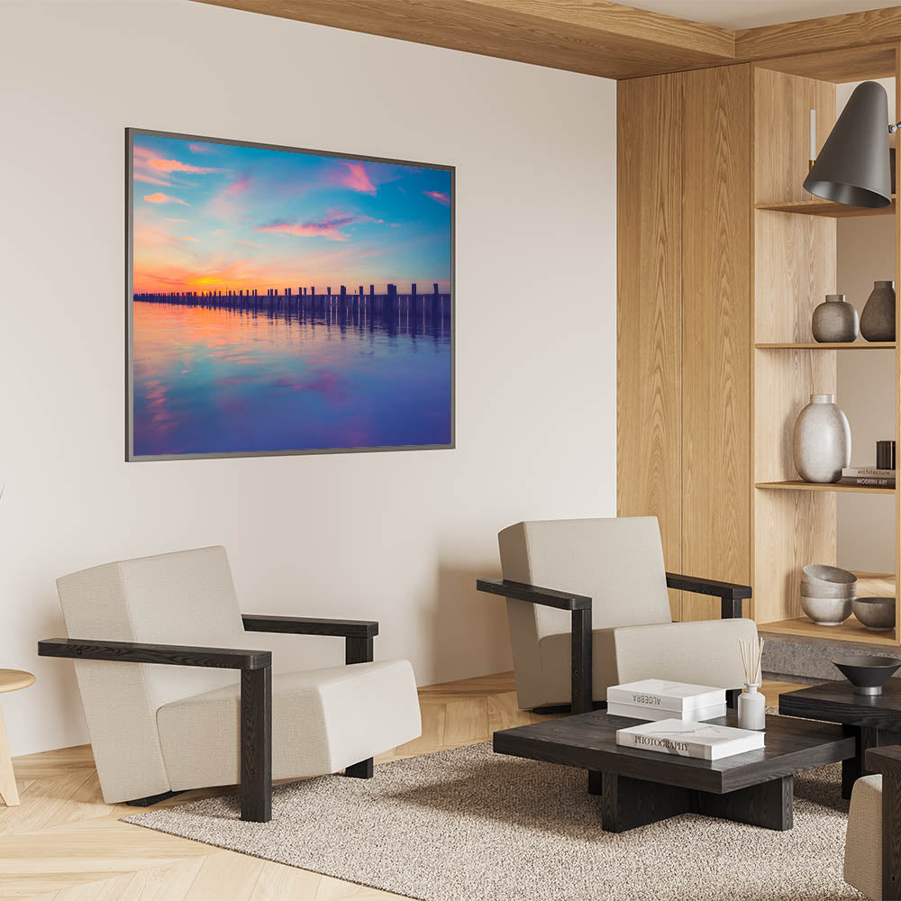 Transform your space with this peaceful Long Island framed photo, bringing the calming colors of sunset to your walls. Ideal for anyone seeking an elegant coastal vibe.