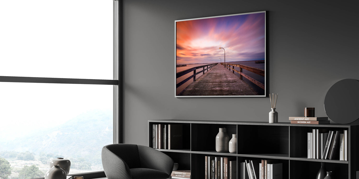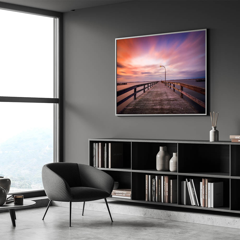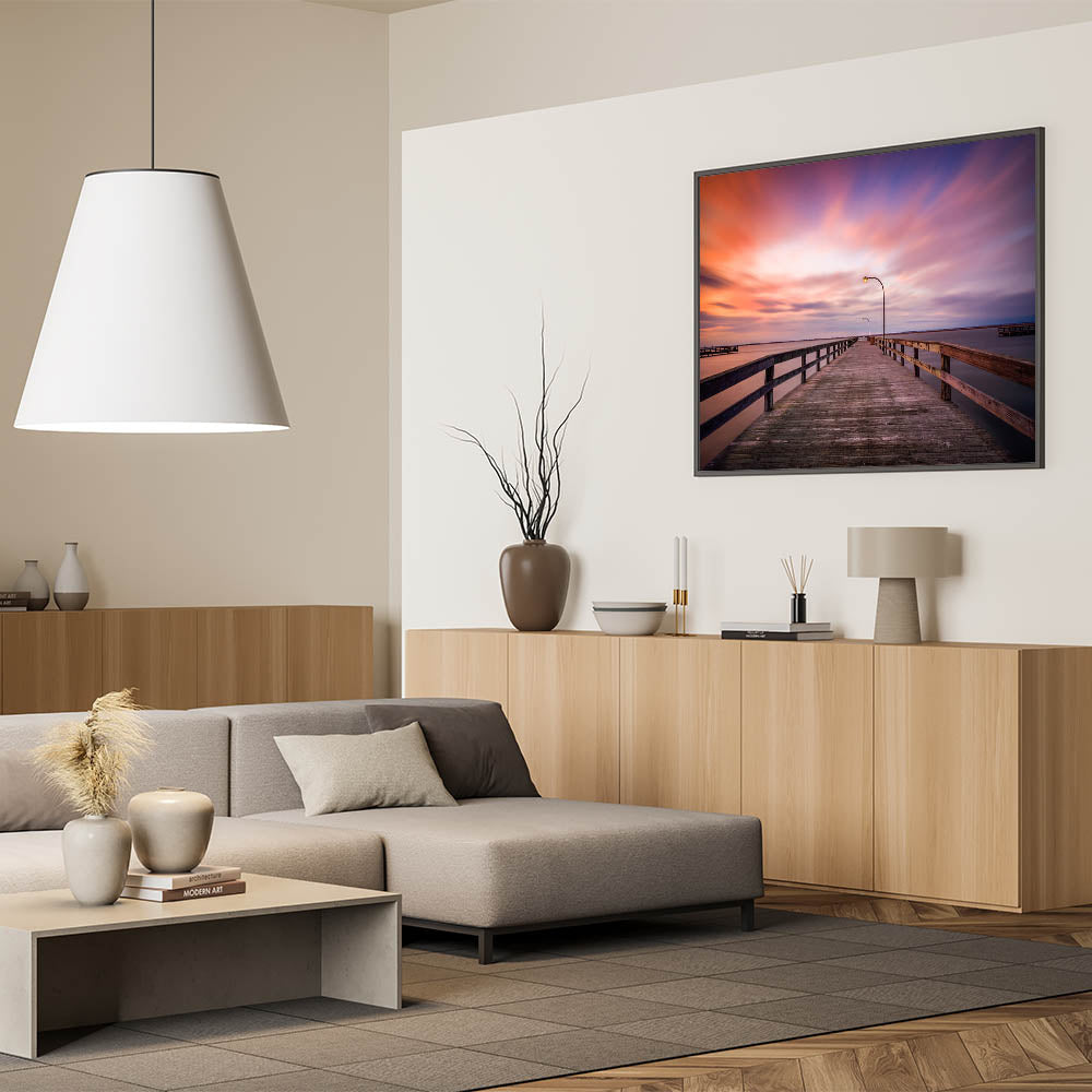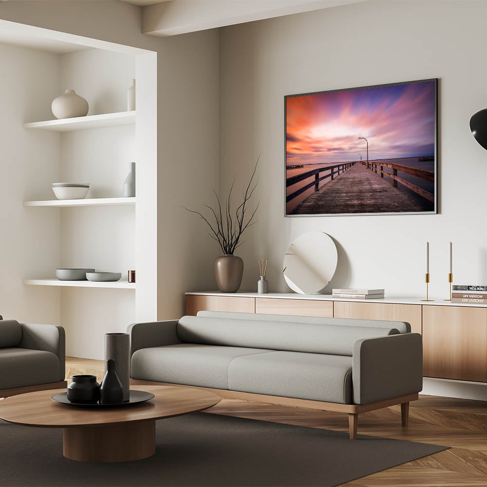 This tranquil Long Island Wall Art captures the serene beauty of a quiet pier at sunset. The stunning gradient of pinks, oranges, and purples in the sky contrasts beautifully with the calm waters, creating a peaceful atmosphere perfect for any room. This Long Island beach photography transports you to a peaceful moment by the coast, making it ideal for those who love New York coastal wall decor. Available in formats such as stretched canvas, framed prints, and acrylic glass, this artwork is a perfect way to add elegance and calmness to your space.