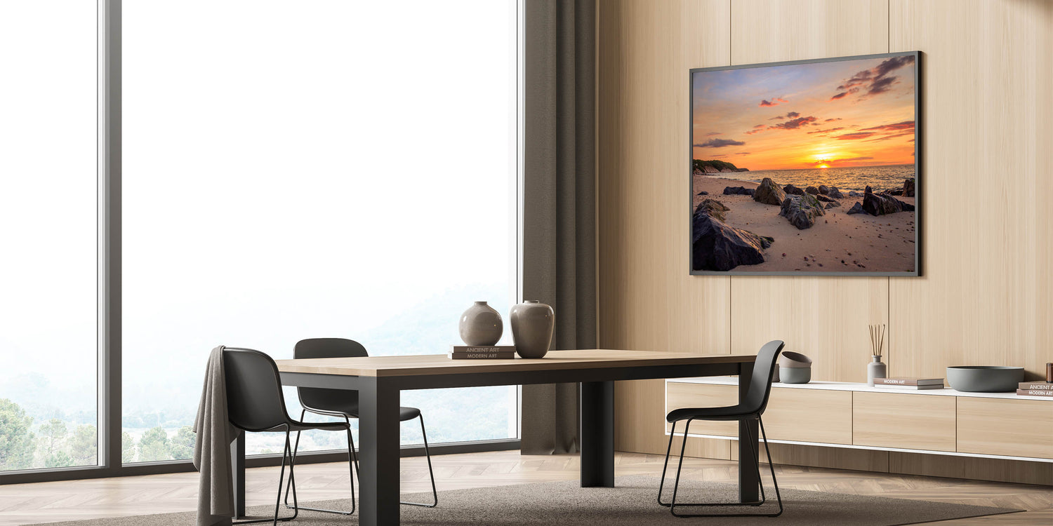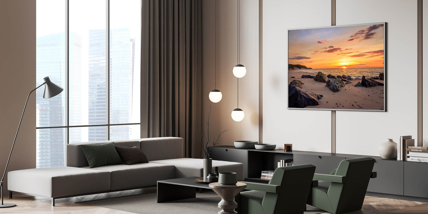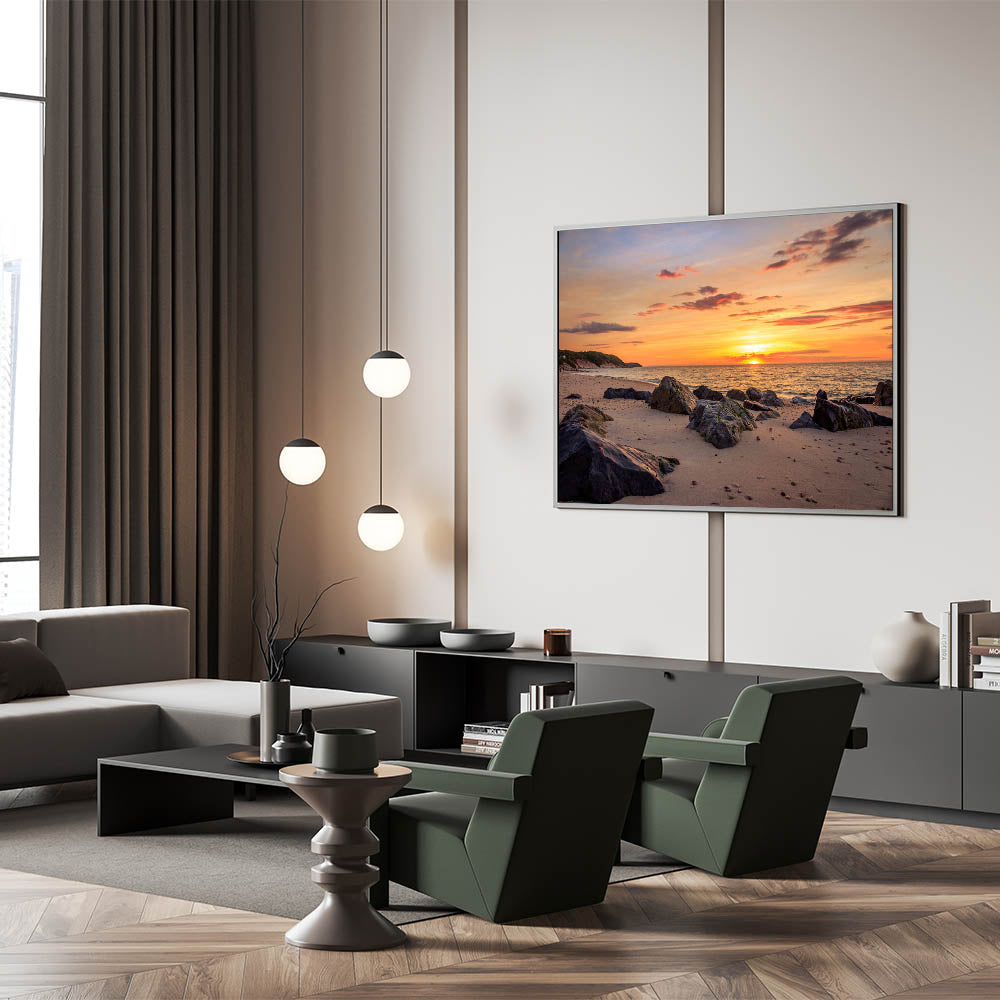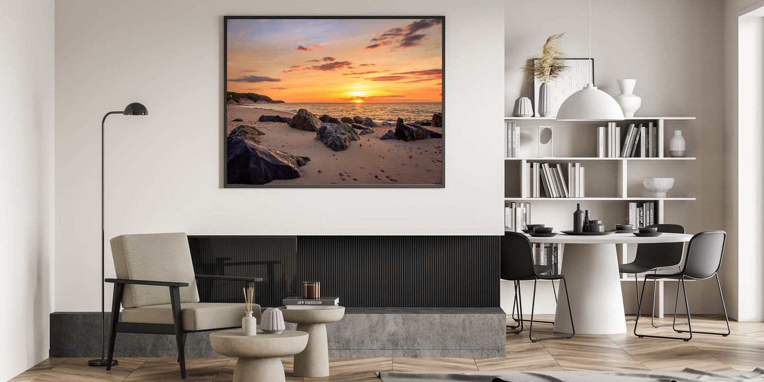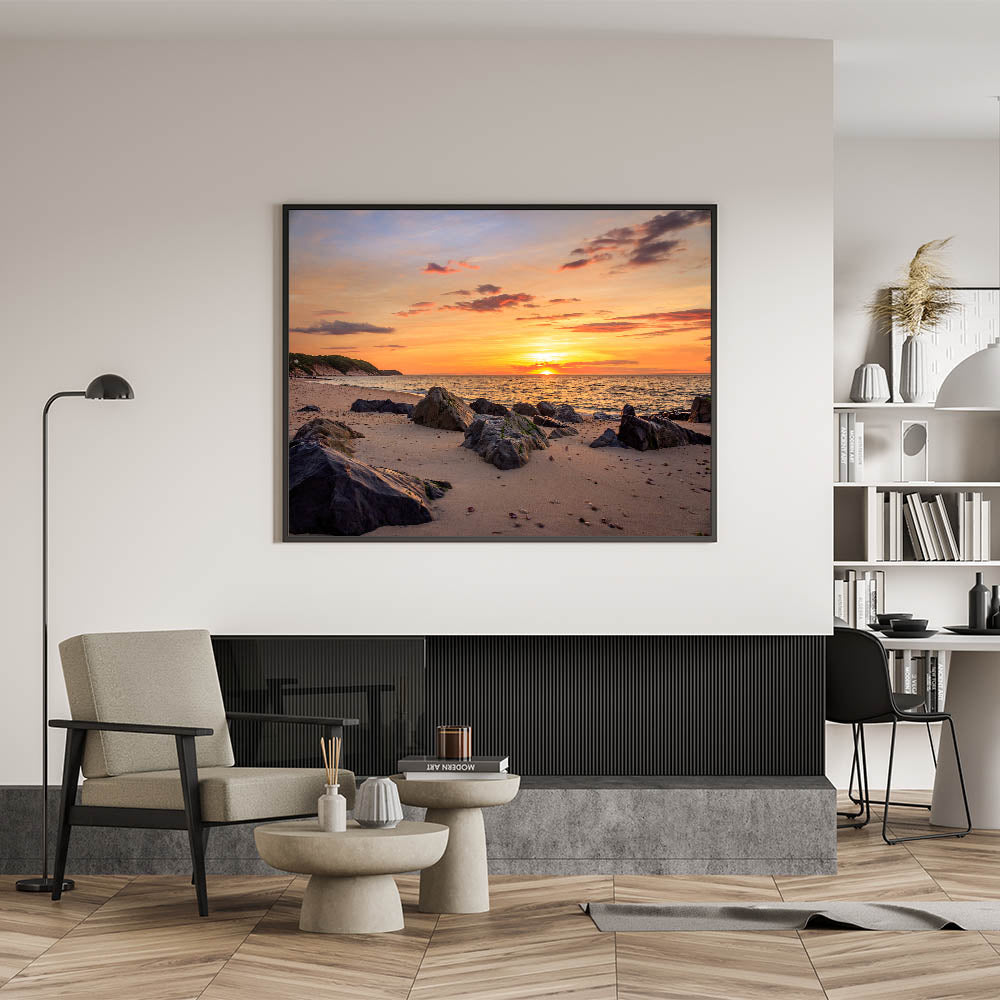 Embrace the peaceful beauty of the Montauk coastline with this stunning Long Island Wall Art. Capturing the vibrant colors of a sunset on a rocky beach, this print brings the calm and natural charm of Long Island beach photography into your home or office. The golden hues of the sunset, combined with the soft waves gently lapping at the shore, make this artwork a perfect addition to any space in need of a serene coastal vibe. Available in various formats, including stretched canvas, framed prints, and acrylic glass, this piece is a wonderful way to showcase the beauty of New York coastal wall decor.