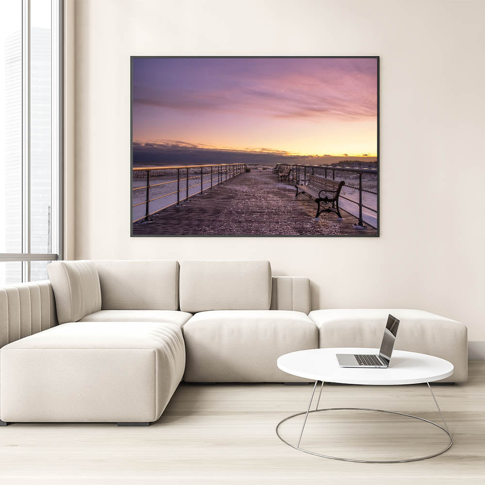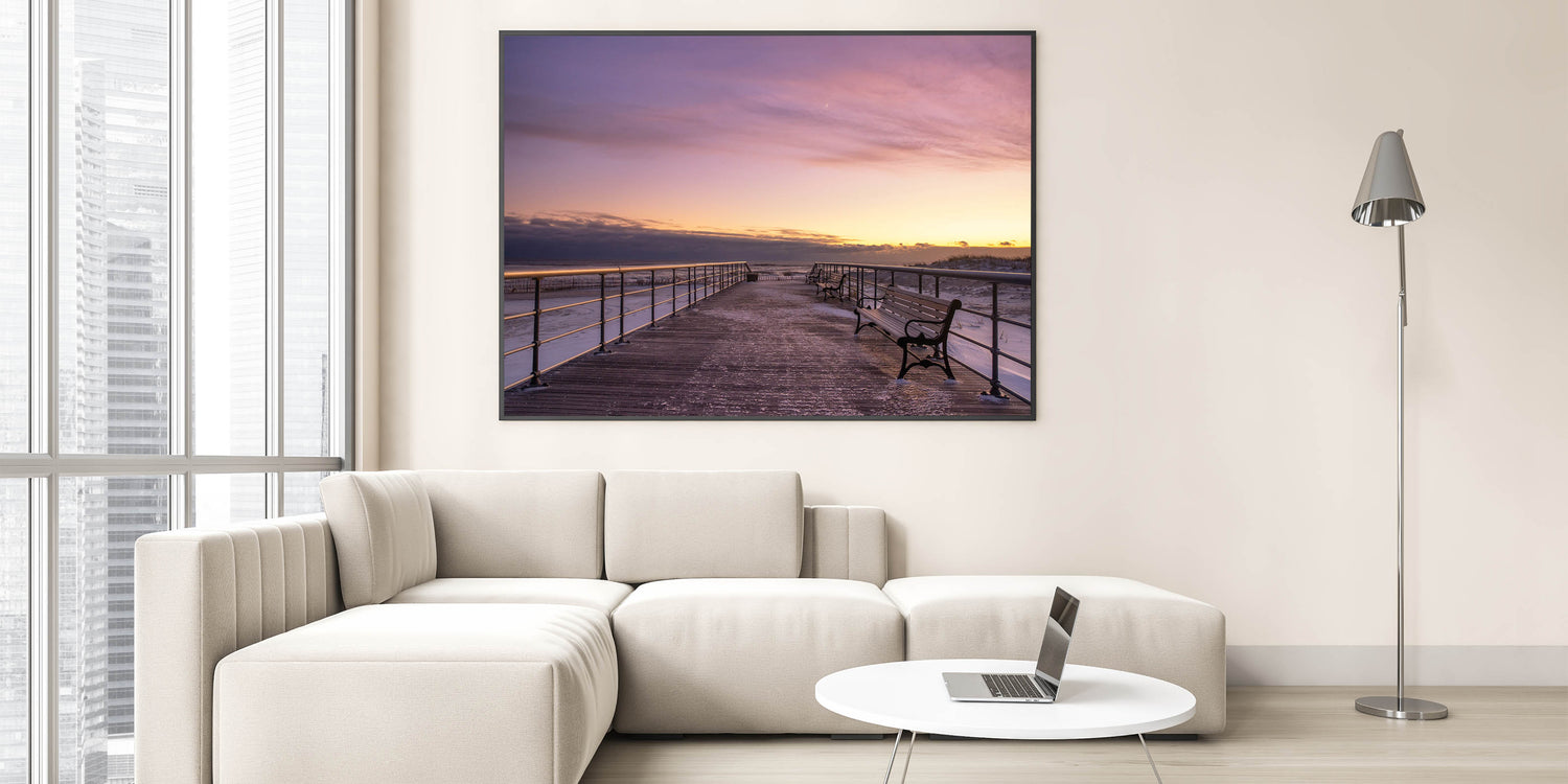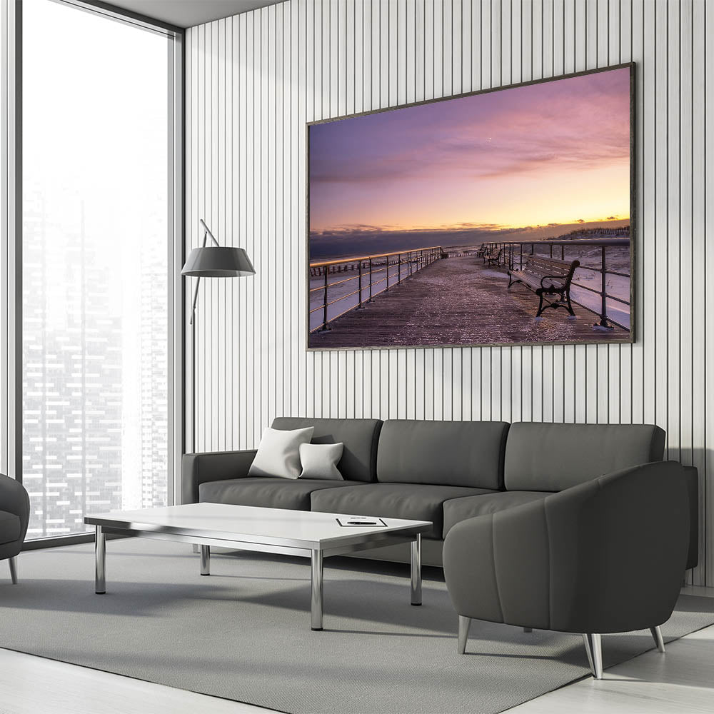 Capture the calm and beauty of a quiet evening in Montauk with this stunning Long Island Wall Art. Featuring a tranquil boardwalk with benches that overlook the sea, this artwork evokes a sense of serenity, perfect for creating a peaceful ambiance in your home or office. The soft colors of the sunset, blending shades of purple, pink, and gold, make this piece a beautiful addition to your collection of Long Island beach photography. Available in various formats such as stretched canvas, framed prints, and acrylic glass, this print is perfect for lovers of New York coastal wall decor.