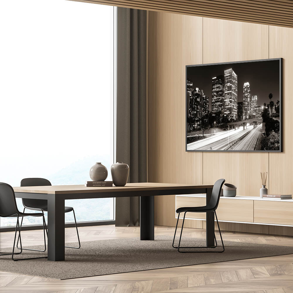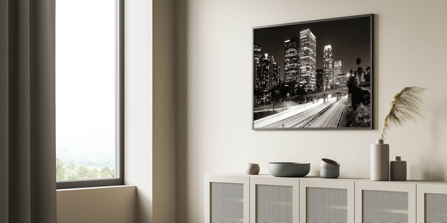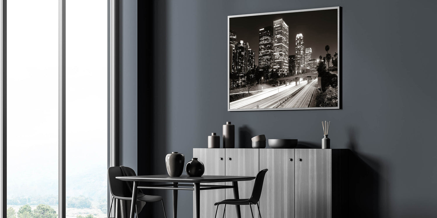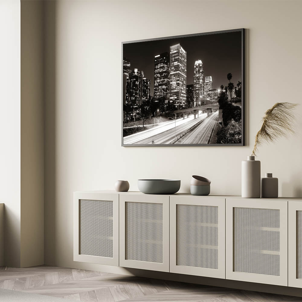 Add a touch of sophistication to your decor with this stunning black and white photograph of downtown Los Angeles. The timeless elegance of the monochromatic palette enhances the beauty of the city’s skyline, making this artwork a perfect statement piece for any room.