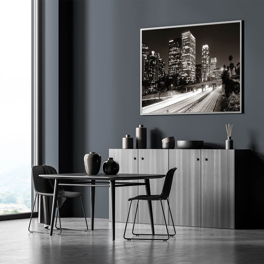 This sophisticated black and white photograph captures the essence of downtown Los Angeles at night. The towering skyscrapers, illuminated by countless lights, stand in sharp contrast to the sleek highways below. The light trails of passing cars create a sense of motion and energy, while the monochrome palette brings timeless elegance to the scene. Perfect for those who appreciate the beauty of urban life, this artwork combines modern architecture with the classic appeal of black and white photography.