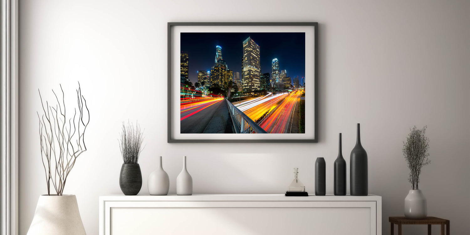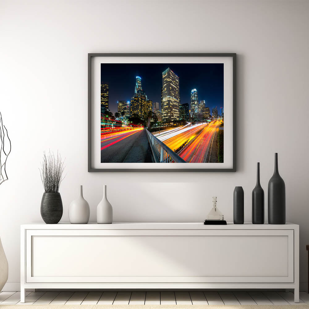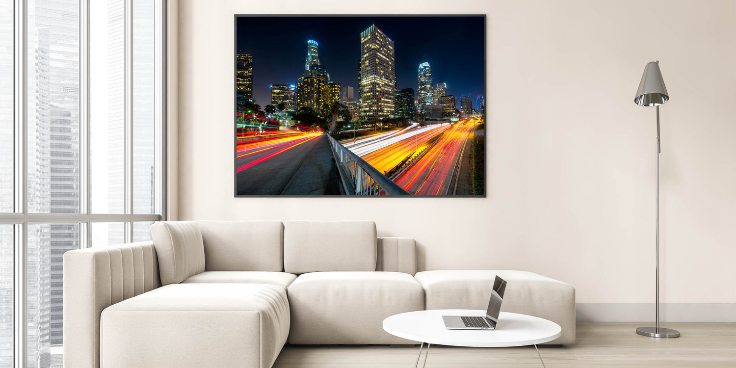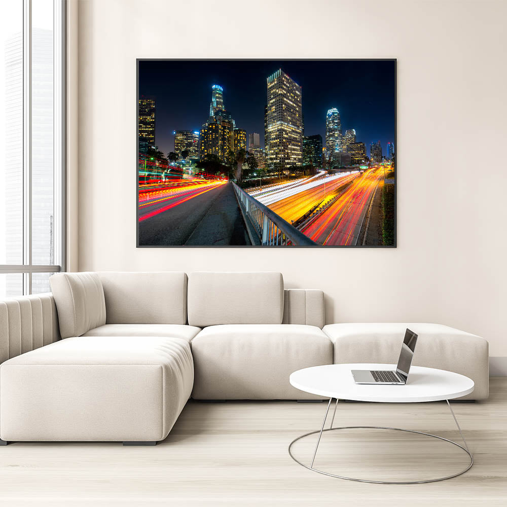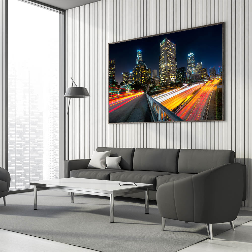 Bring the electrifying energy of LA nights into your home with this captivating cityscape. The combination of bold, bright lights and sleek modern architecture makes this artwork the perfect statement piece for any room. Whether you're a fan of downtown LA photography or simply want to add a touch of urban sophistication, this artwork will not disappoint.