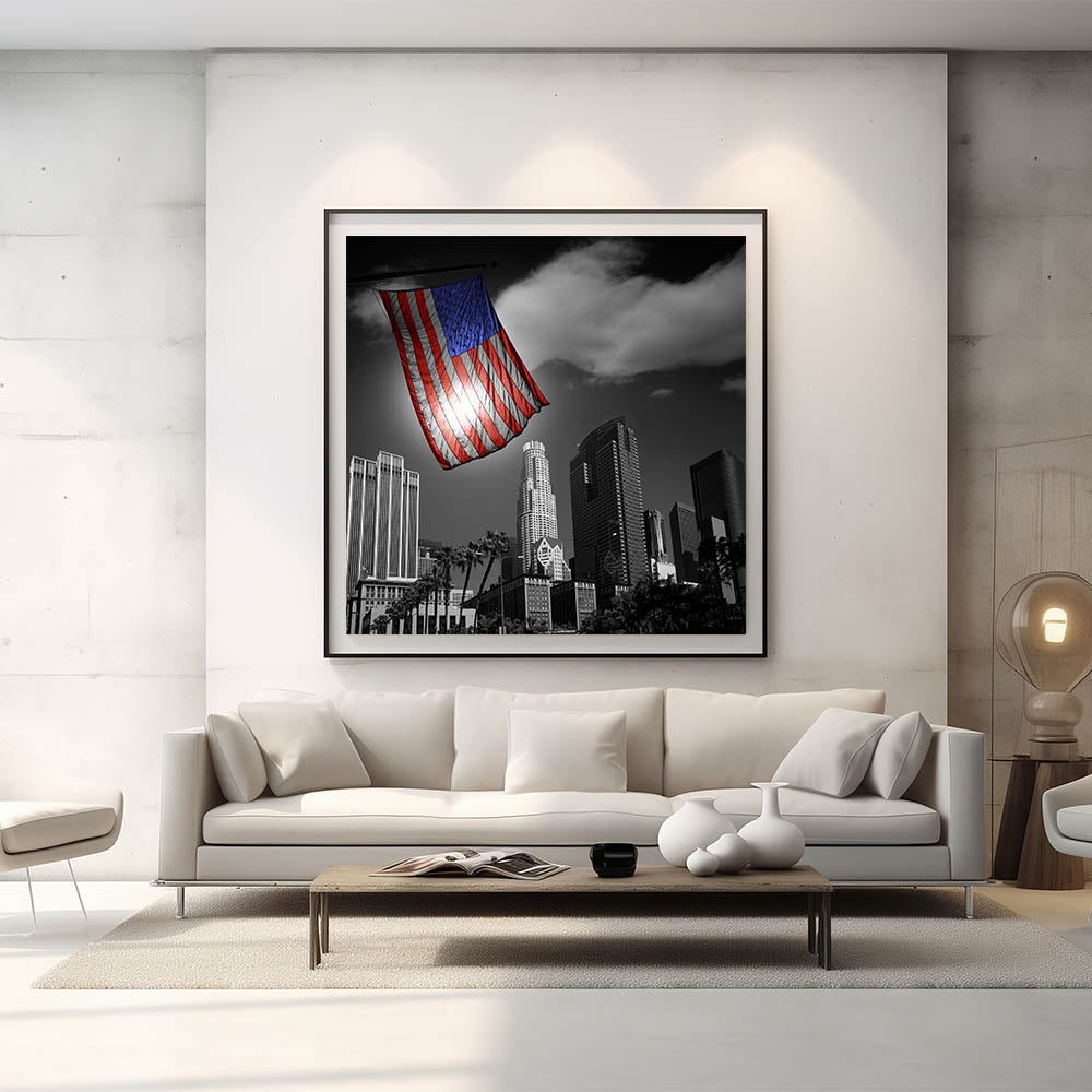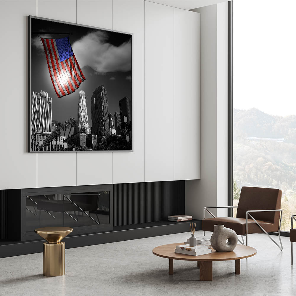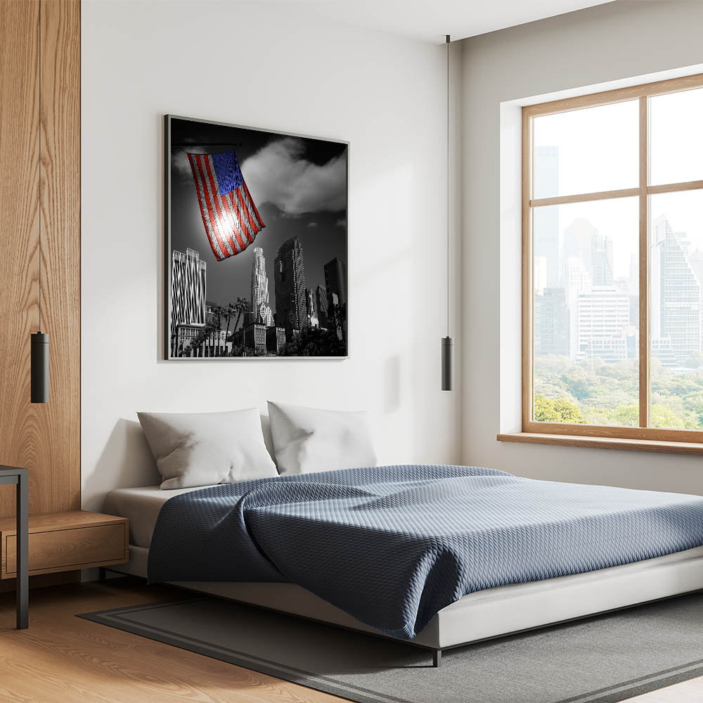 This powerful depiction of the Los Angeles skyline not only showcases the stunning downtown area but also brings a patriotic touch to your decor. It’s perfect for homes, offices, and any space where you want to combine the beauty of LA’s architecture with the proud symbol of the American flag.