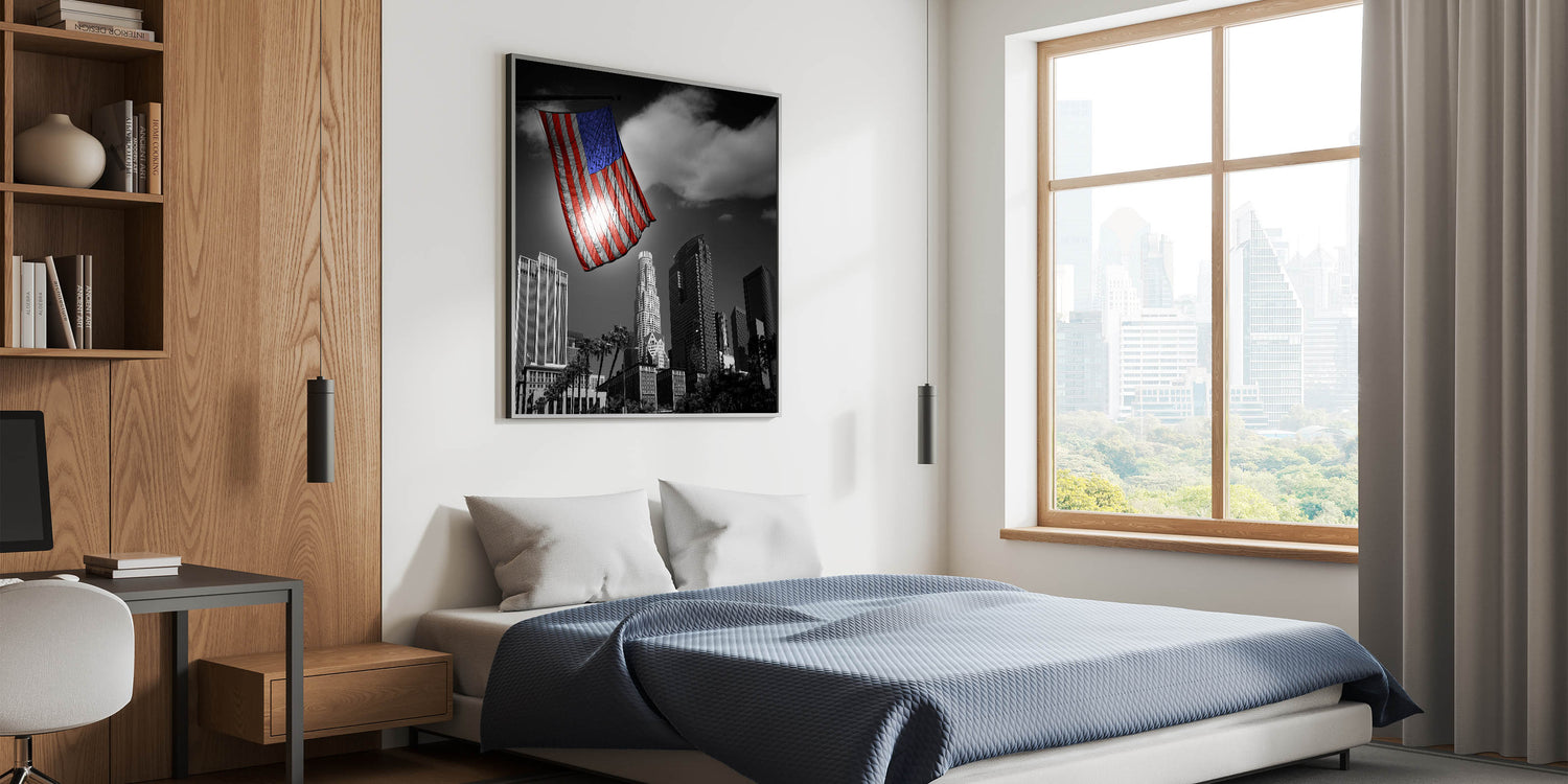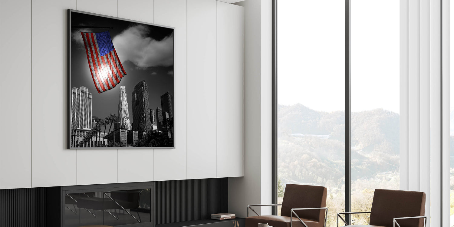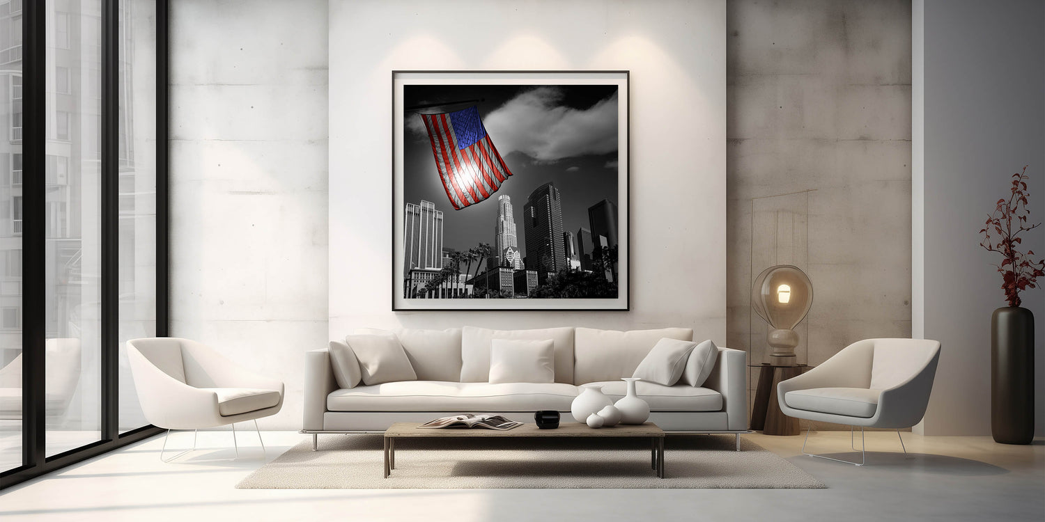 This powerful depiction of the Los Angeles skyline not only showcases the stunning downtown area but also brings a patriotic touch to your decor. It’s perfect for homes, offices, and any space where you want to combine the beauty of LA’s architecture with the proud symbol of the American flag.