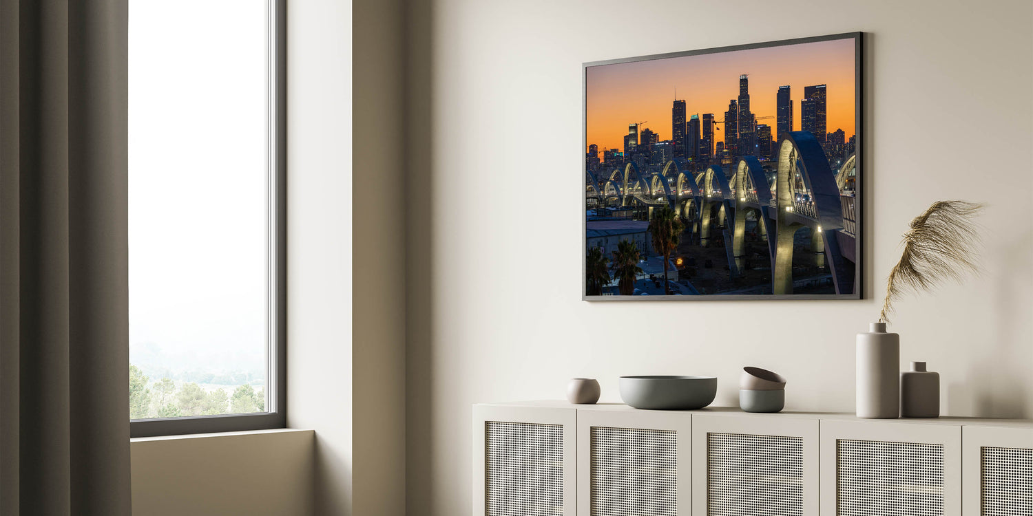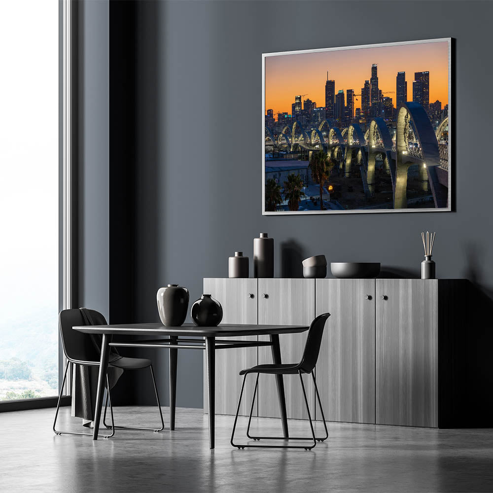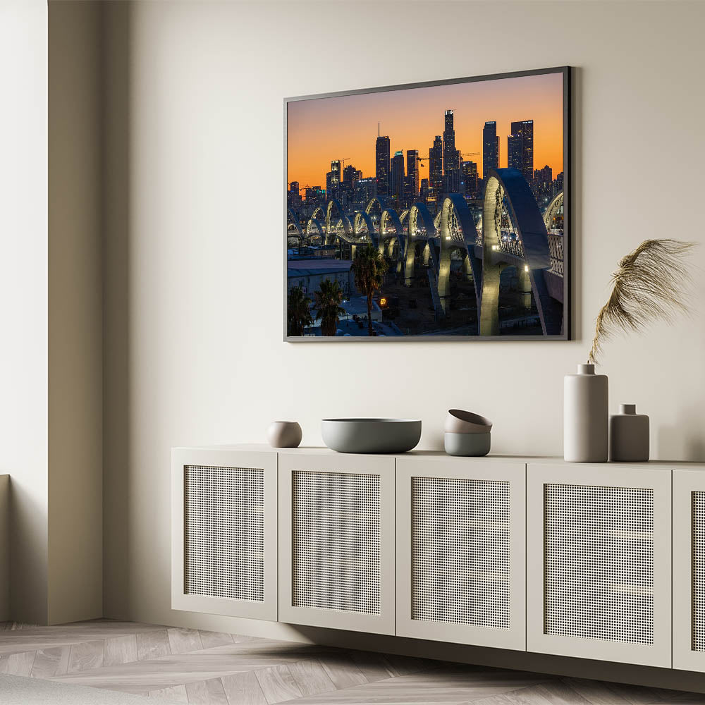 Add a touch of architectural beauty and vibrant color to your decor with this captivating artwork. The dramatic arches of the bridge, set against the backdrop of downtown LA, create a bold and modern statement piece. Ideal for lovers of urban landscapes and those who appreciate the fusion of city design and natural beauty.