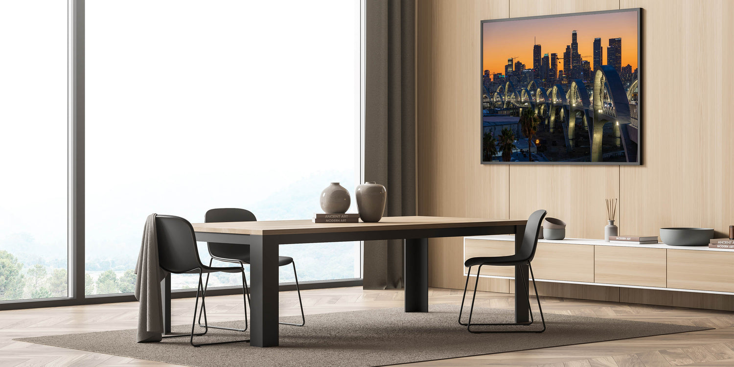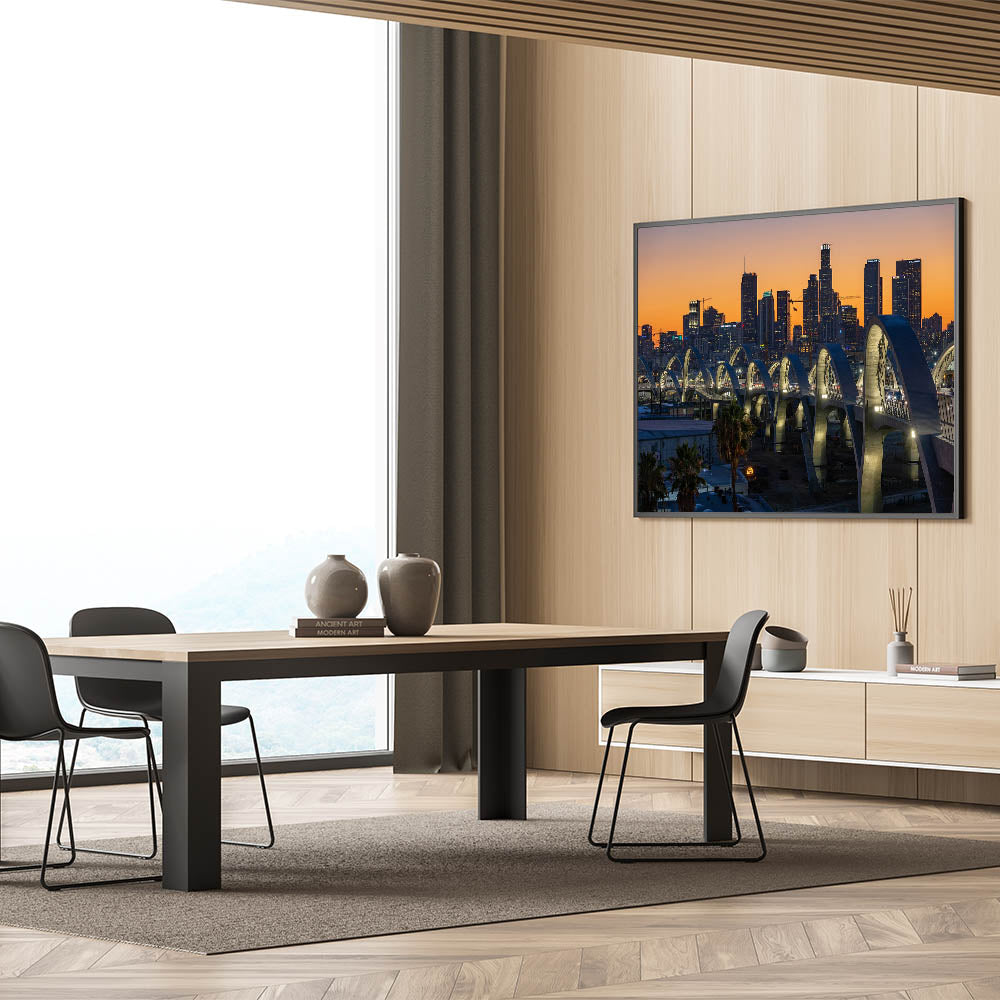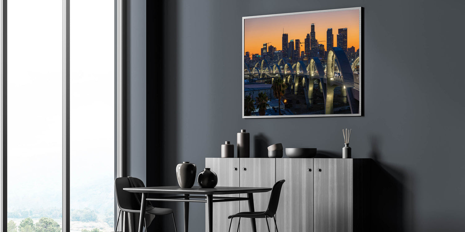 Add a touch of architectural beauty and vibrant color to your decor with this captivating artwork. The dramatic arches of the bridge, set against the backdrop of downtown LA, create a bold and modern statement piece. Ideal for lovers of urban landscapes and those who appreciate the fusion of city design and natural beauty.