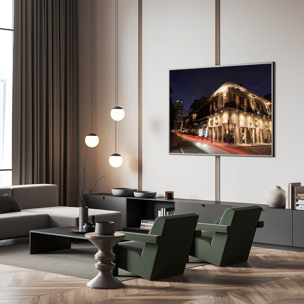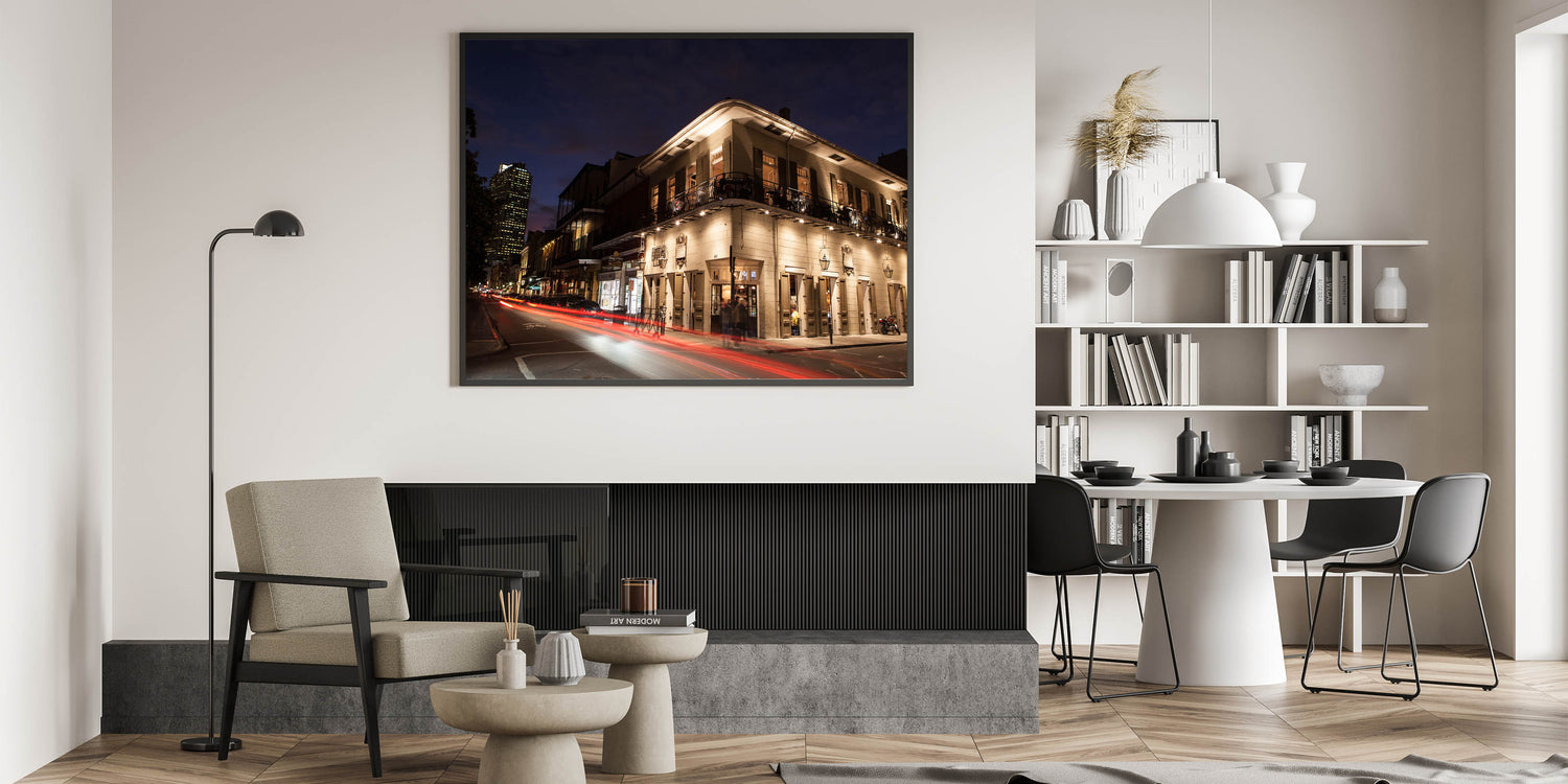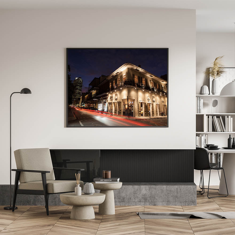 Experience the mystique and charm of New Orleans' French Quarter with this stunning night scene wall art. This artwork captures the elegance of historic buildings and lively streets, illuminated by soft lights against the backdrop of the city’s skyline. Perfect for those who love the rich cultural history of New Orleans, this piece brings the essence of the Crescent City into any space.