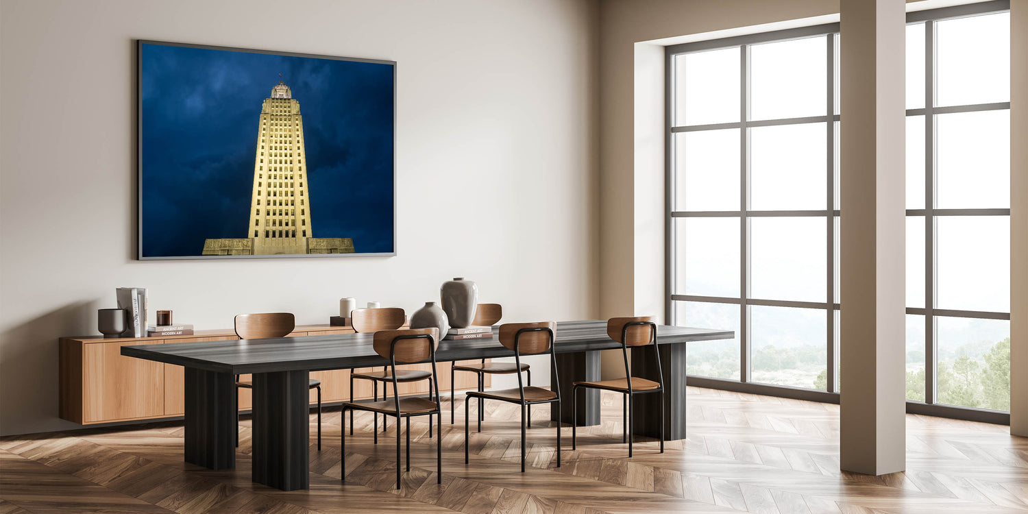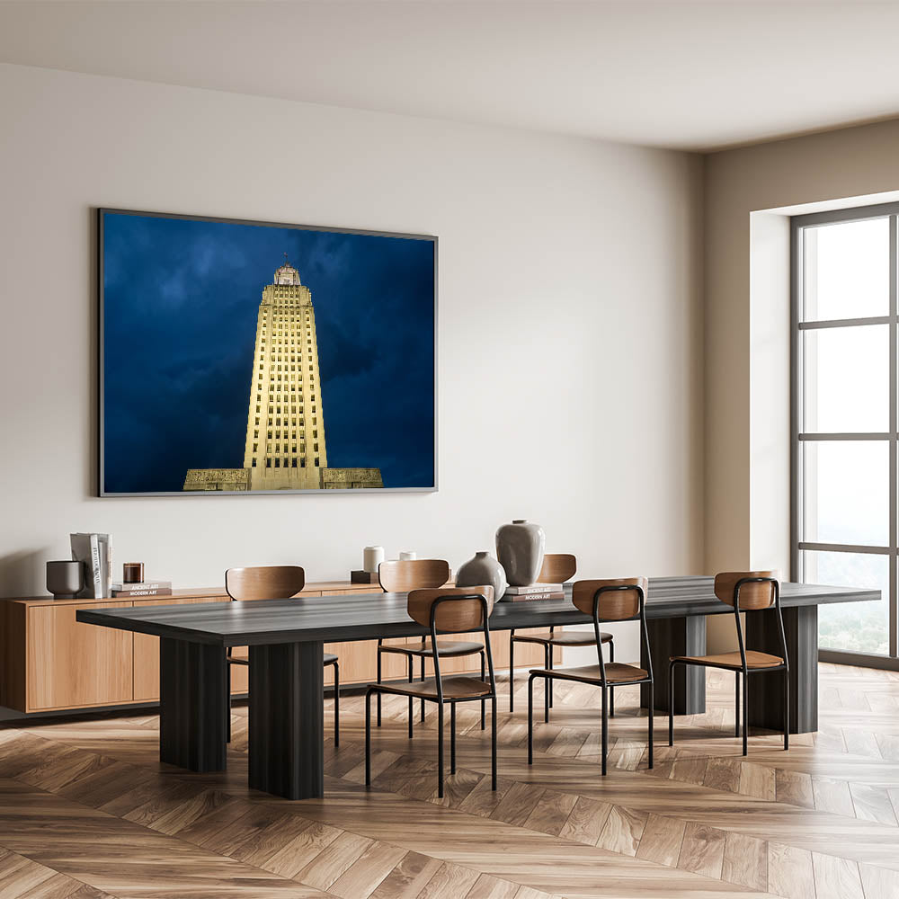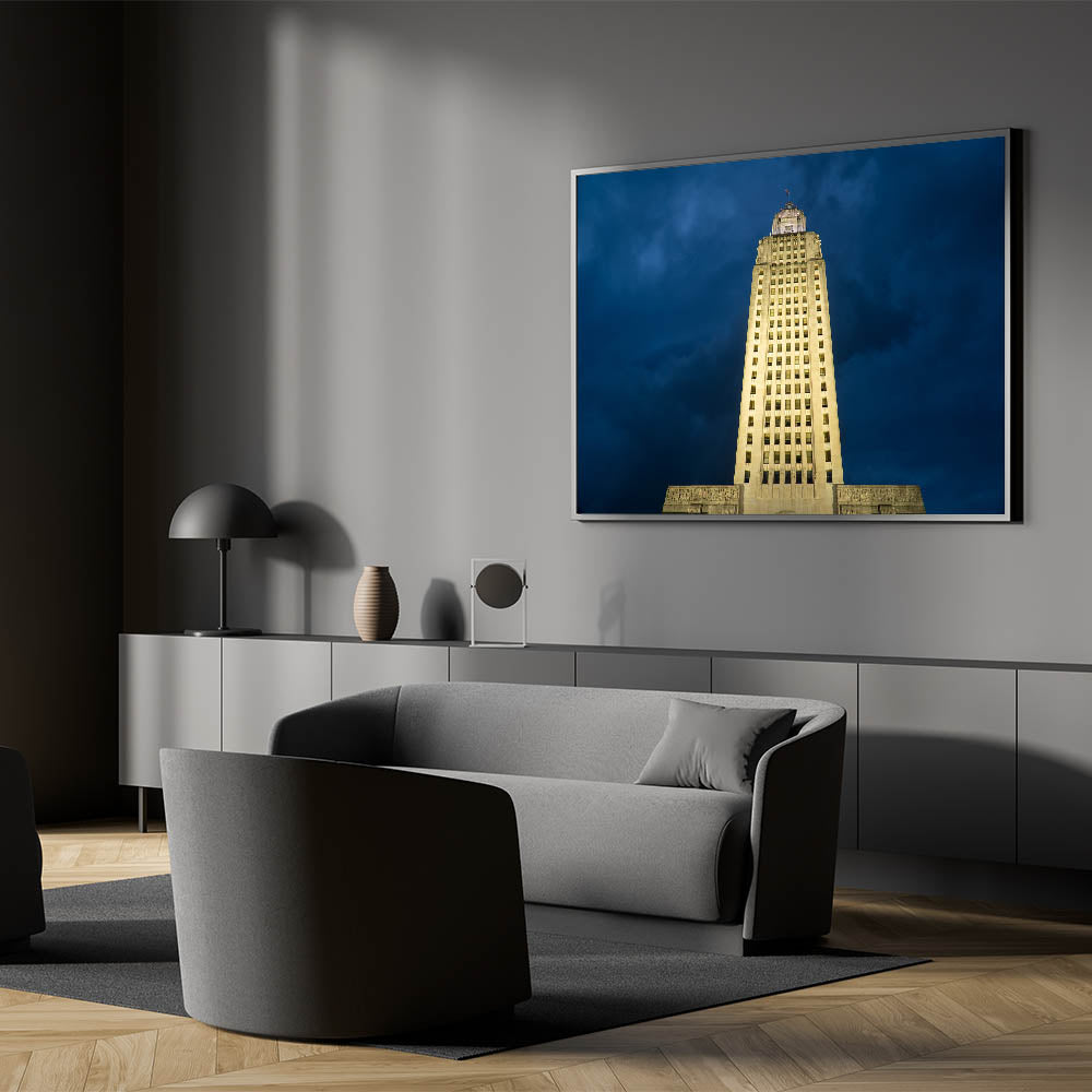 Celebrate the grandeur of Louisiana’s history with this striking wall art featuring the illuminated Louisiana State Capitol building against a dramatic evening sky. The tallest capitol building in the United States, this architectural masterpiece stands as a symbol of Louisiana’s rich political and cultural heritage. Part of our Historic Louisiana Architecture Art collection, this piece captures both the magnificence and elegance of this iconic landmark.