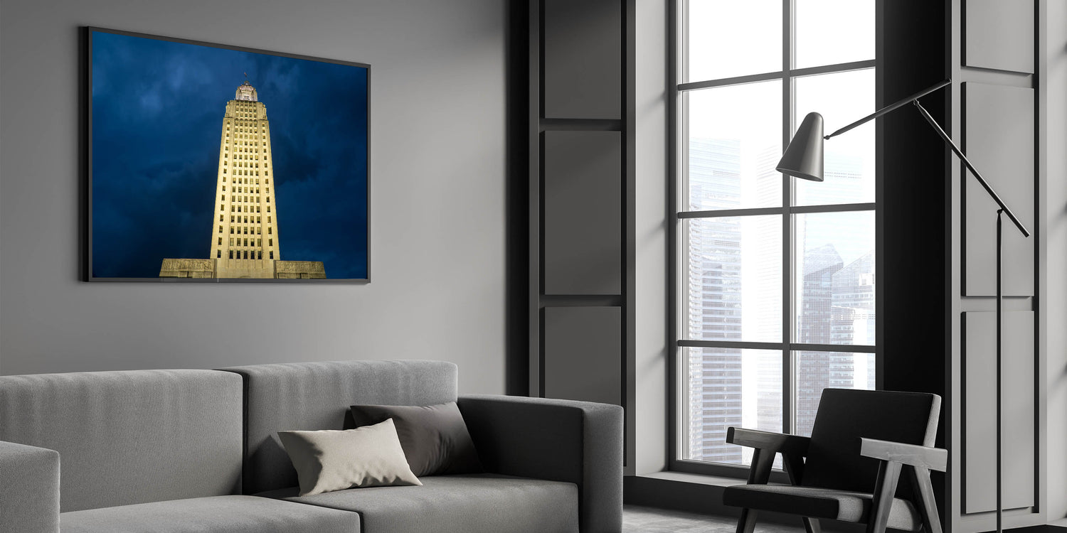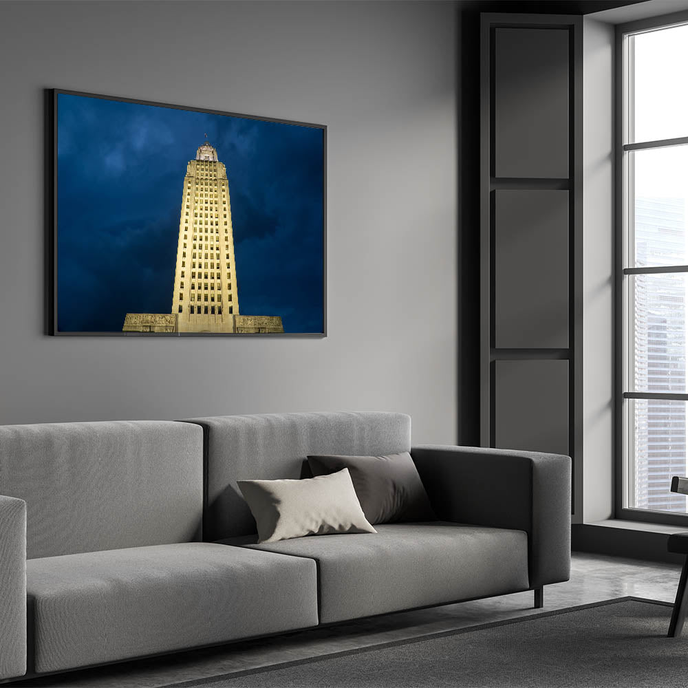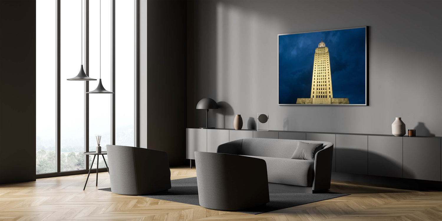Celebrate the grandeur of Louisiana’s history with this striking wall art featuring the illuminated Louisiana State Capitol building against a dramatic evening sky. The tallest capitol building in the United States, this architectural masterpiece stands as a symbol of Louisiana’s rich political and cultural heritage. Part of our Historic Louisiana Architecture Art collection, this piece captures both the magnificence and elegance of this iconic landmark.
