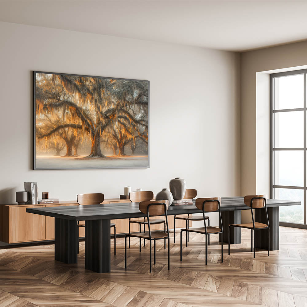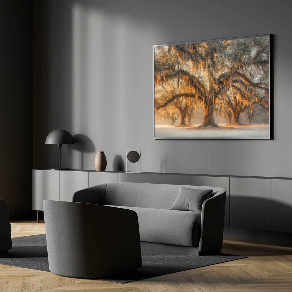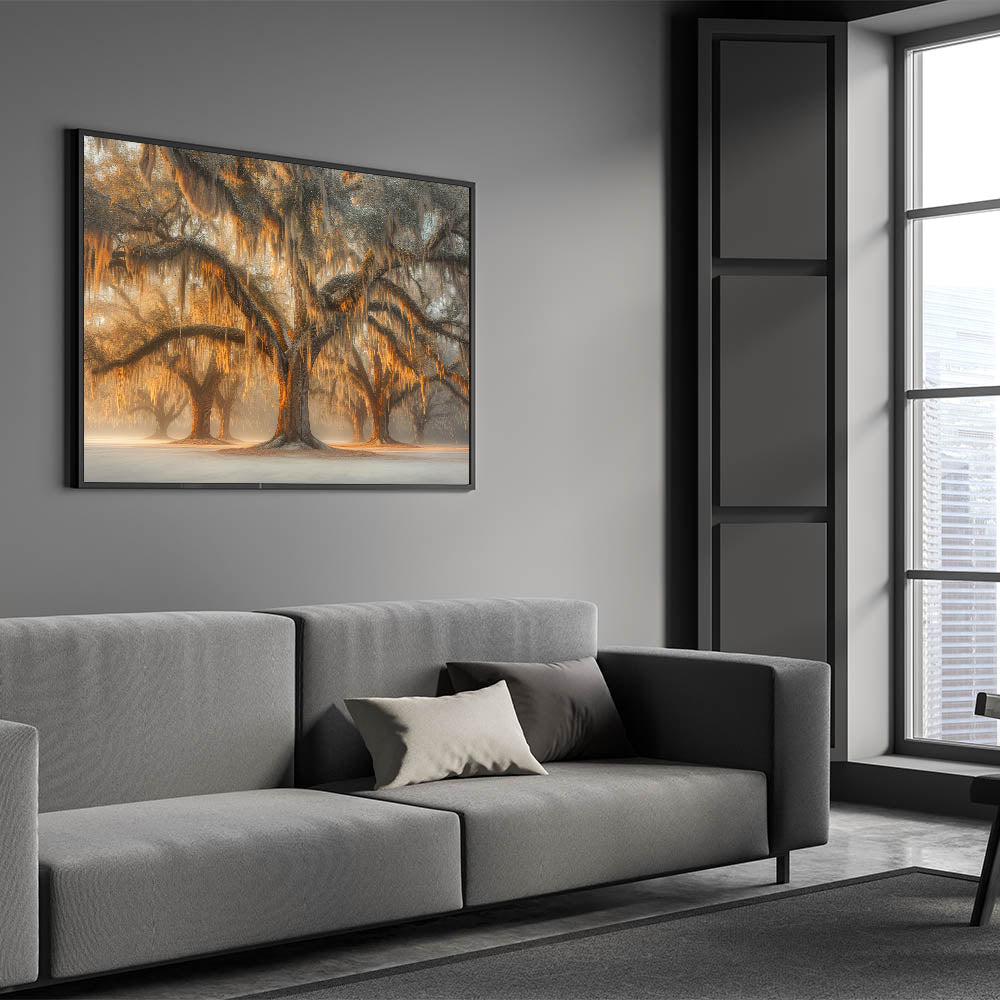 Step into the heart of Louisiana’s cultural landscape with this captivating wall art featuring majestic oak trees draped in Spanish moss. The warm golden light filtering through the moss-covered branches creates an ethereal, almost dreamlike atmosphere that perfectly captures the beauty of Louisiana’s iconic southern charm. This piece, part of our Louisiana Cultural Art collection, embodies the natural beauty and history that define the Pelican State.