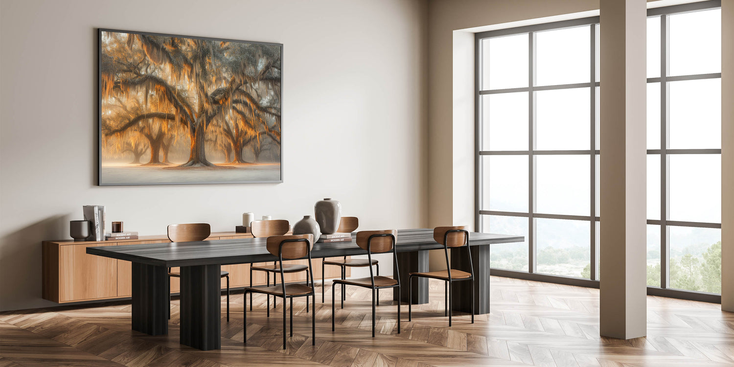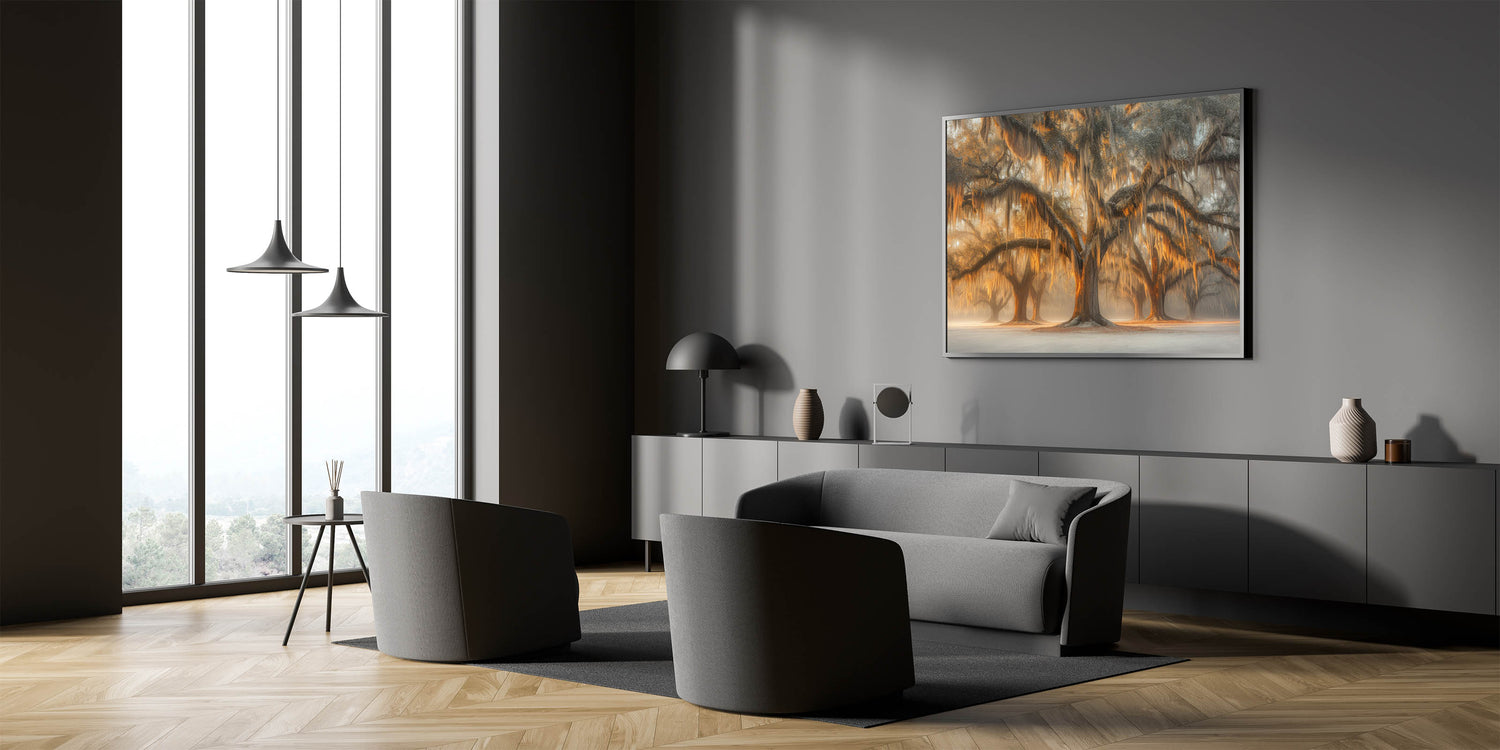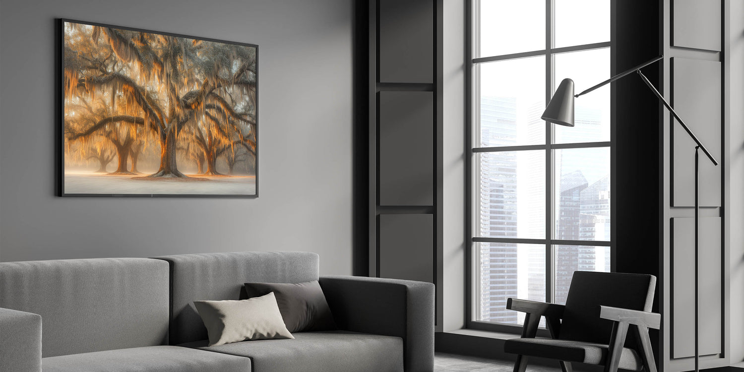 Step into the heart of Louisiana’s cultural landscape with this captivating wall art featuring majestic oak trees draped in Spanish moss. The warm golden light filtering through the moss-covered branches creates an ethereal, almost dreamlike atmosphere that perfectly captures the beauty of Louisiana’s iconic southern charm. This piece, part of our Louisiana Cultural Art collection, embodies the natural beauty and history that define the Pelican State.