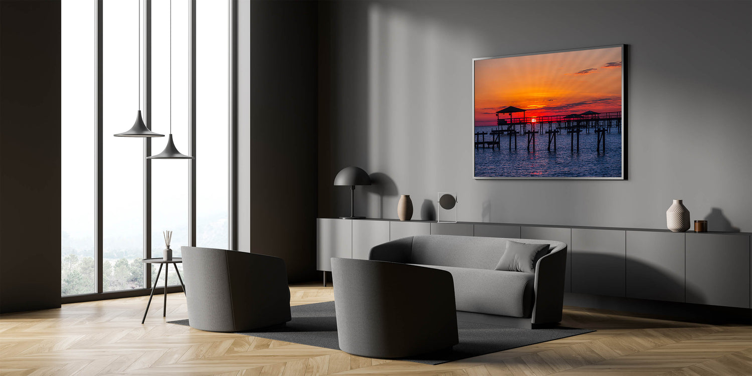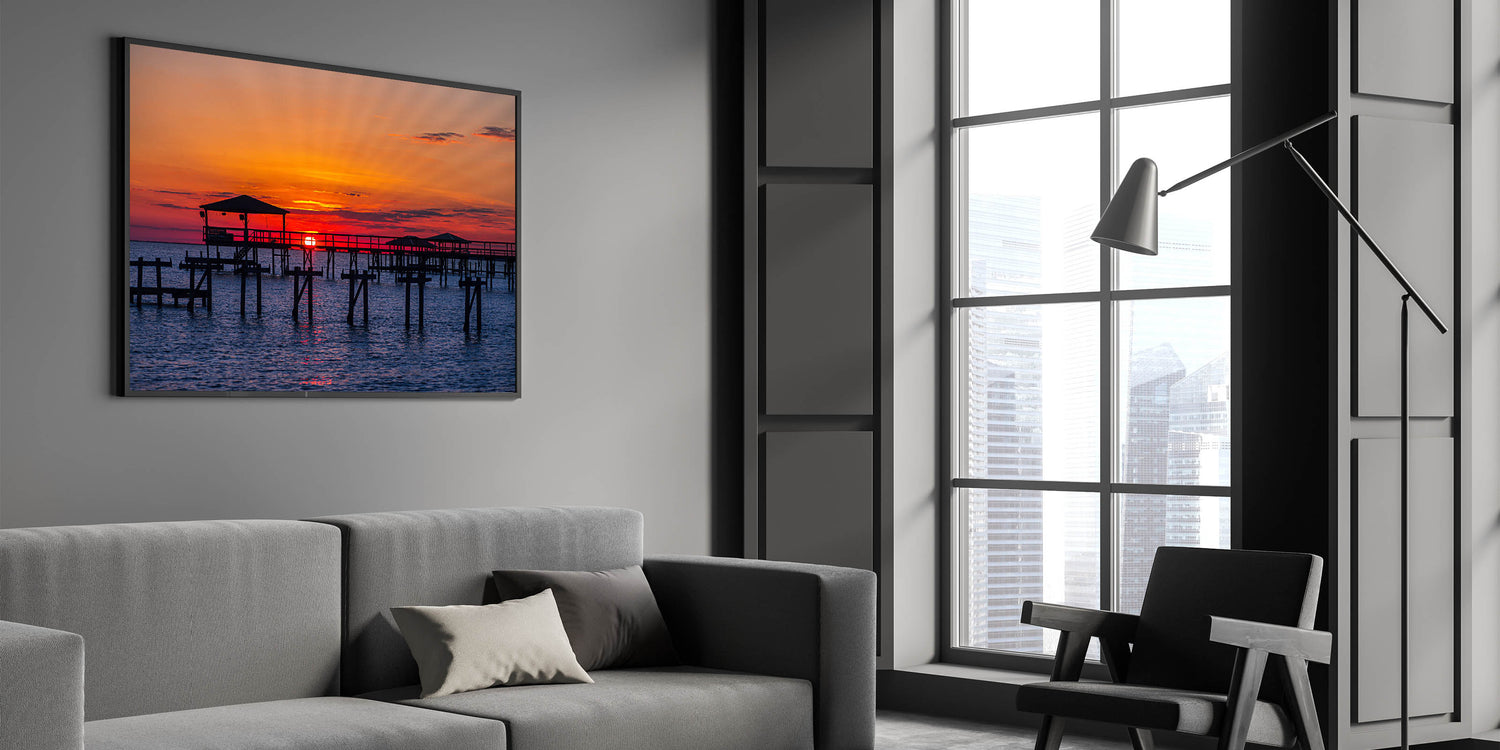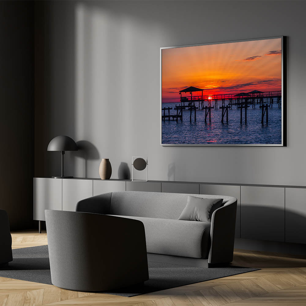 - High-resolution print of a Louisiana sunset over a scenic pier and water.