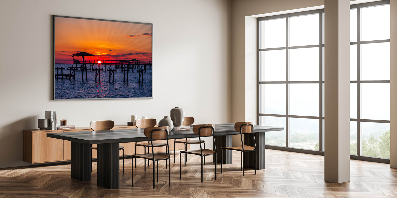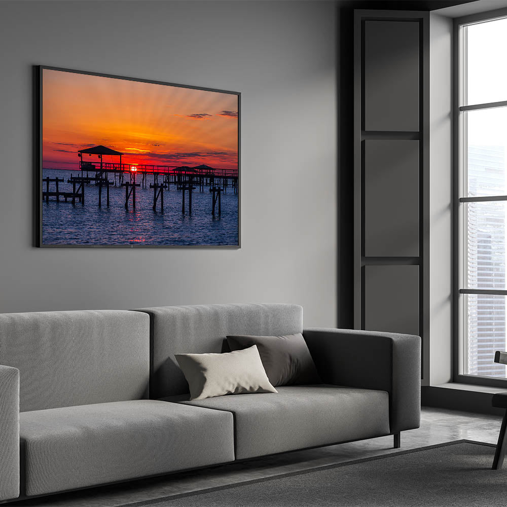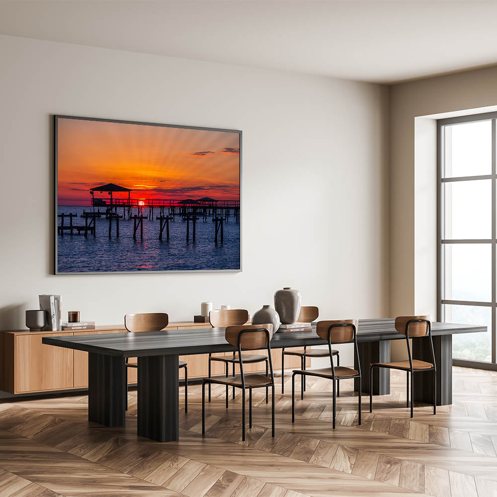 Immerse yourself in the breathtaking beauty of a Louisiana sunset with this captivating wall art. The artwork showcases a vibrant sky transitioning from warm orange and red hues as the sun dips behind a wooden pier over the water. This serene scene captures the peaceful essence of Louisiana’s coastal life, making it a perfect addition to any space where tranquility and beauty are valued.