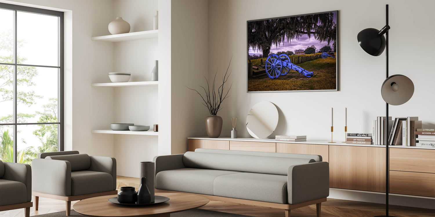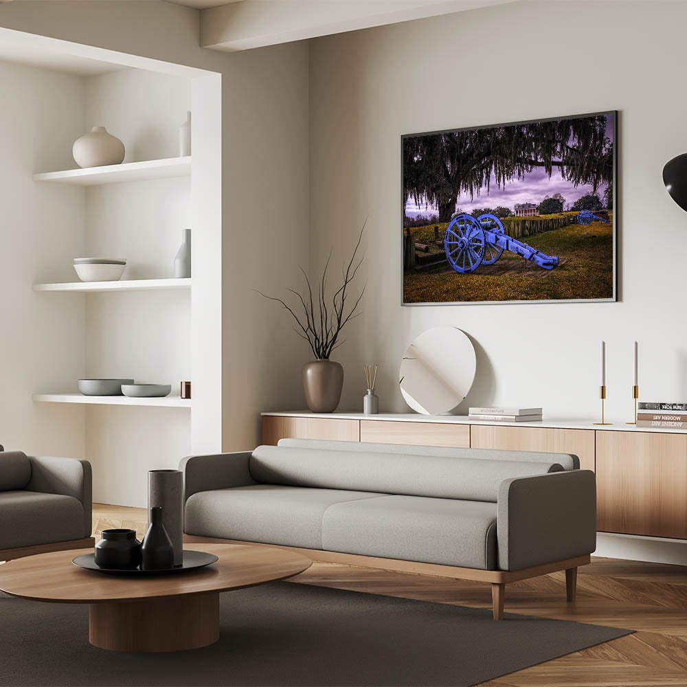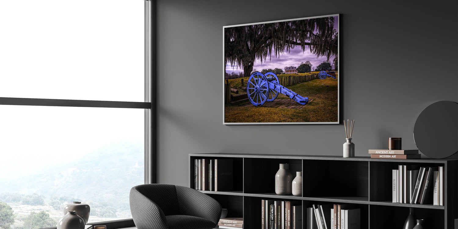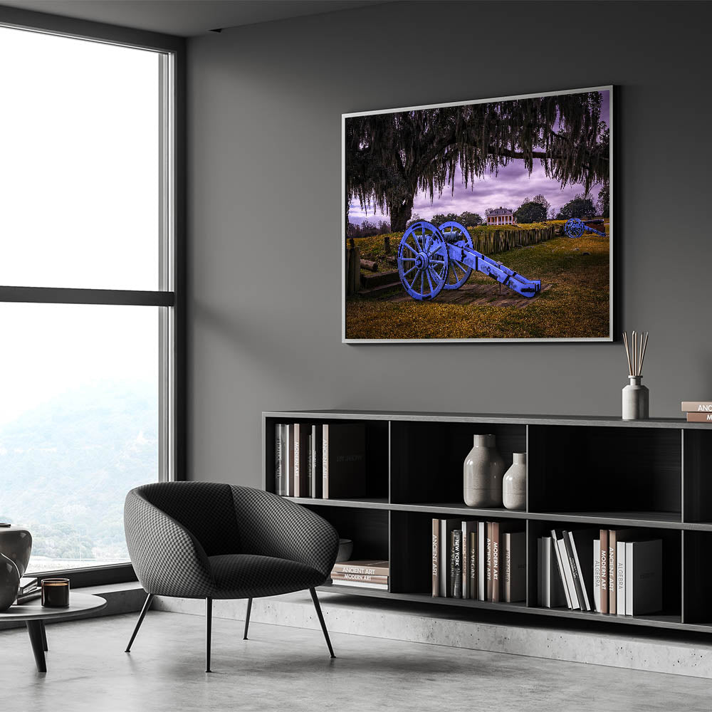 Bring the rich history of Louisiana into your space with this captivating wall art from our Louisiana Scenery by Region collection. This stunning piece showcases a serene landscape of historic New Orleans, featuring vividly detailed cannons under the shade of a moss-draped tree, with a historic plantation-style house in the background. The artwork beautifully captures the deep connection between Louisiana's vibrant past and the tranquil beauty of its landscapes.