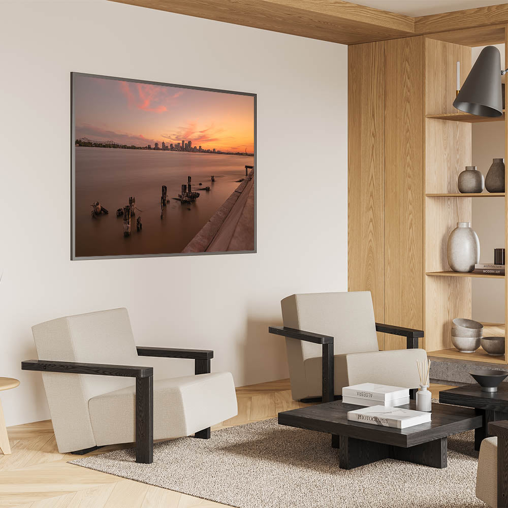 Experience the stunning beauty of New Orleans with this captivating wall art featuring the city’s iconic skyline at sunset. The warm hues of the sky reflect over the Mississippi River, creating a peaceful and elegant scene that embodies the charm and allure of Louisiana’s most famous city. This artwork is part of our New Orleans Skyline Art collection and is perfect for anyone who loves the unique blend of culture, history, and natural beauty that New Orleans represents.