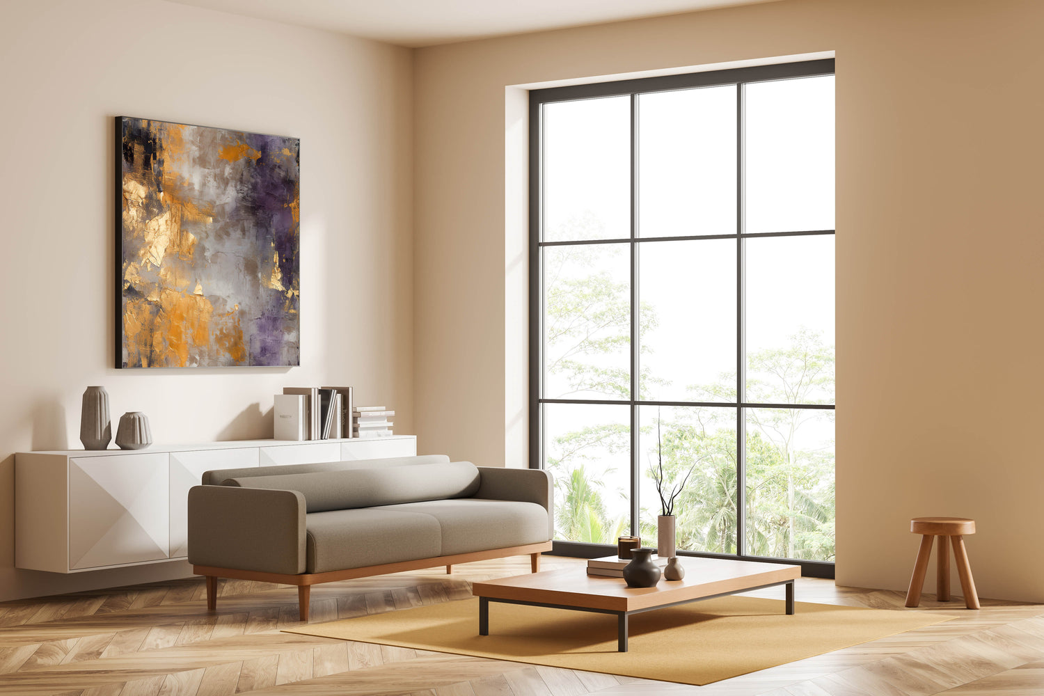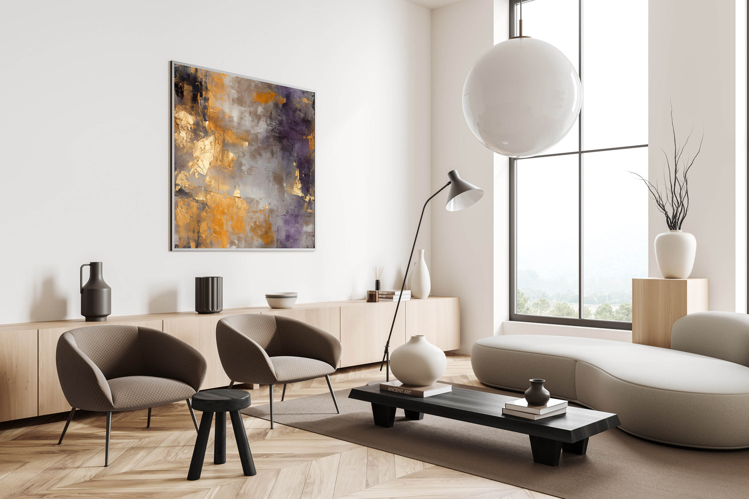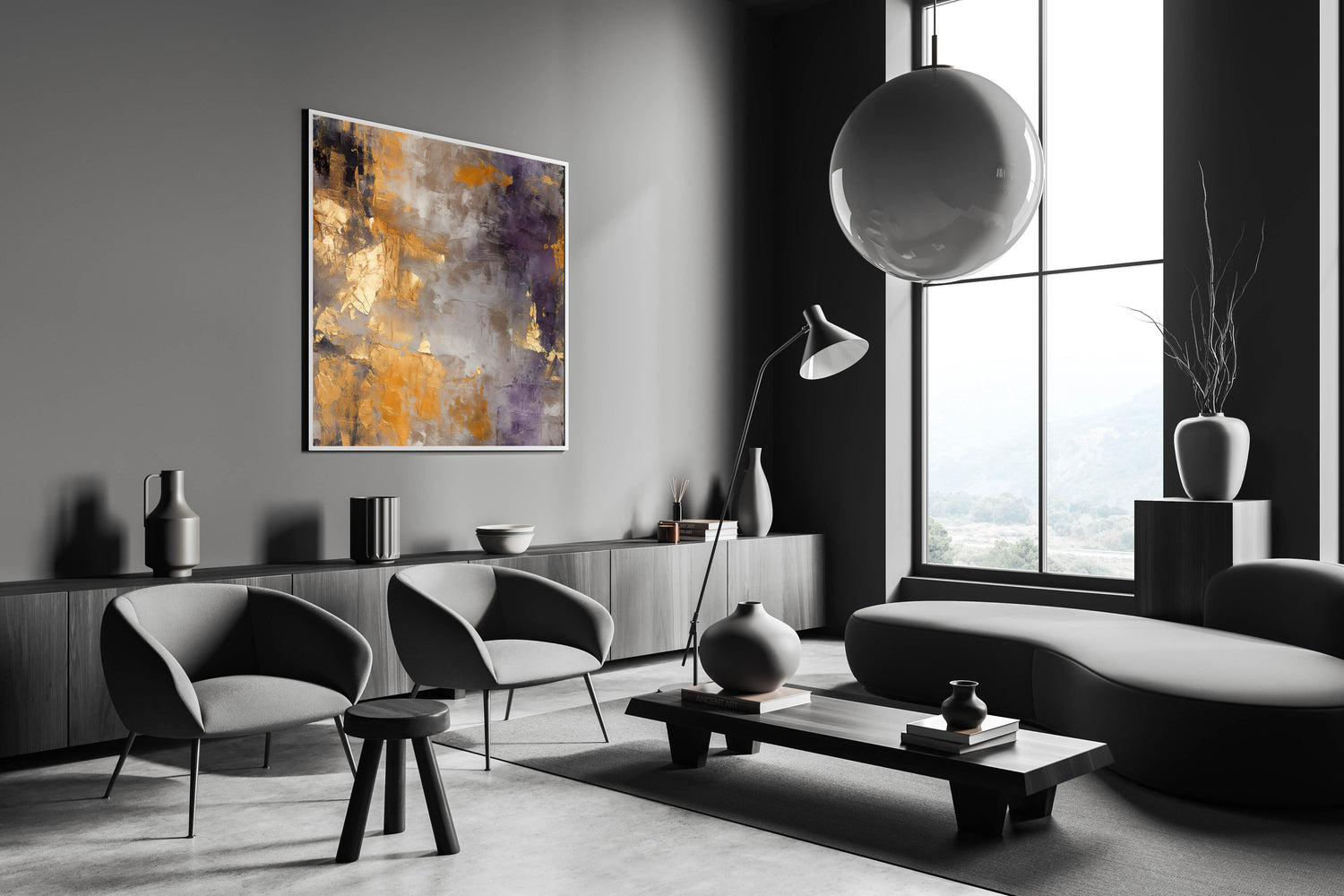 Introduce a touch of luxury to your space with this captivating abstract strokes wall art. This piece features a stunning blend of gold, purple, and gray tones, creating a harmonious and sophisticated look. The dynamic brushstrokes and rich color palette make it an excellent choice for enhancing modern, minimalist, or transitional interiors. The interplay of warm gold against deep purple and soft gray brings an elegant, textured aesthetic to your decor.