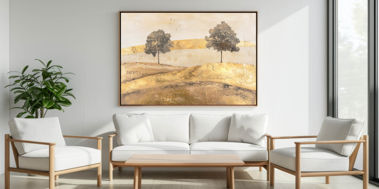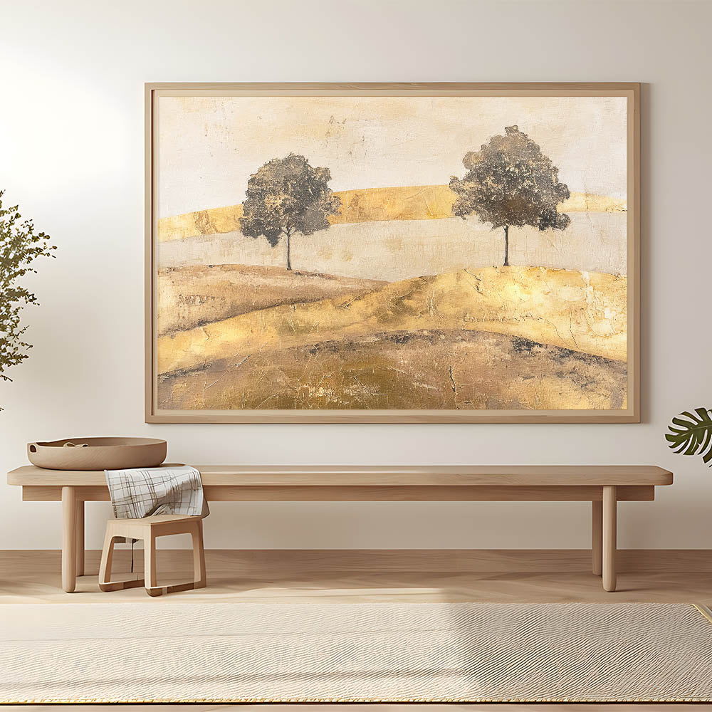 This contemporary landscape print is ideal for living rooms, dining rooms, or offices. The blend of gold and natural tones captures the beauty of nature in an abstract style, creating a serene yet elegant vibe that complements both modern and classic decor.