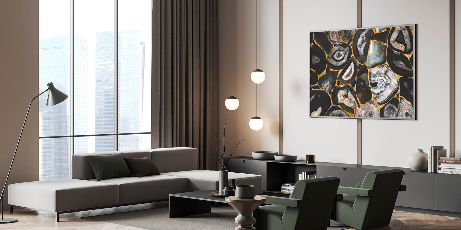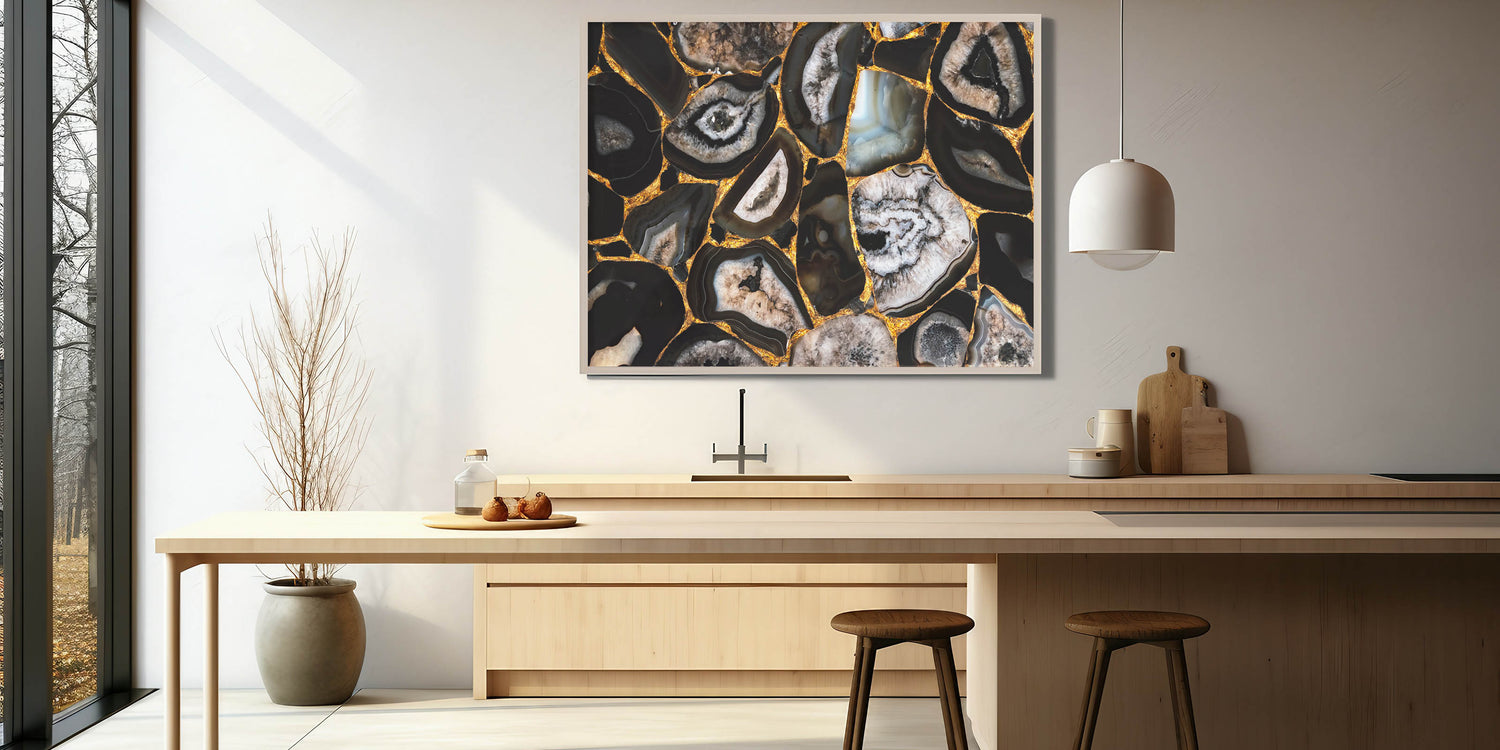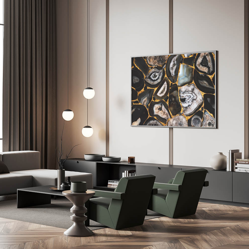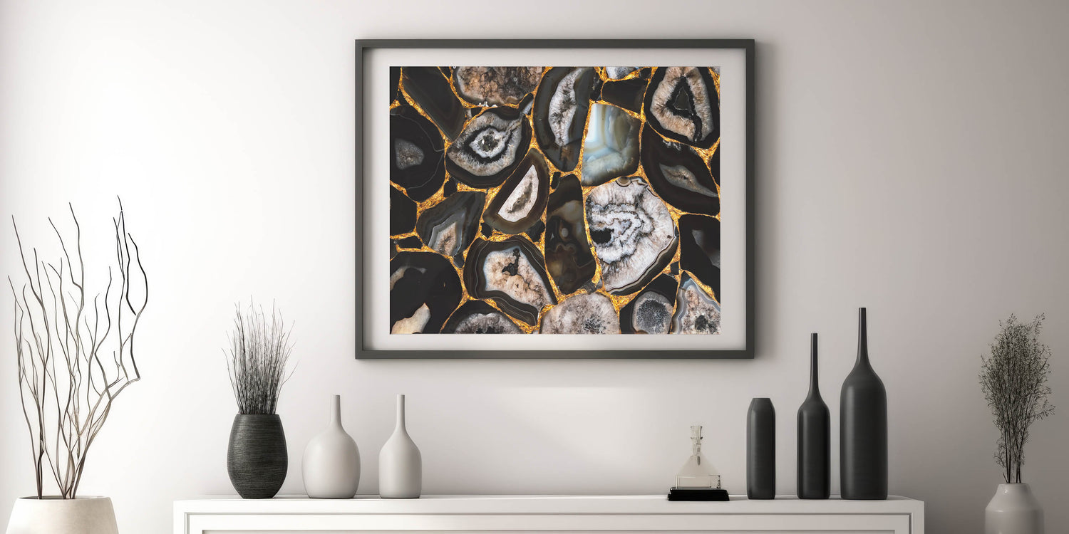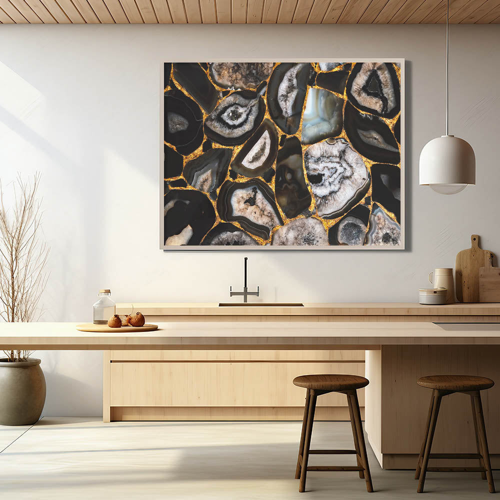 Add a striking and luxurious touch to your space with this stunning abstract nature print. The "Bold Geode Patterns with Gold Accents" canvas art features intricate geode formations in deep black, grey, and earthy tones, highlighted by vibrant gold accents. The natural beauty of the geode patterns combined with the shimmering gold details creates a dramatic and eye-catching piece that is perfect for modern and contemporary interiors.