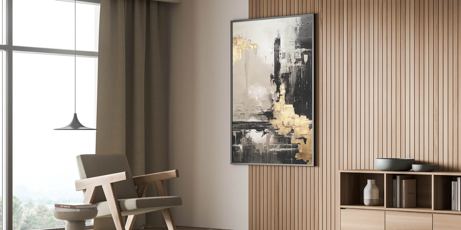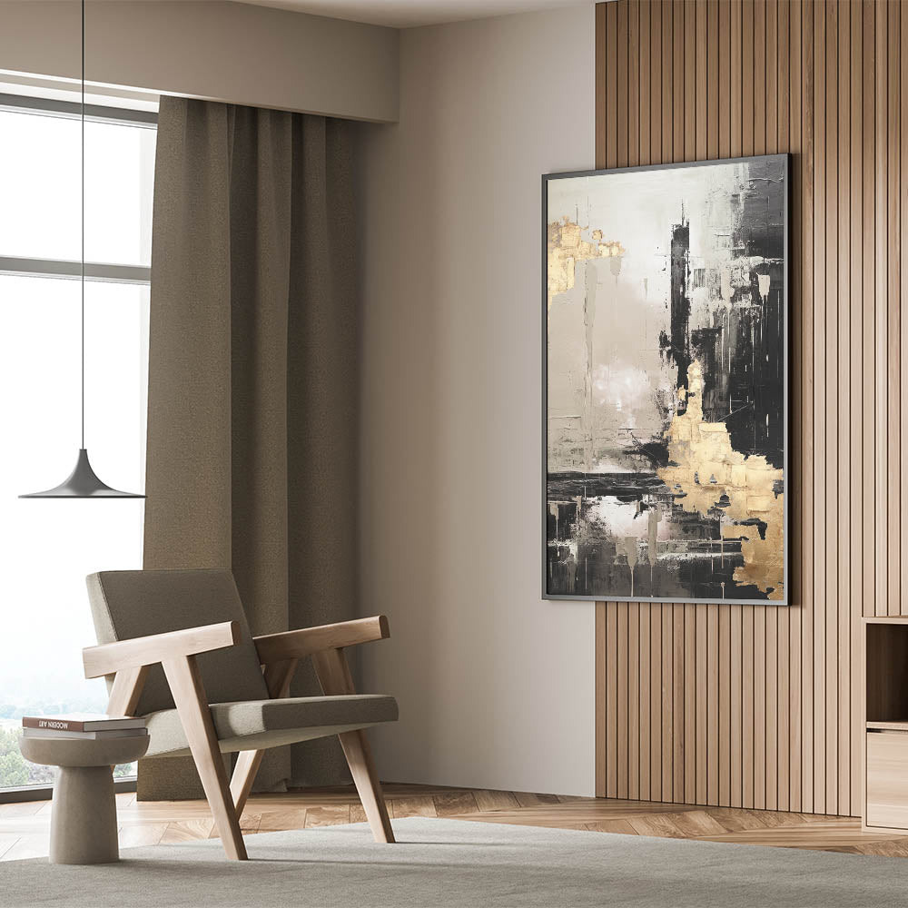 Elevate your space with this luxurious abstract art piece, featuring striking gold leaf accents that add a touch of opulence to its modern industrial design. The artwork blends a mix of neutral tones with bold black and gold, creating a visually stunning composition that is both edgy and sophisticated. The textured brushstrokes and gold detailing give the piece depth and dimension, making it an ideal focal point for contemporary interiors.