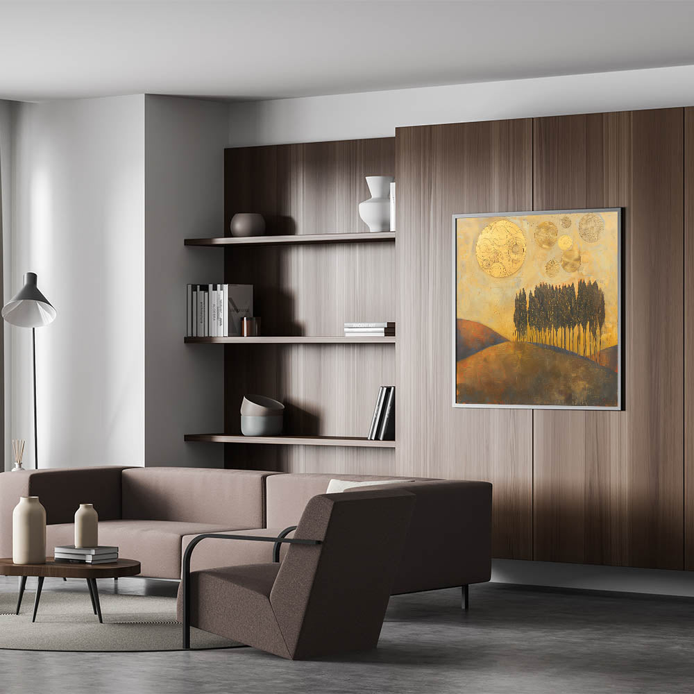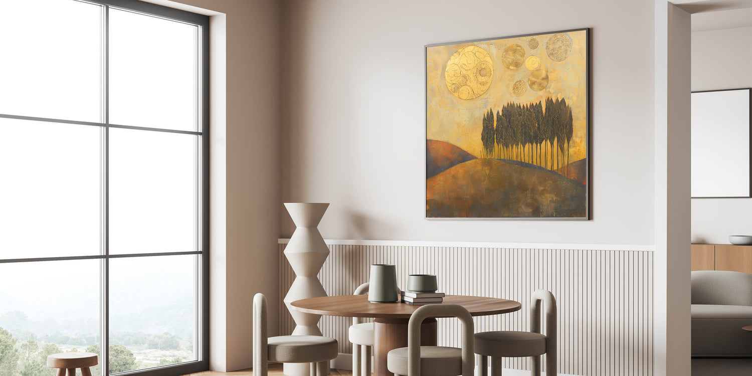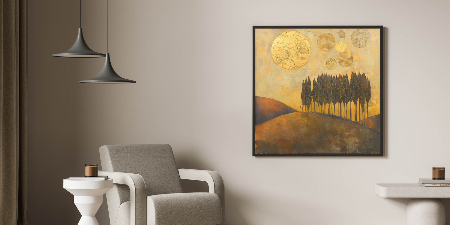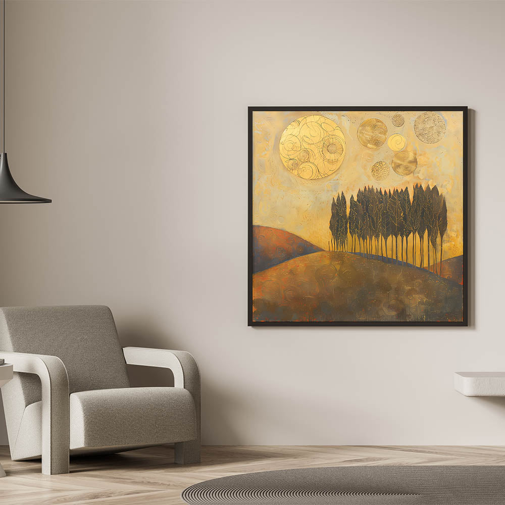 Add a touch of mystique to your decor with this modern landscape abstract, featuring a golden celestial sun above a line of elegant trees on rolling hills. The warm hues of gold, brown, and muted orange blend beautifully to create a surreal, dreamlike landscape that draws the eye and sparks the imagination. Perfect for those who appreciate unique, nature-inspired art, this piece brings warmth and depth to any room.