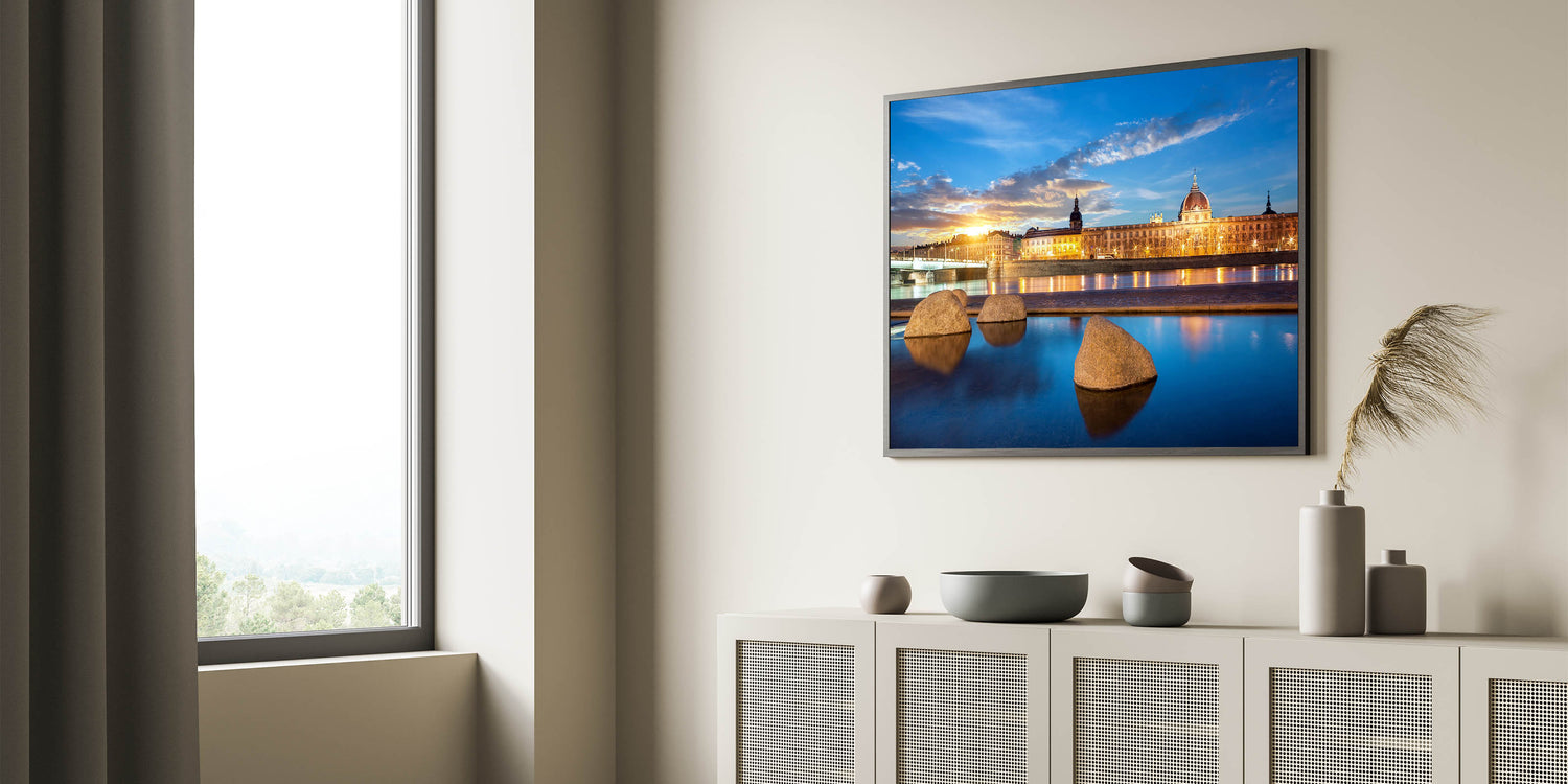 - High-quality print highlighting the soft colors of a sunset over Lyon, with detailed architecture and reflections.