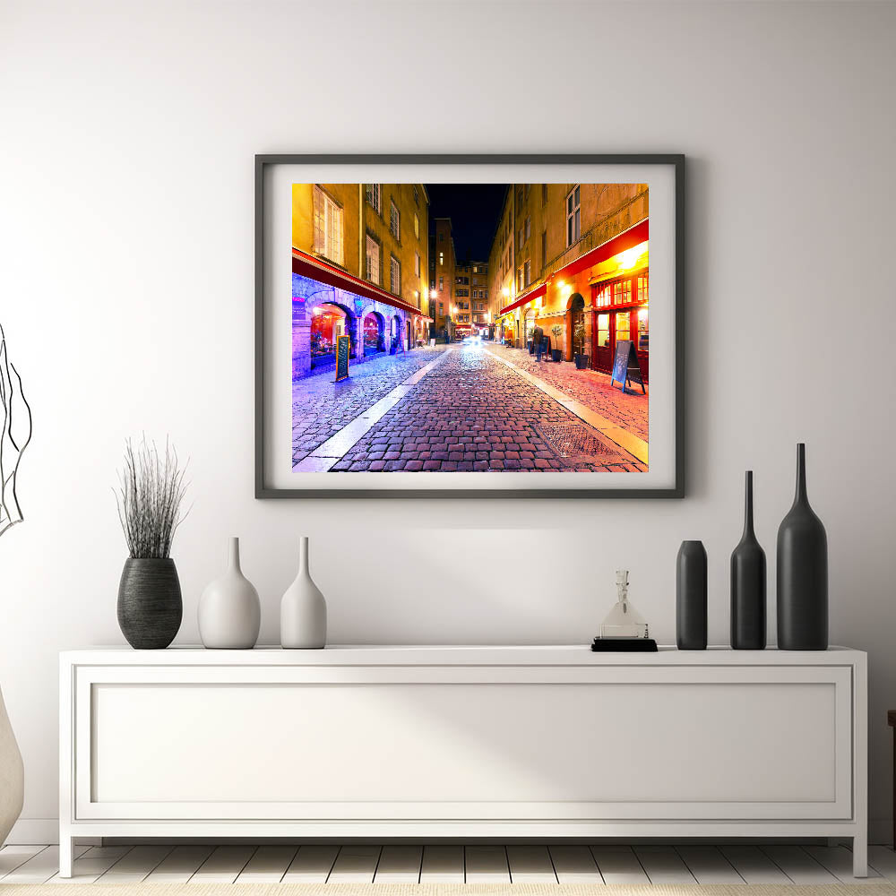 Experience the charm of Lyon’s historic streets with this vibrant cityscape print. This beautiful Lyon artwork captures the essence of a lively evening in one of Lyon’s most iconic districts, with brightly lit cafes and cobblestone streets reflecting the warmth and life of the city at night. The colors and details in this artwork make it a perfect addition for those who appreciate vibrant Lyon street scenes and want to bring the charm of France into their space.