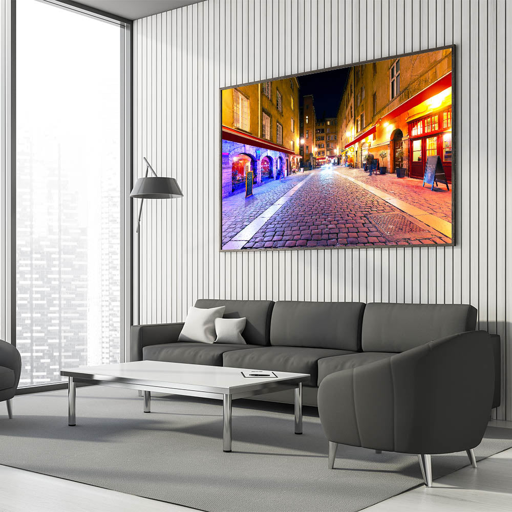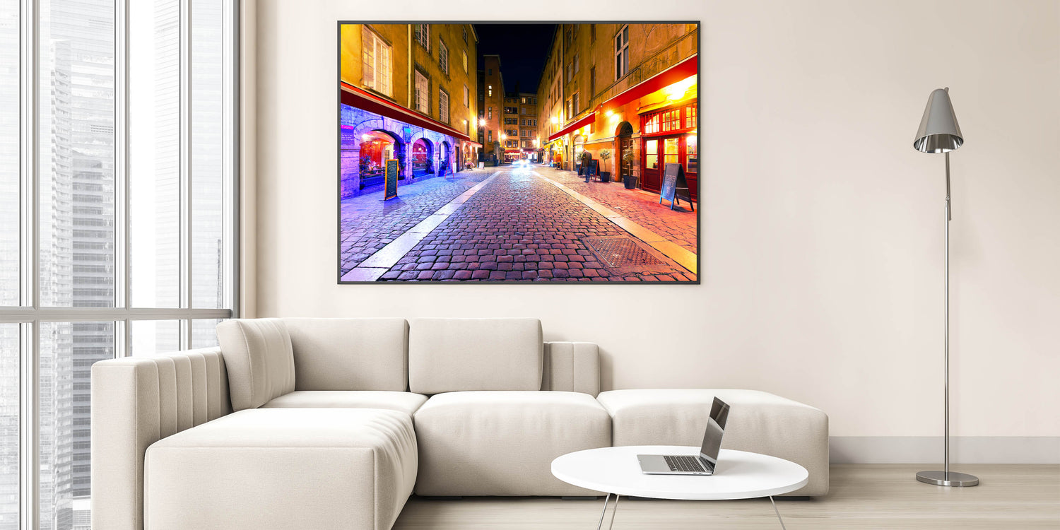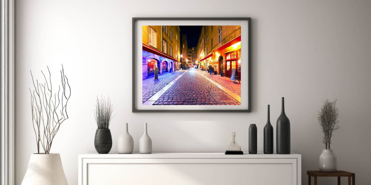 - High-quality prints showcasing the colorful, illuminated streets of Lyon.