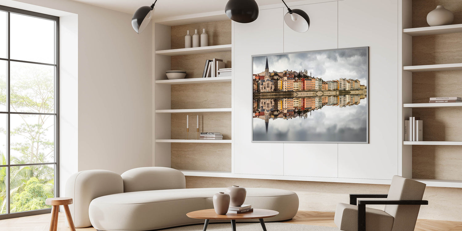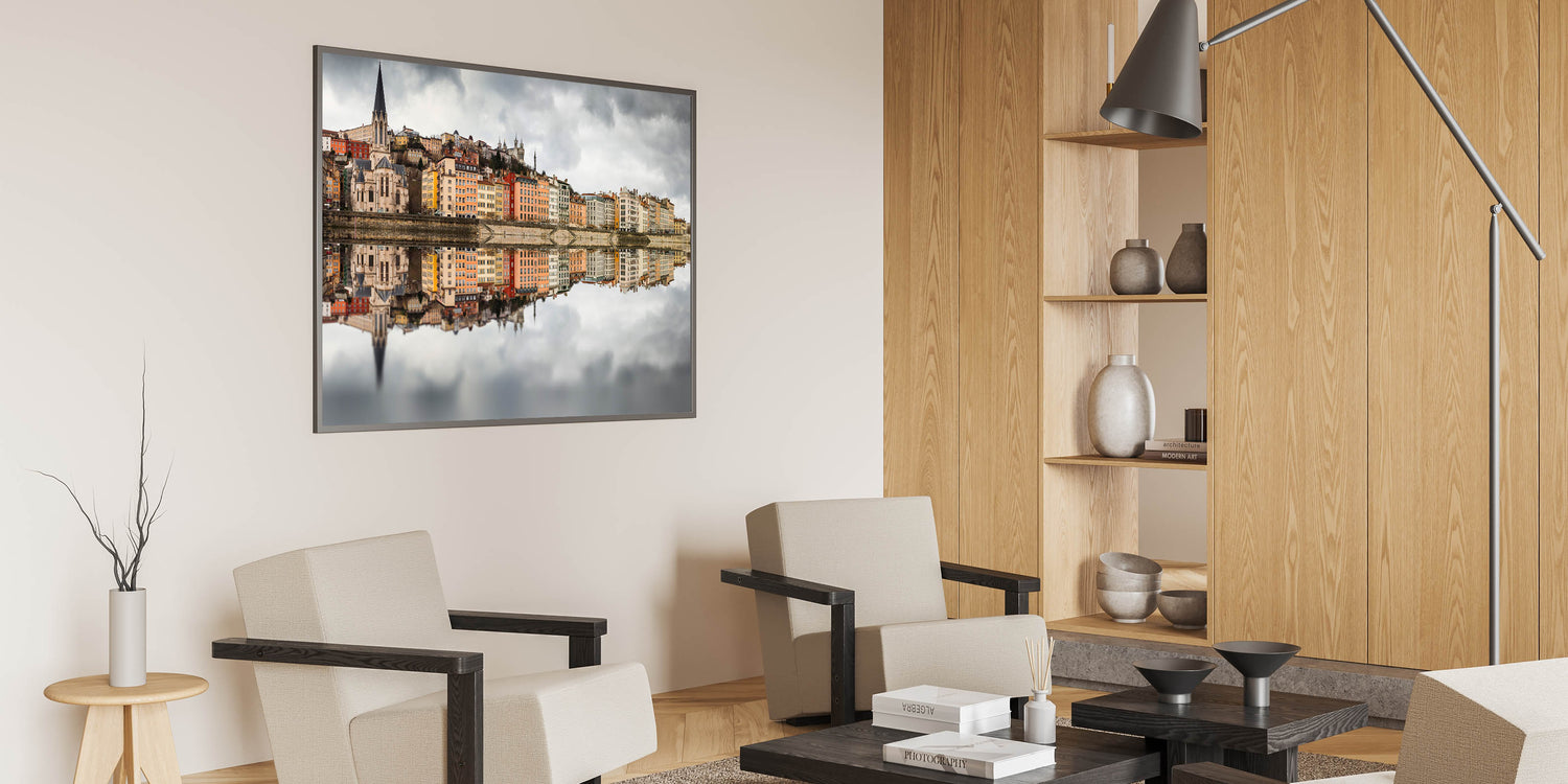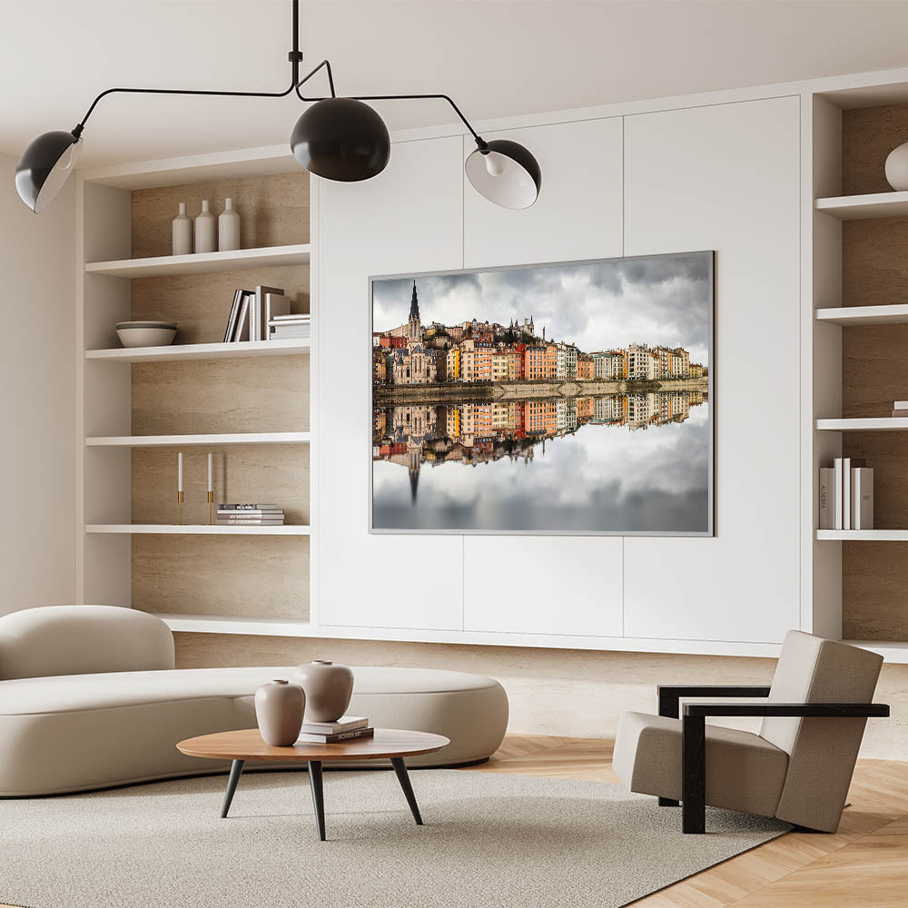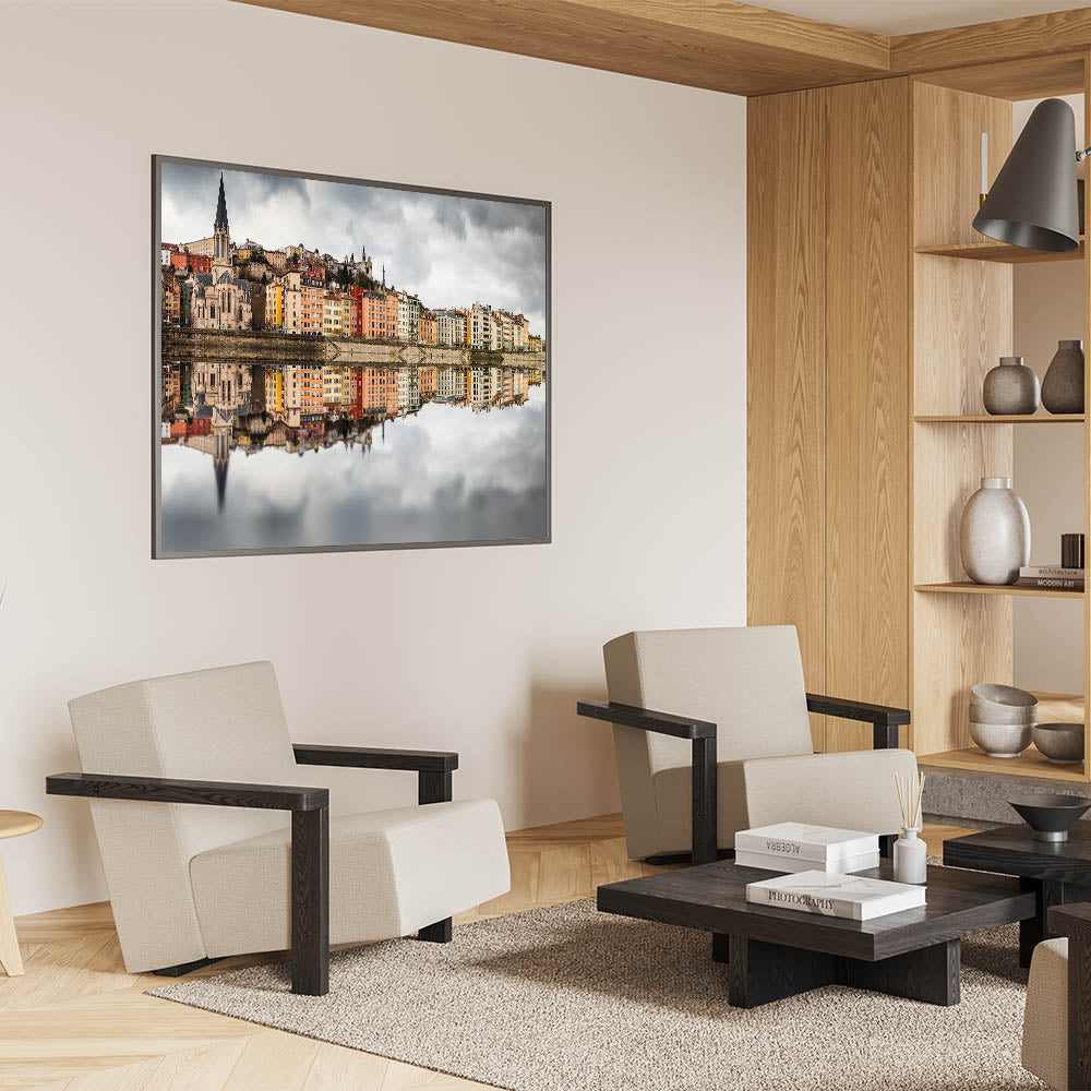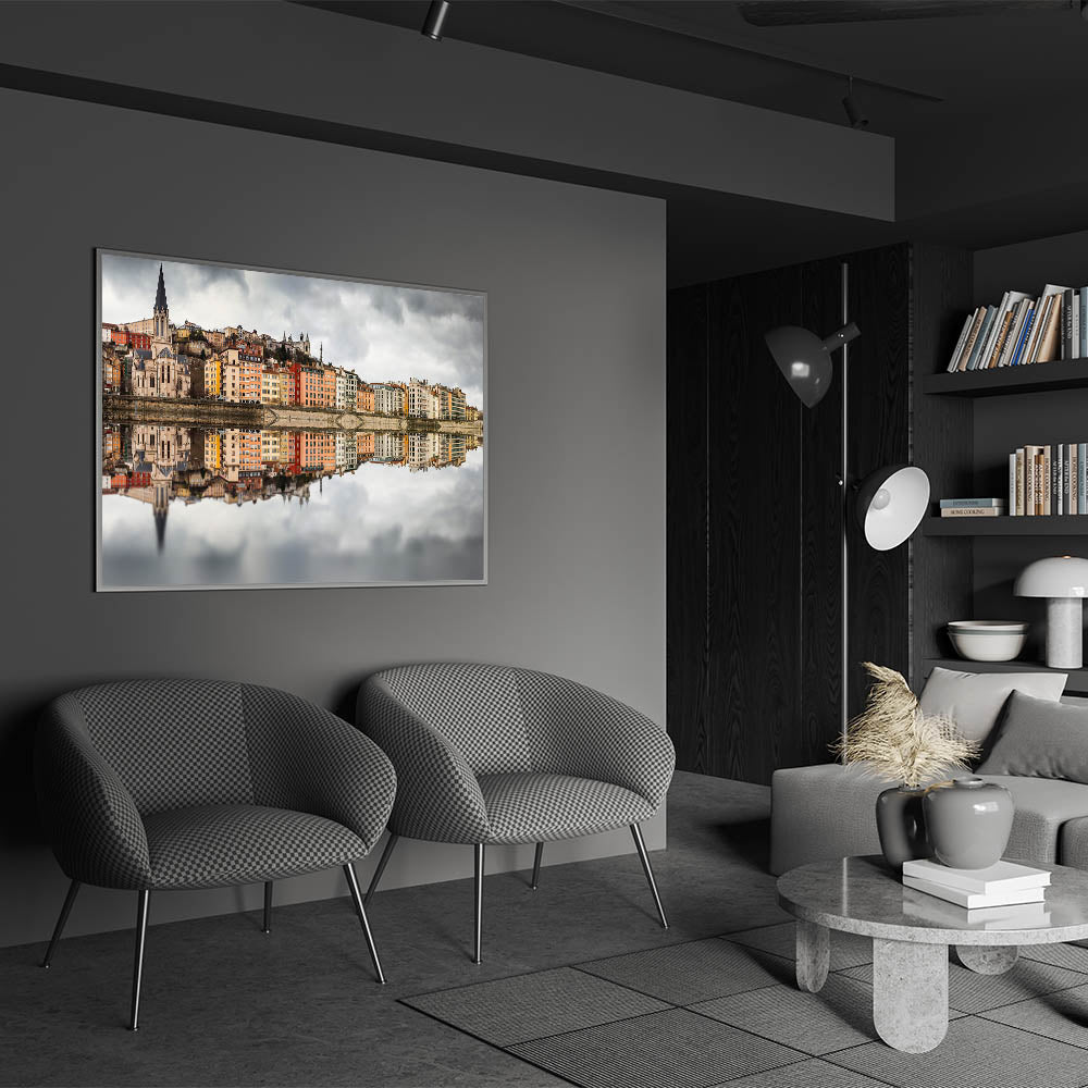 Add a touch of elegance to your home with this historic Lyon canvas, featuring the beautiful and colorful reflection of Lyon’s cityscape on the Saône River. The image captures the vibrant colors of the buildings, set against a dramatic cloudy sky, creating a stunning contrast. This Lyon cityscape print is perfect for anyone who appreciates the charm of French wall decor and loves the artistic blend of nature and architecture in urban scenes.