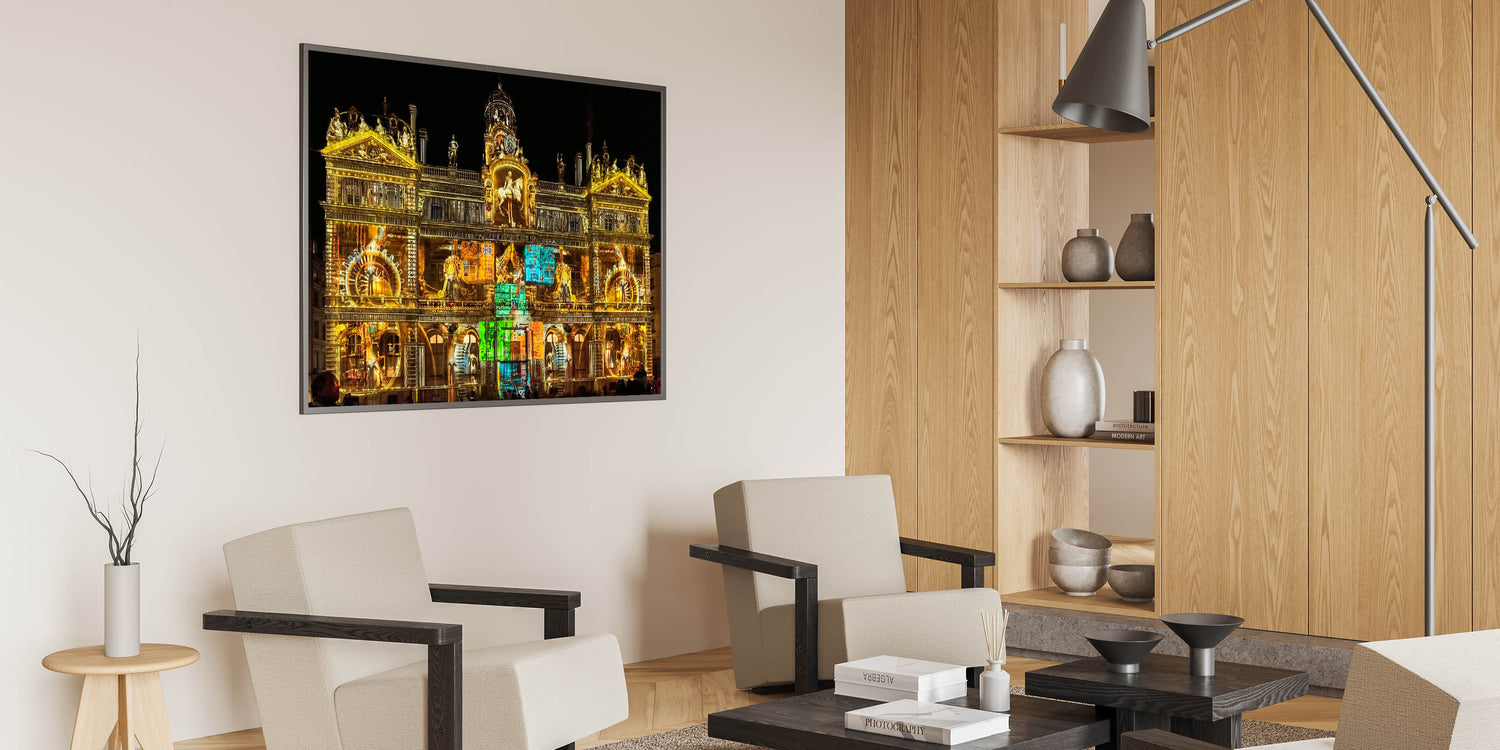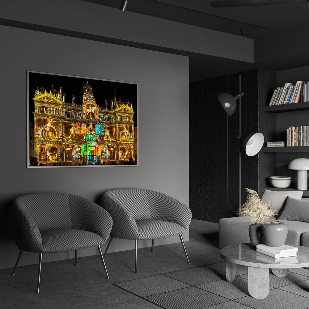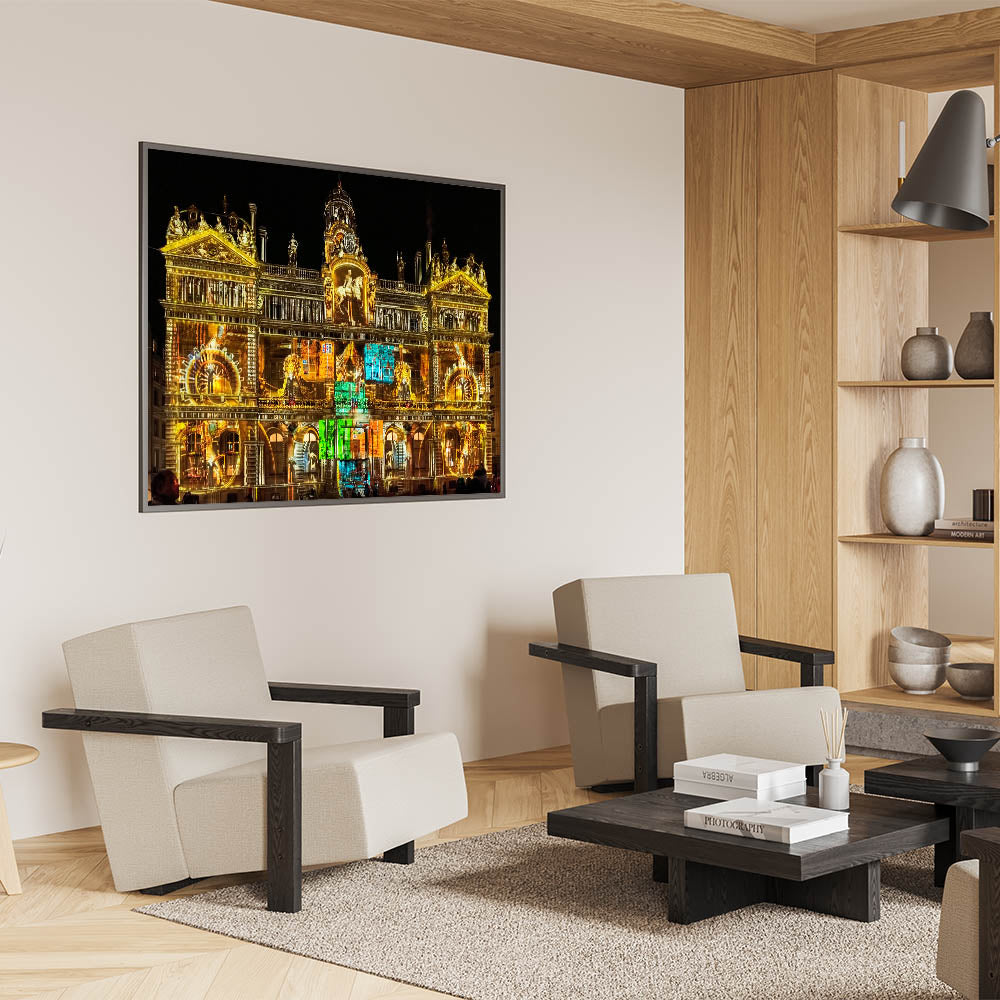 Experience the vibrant magic of Lyon’s Festival of Lights with this stunning Lyon wall art, featuring the illuminated façade of the historic Hôtel de Ville. This dazzling artwork captures the intricacies of the light show, bringing Lyon’s festive spirit and rich architecture to life. Ideal for anyone who appreciates French decor and the enchanting atmosphere of iconic French landmarks, this piece will add a dynamic and colorful touch to any room.