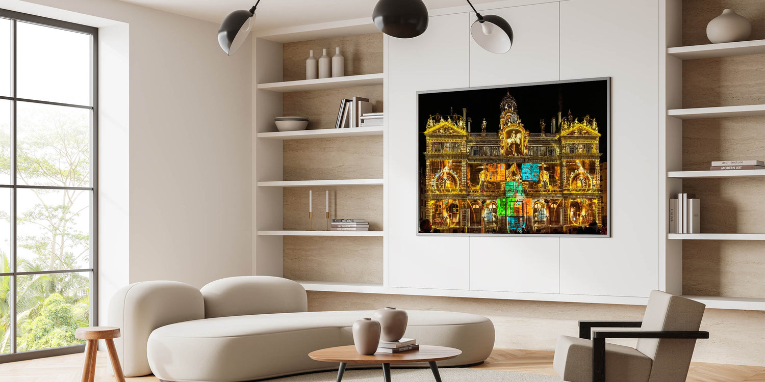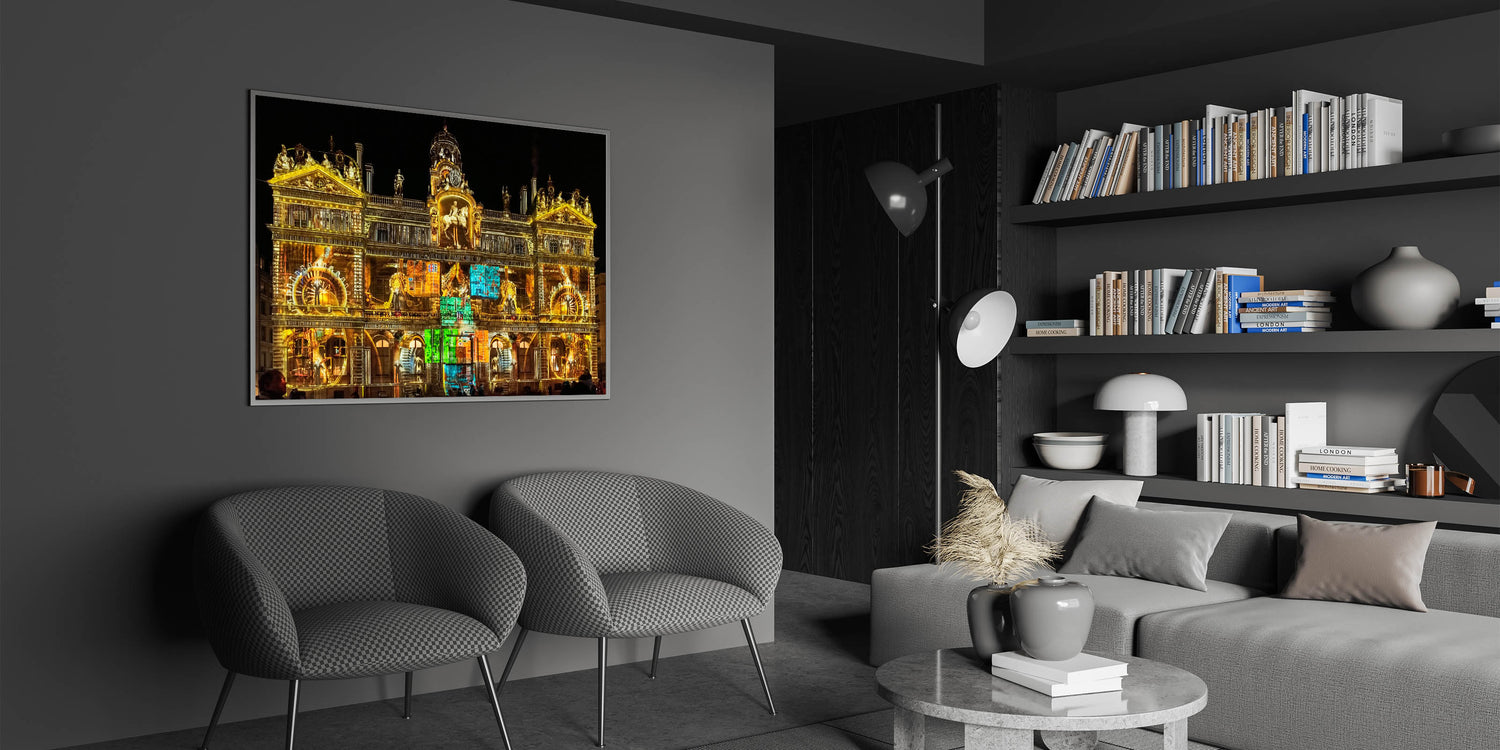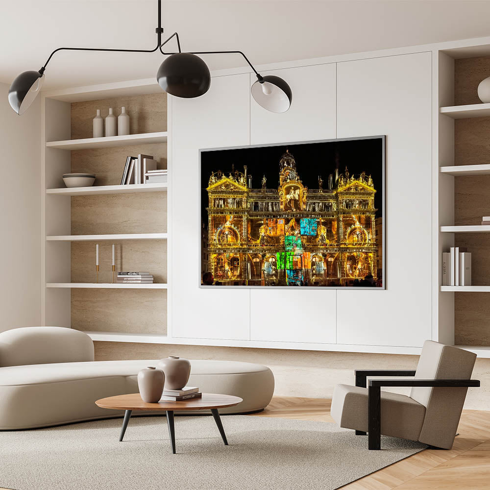 Experience the vibrant magic of Lyon’s Festival of Lights with this stunning Lyon wall art, featuring the illuminated façade of the historic Hôtel de Ville. This dazzling artwork captures the intricacies of the light show, bringing Lyon’s festive spirit and rich architecture to life. Ideal for anyone who appreciates French decor and the enchanting atmosphere of iconic French landmarks, this piece will add a dynamic and colorful touch to any room.