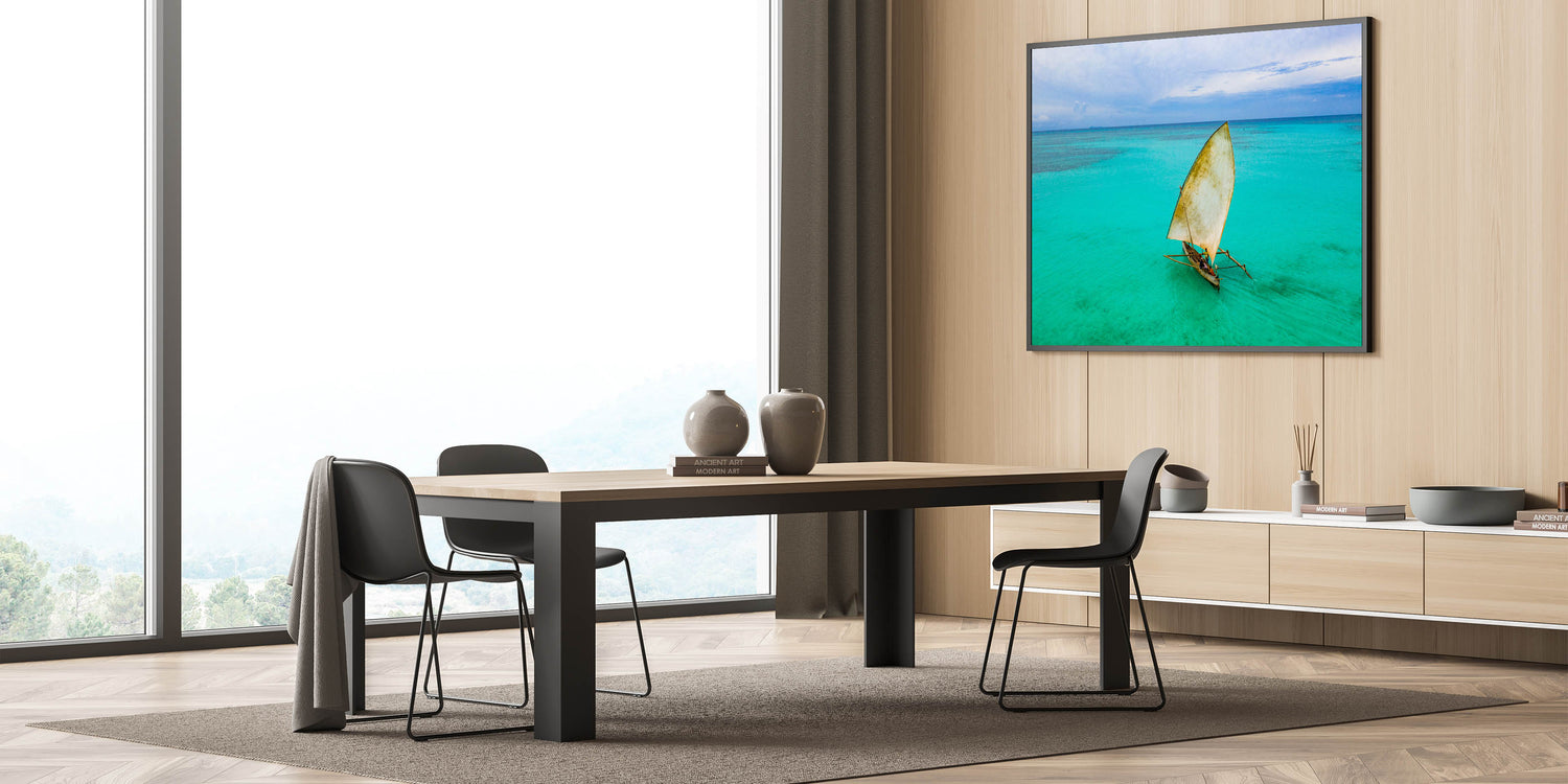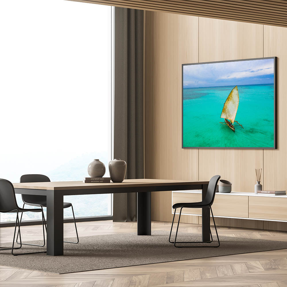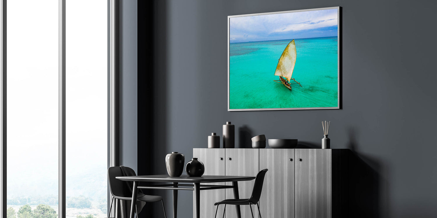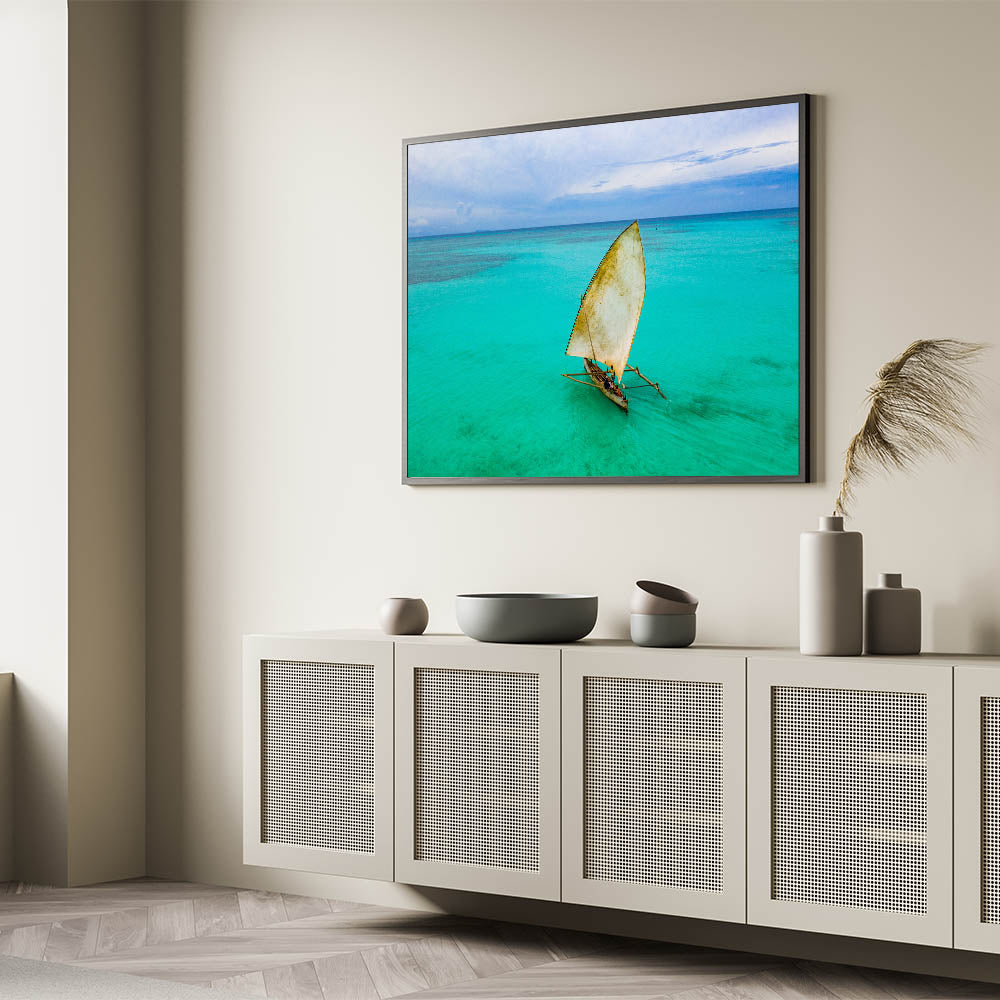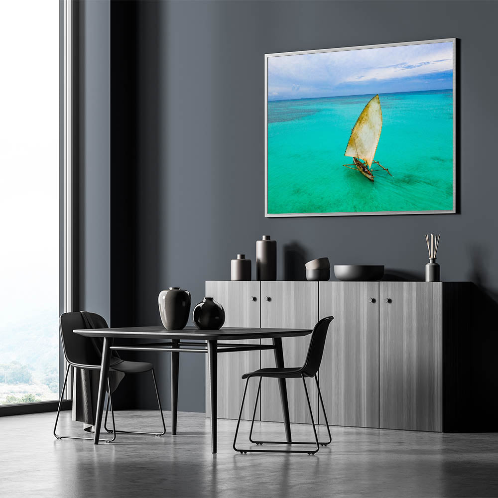 Bring the tranquil beauty of Madagascar’s coastal waters into your home with this stunning wall art. The artwork captures a traditional sailing boat gliding through crystal-clear turquoise waters, creating a serene and peaceful scene. The expansive ocean stretches out to the horizon, evoking a sense of freedom and adventure, while the vivid colors add a refreshing touch to any room.