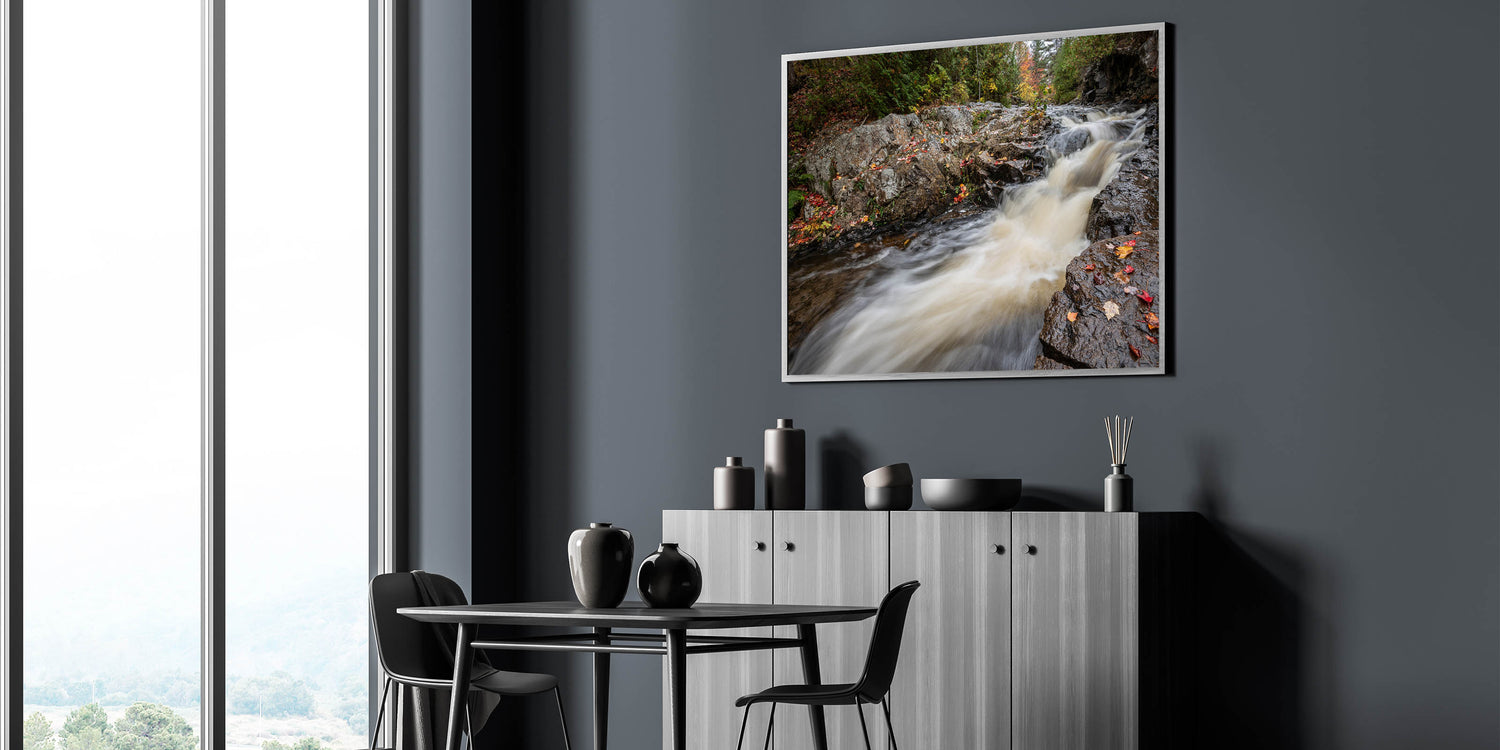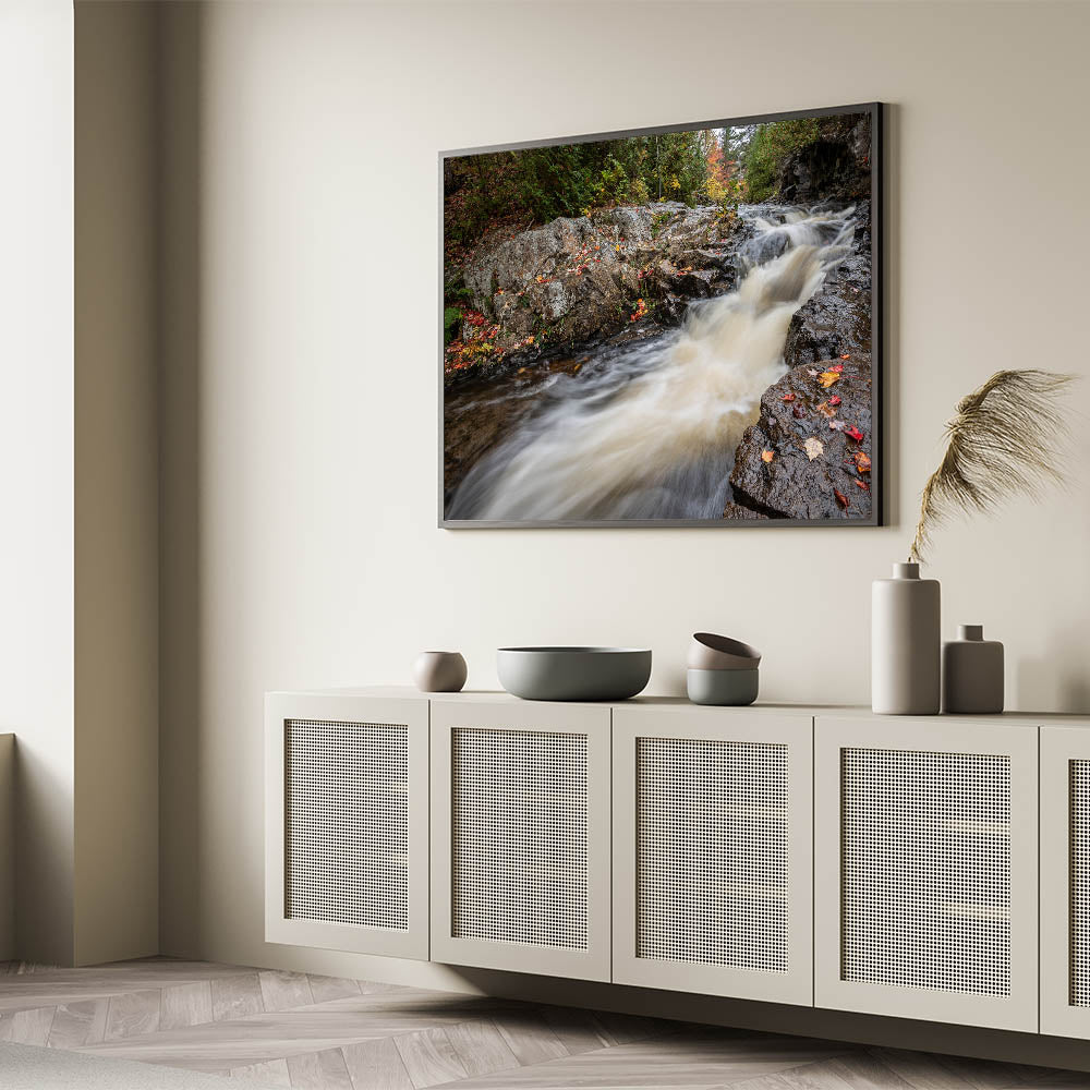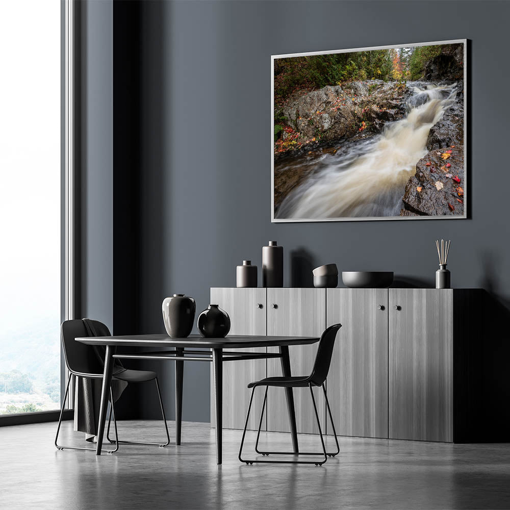 Capture the dynamic beauty of Acadia National Park with this stunning waterfall wall art. This print highlights the rushing waters cascading over rugged rocks, surrounded by autumnal foliage, making it a vibrant and dramatic representation of Maine’s natural landscape. The colors of the leaves combined with the flowing water create a perfect blend of nature’s energy and tranquility.