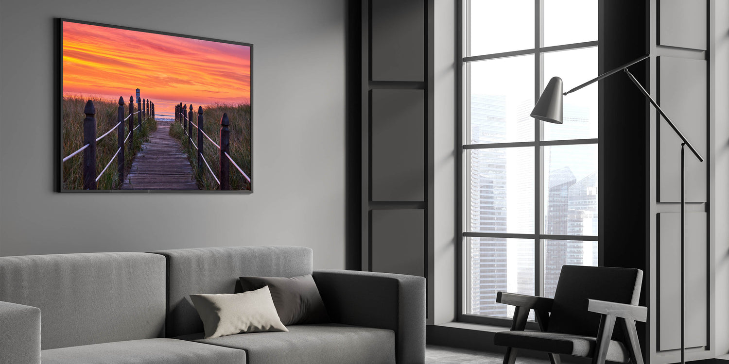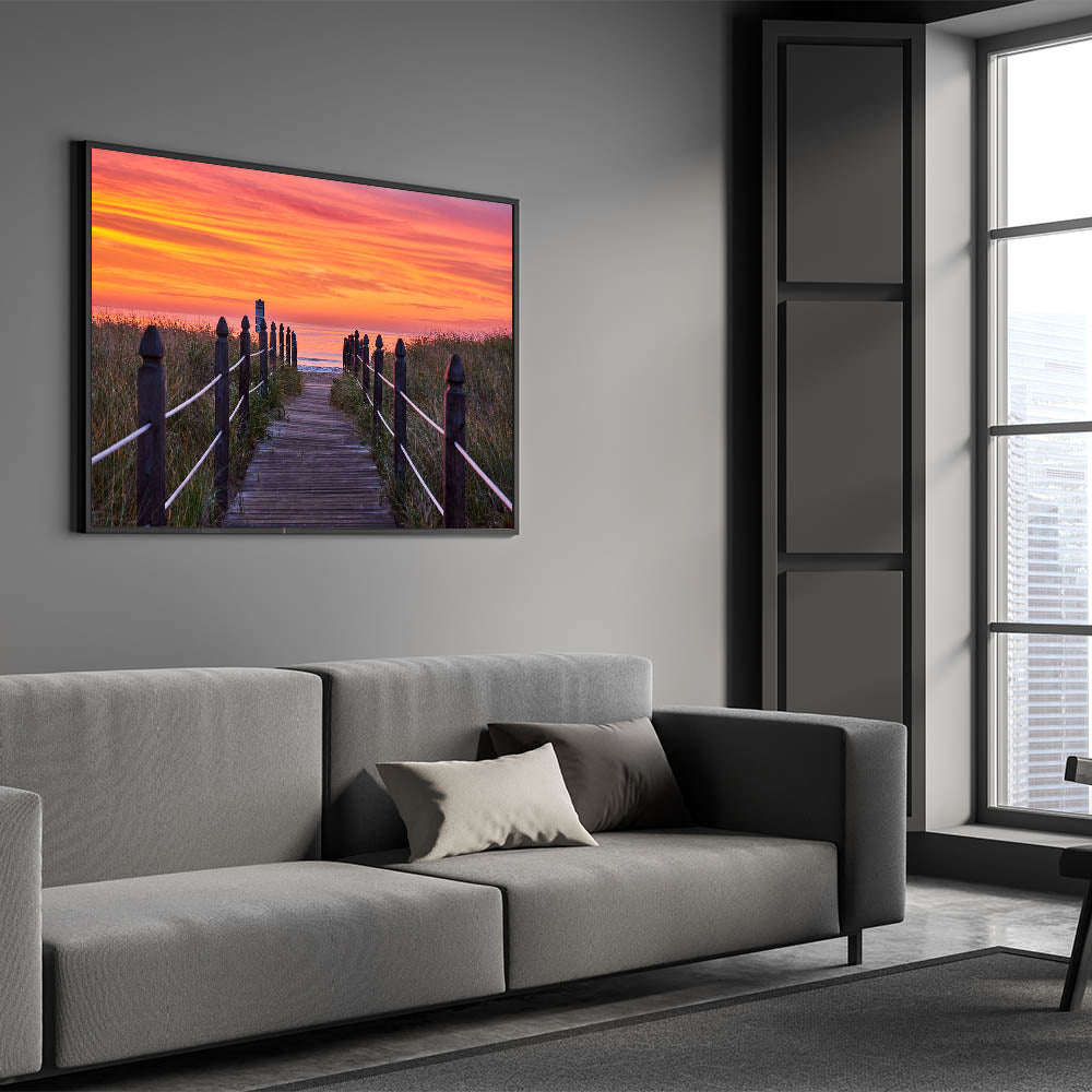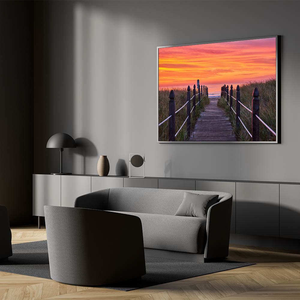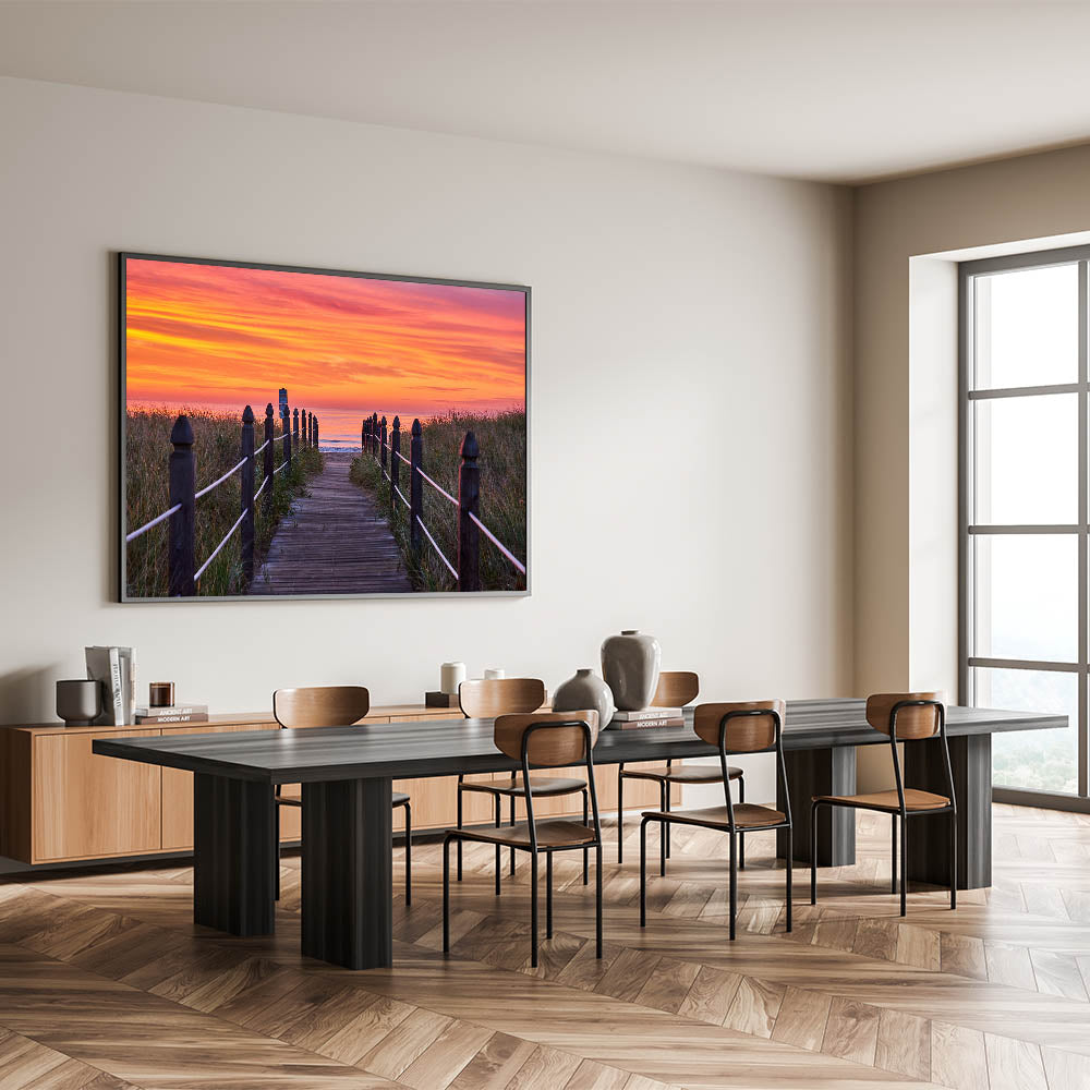 Step into a moment of tranquility with this captivating wall art featuring a wooden pathway leading to the beach at sunset. The sky is ablaze with warm hues of orange and pink, beautifully reflected on the horizon, while the soft grasses frame the scene perfectly. This serene and inviting image is ideal for bringing the calming beauty of a coastal sunset into your home or office, offering a peaceful escape to nature with every glance.