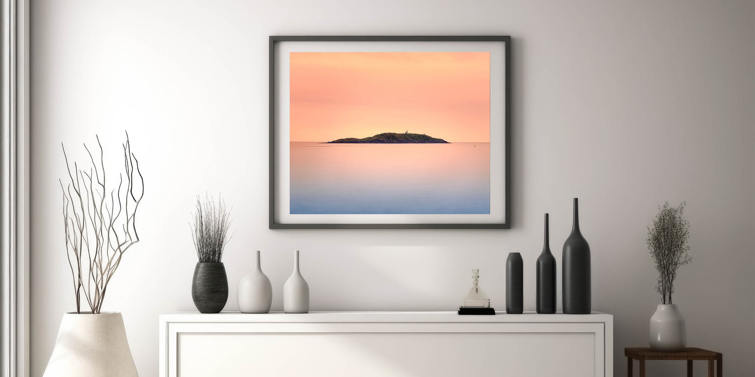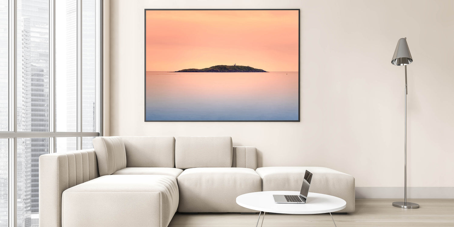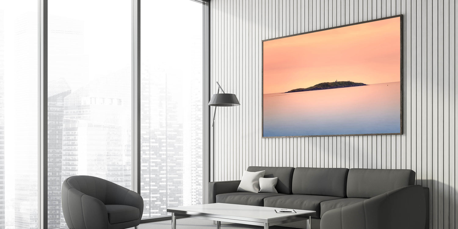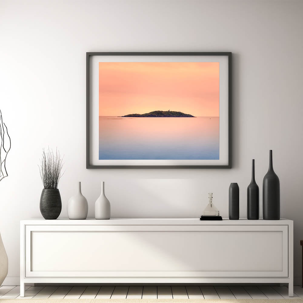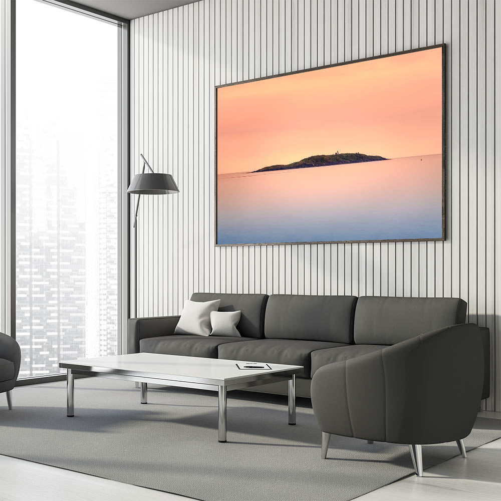 This Wellington skyline photography print captures the peaceful beauty of a distant island at sunset, making it an ideal choice for those who appreciate subtle, serene coastal artwork.