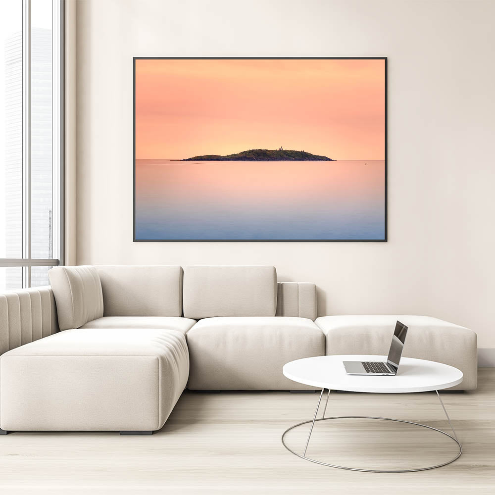 Add a touch of tranquility to your space with this stunning Wellington landscape painting, featuring a peaceful island at sunset. The warm, pastel hues of the sky and the calm waters create a serene and minimalist scene, perfect for those who love the simplicity and beauty of coastal settings. The distant island, with its soft greenery and lighthouse, adds a subtle point of interest that draws the viewer into the soothing horizon.
