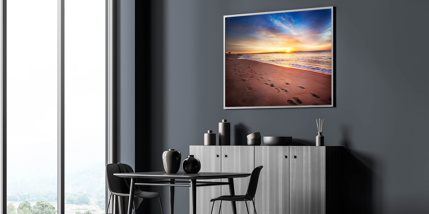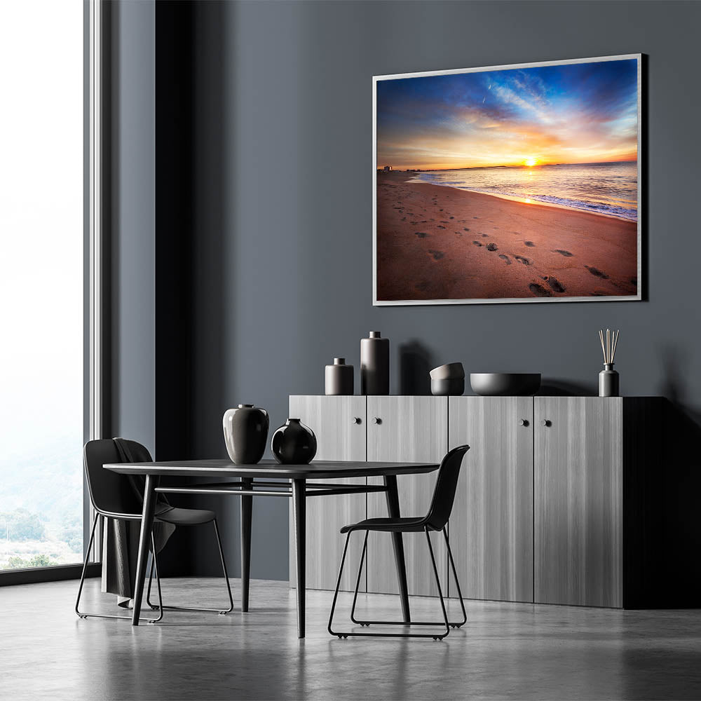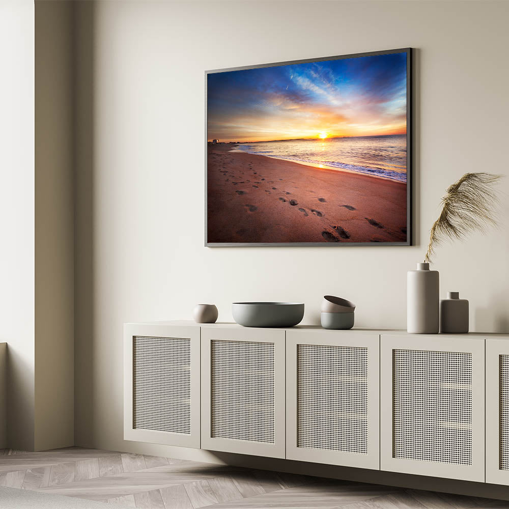- High-quality Wellington wall art showcasing a sunset beach scene with footprints.