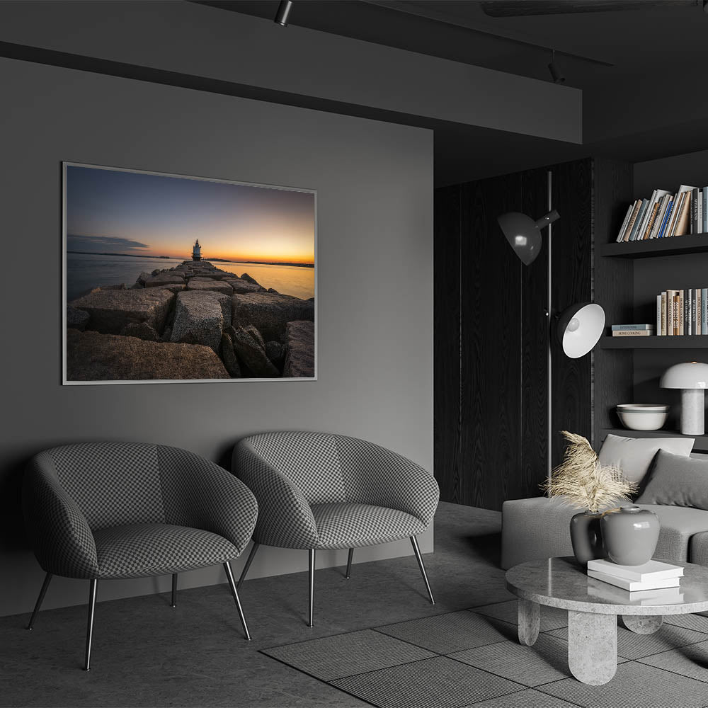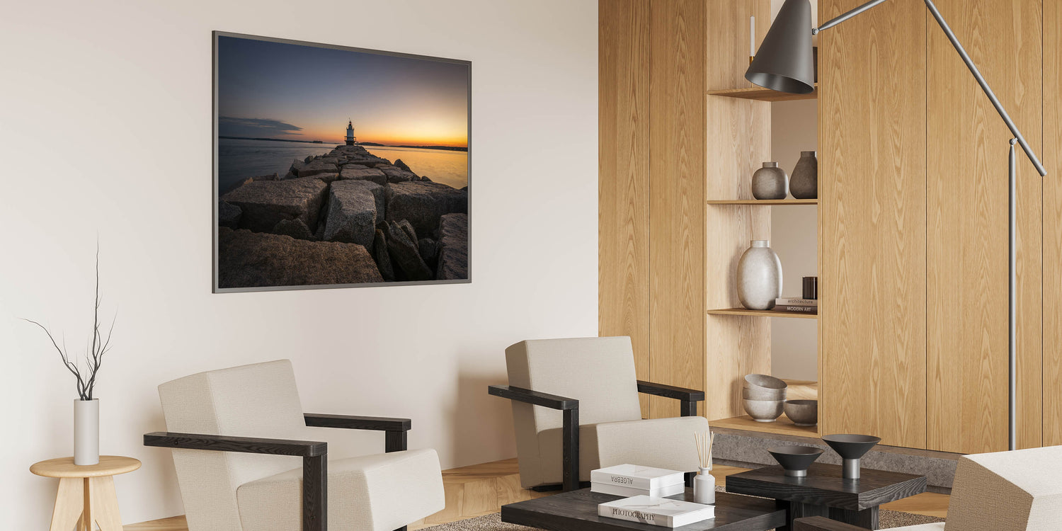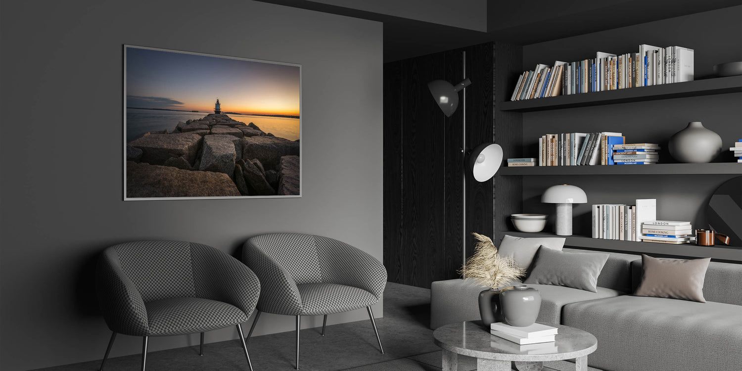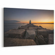 - High-quality Wellington wall art showcasing a lighthouse at sunset on a rocky shoreline.