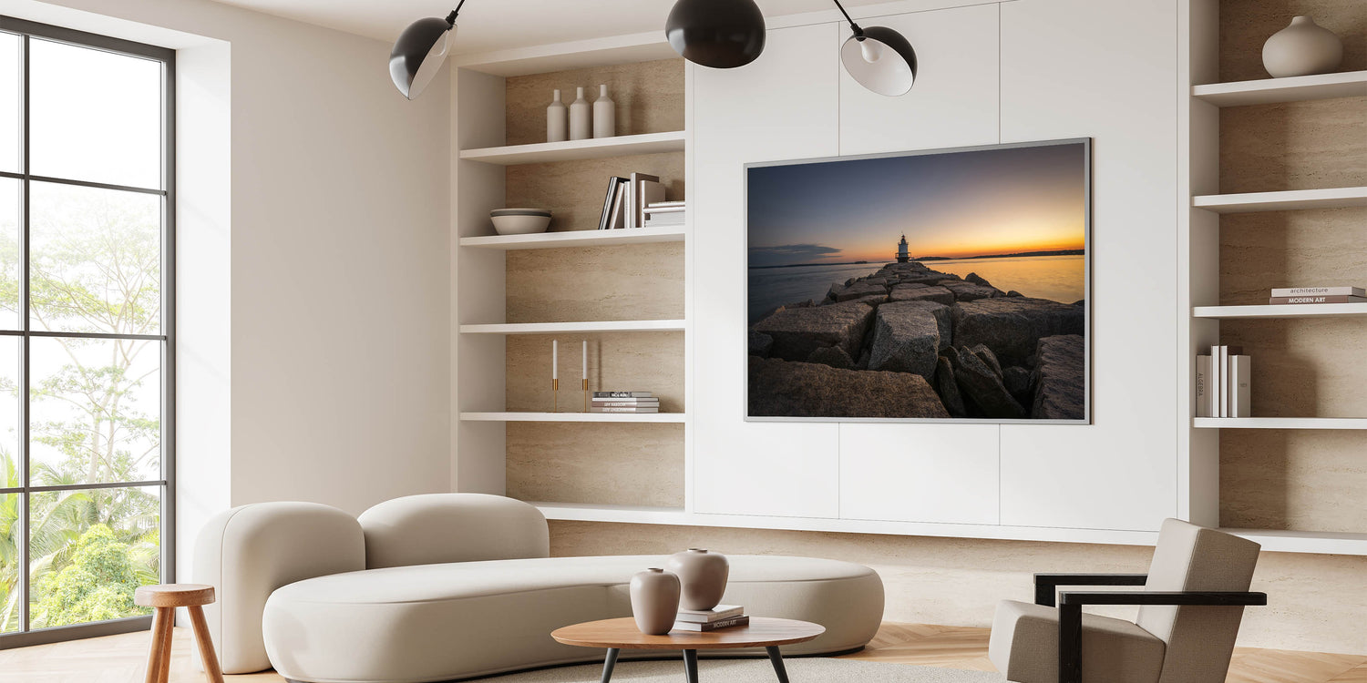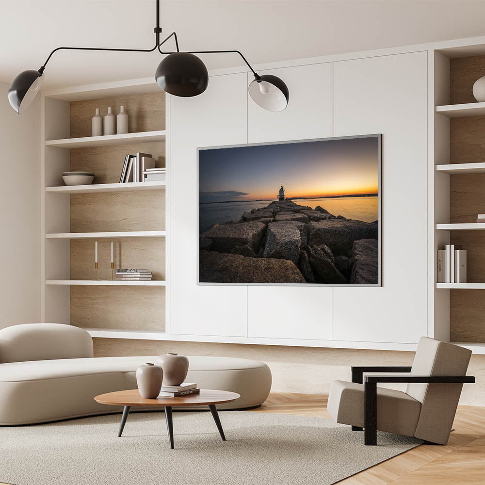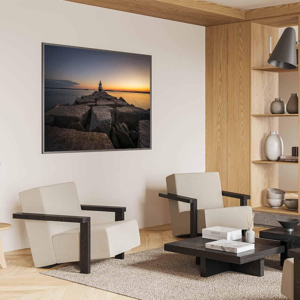 - High-quality Wellington wall art showcasing a lighthouse at sunset on a rocky shoreline.