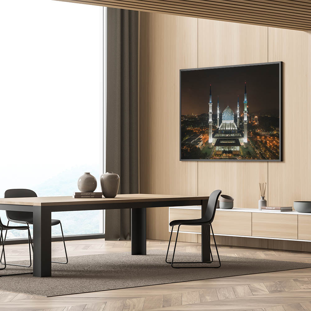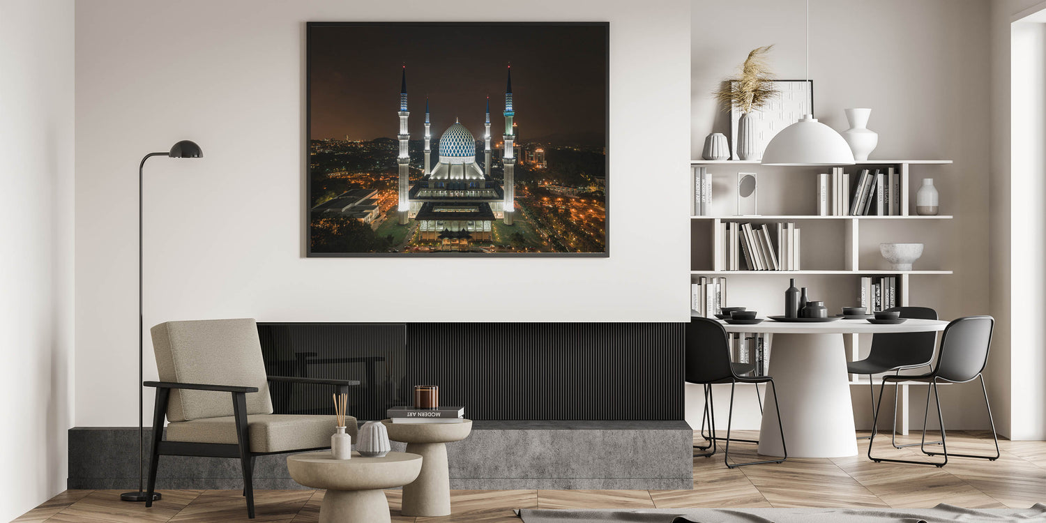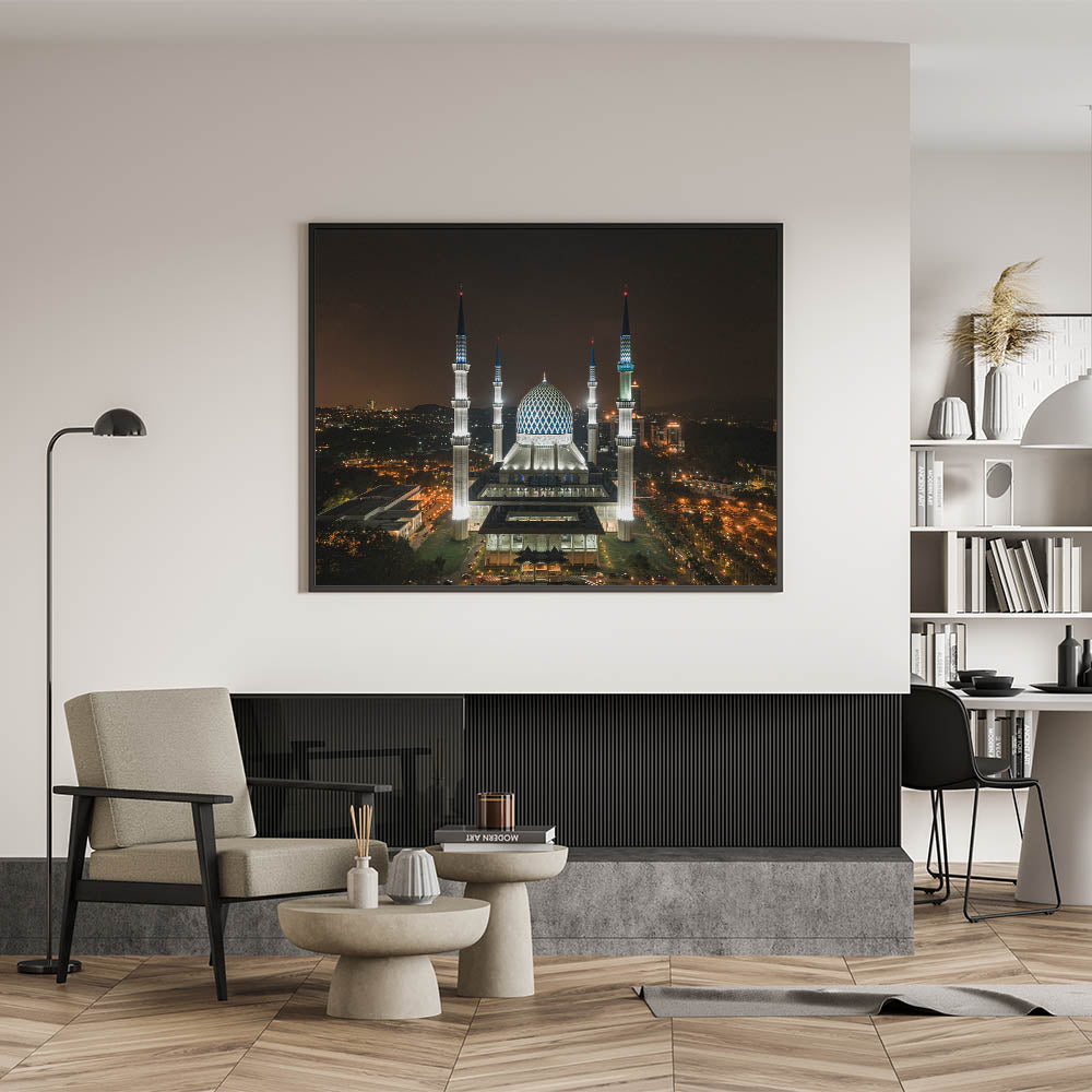 Perfect for those who appreciate architectural wonders and stunning night photography, this Malaysia art print will bring a touch of elegance and spiritual beauty to your living room, bedroom, or office. The glowing lights and peaceful ambiance make this artwork a captivating centerpiece for any room.
