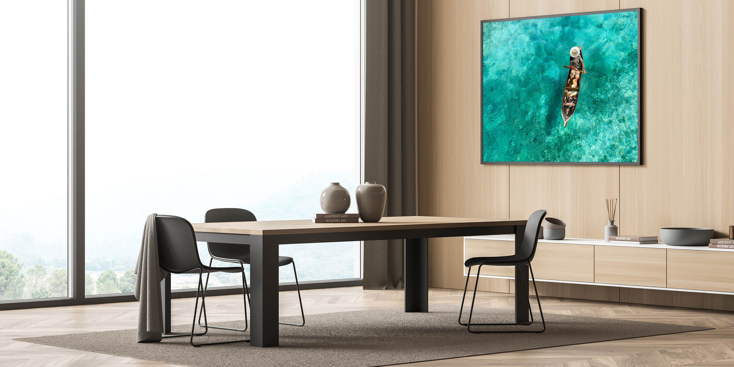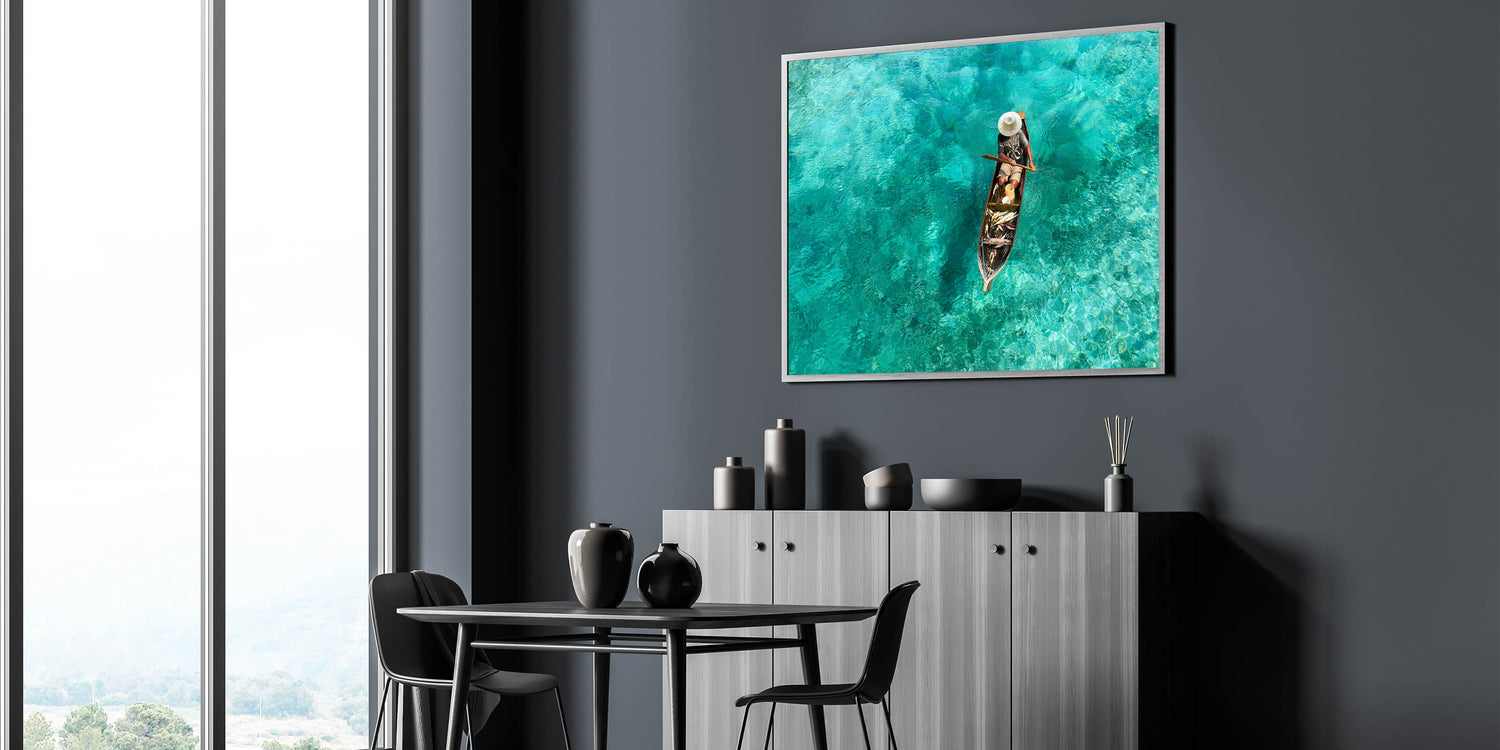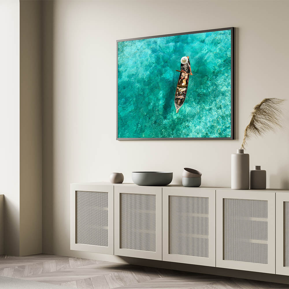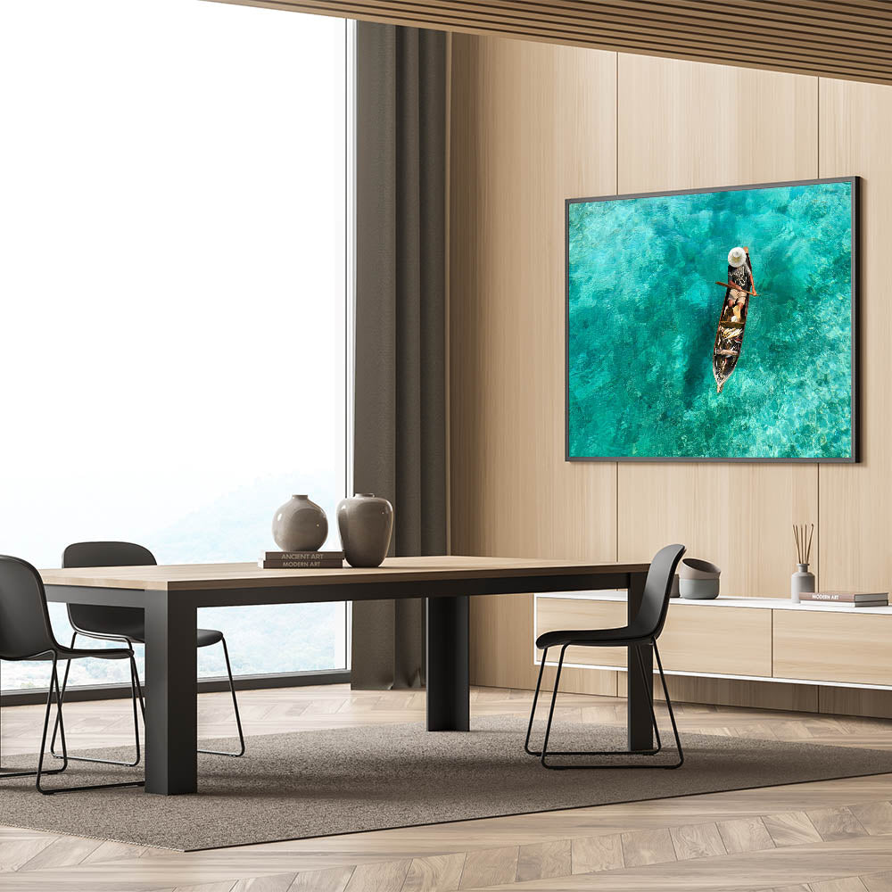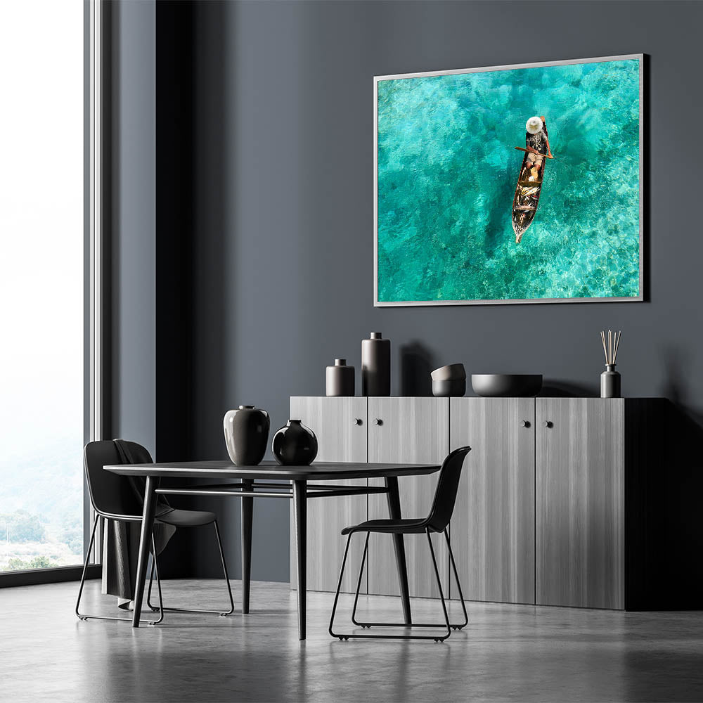 Capture the essence of Malaysia’s coastal traditions with this stunning Framed Malaysian Art. Featuring a traditional fisherman rowing his boat over crystal-clear turquoise waters, this artwork beautifully showcases the serene and pristine nature of Malaysia’s seas. The vivid blues and greens of the water create a calming atmosphere, while the fisherman’s simple presence adds a sense of authenticity and cultural depth.
